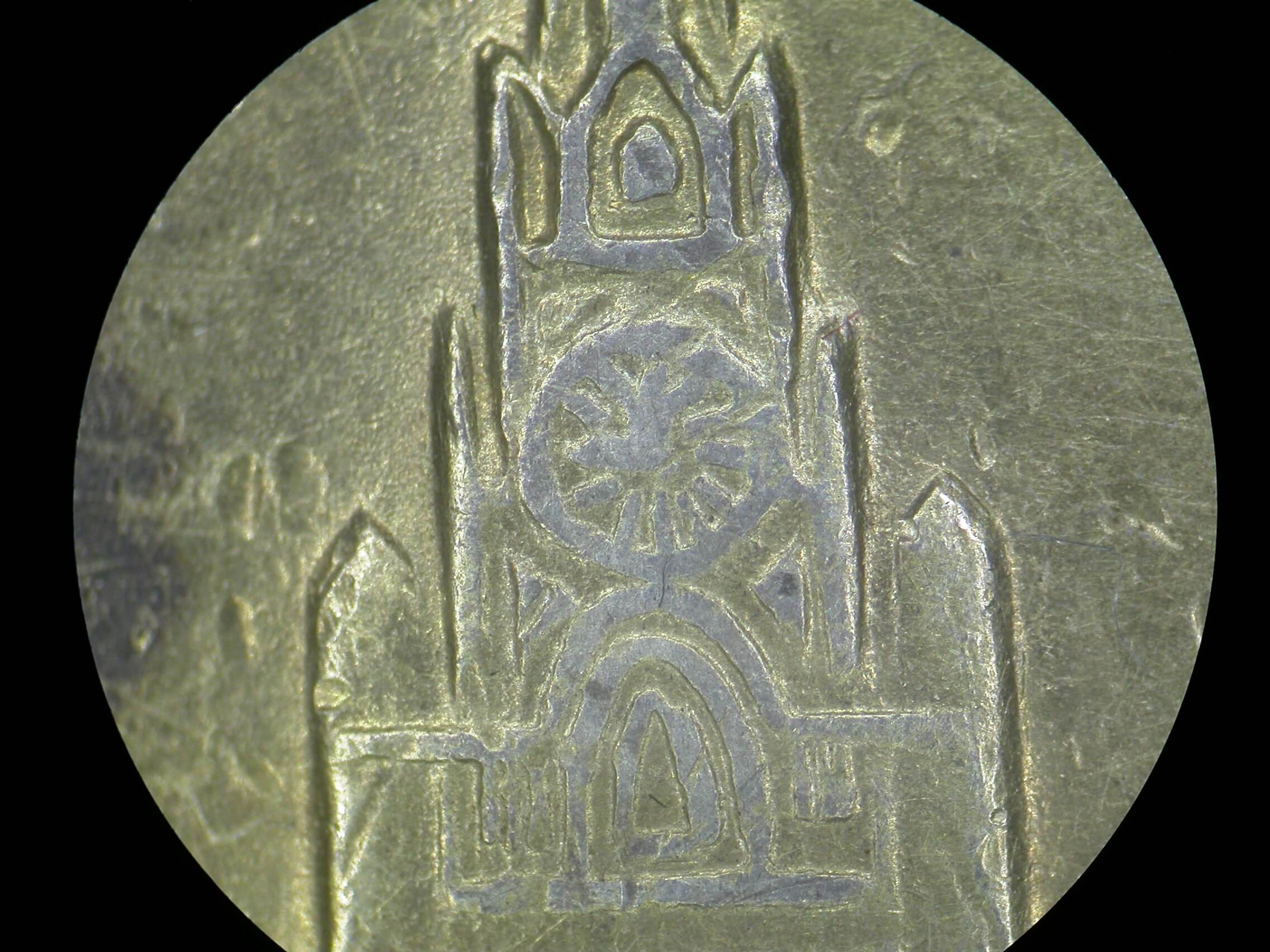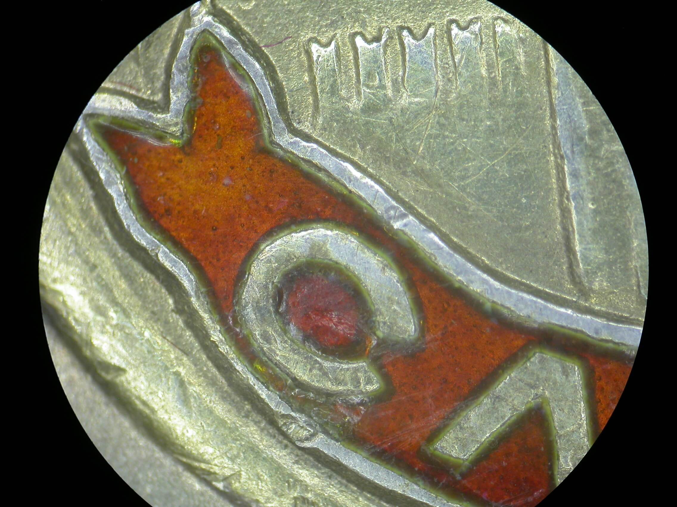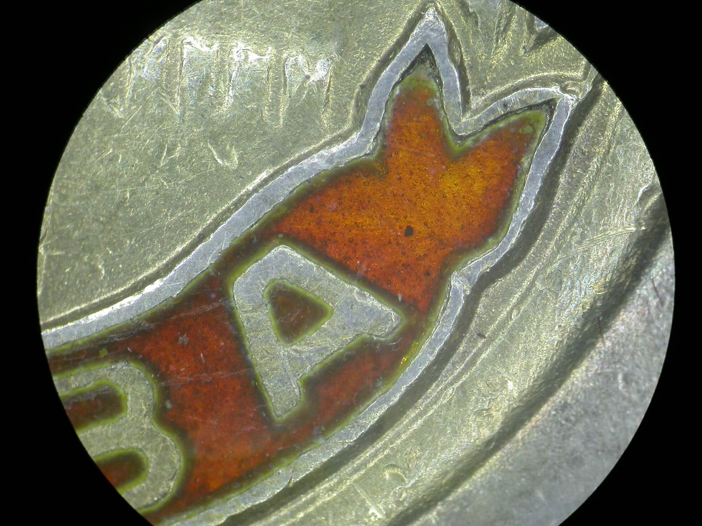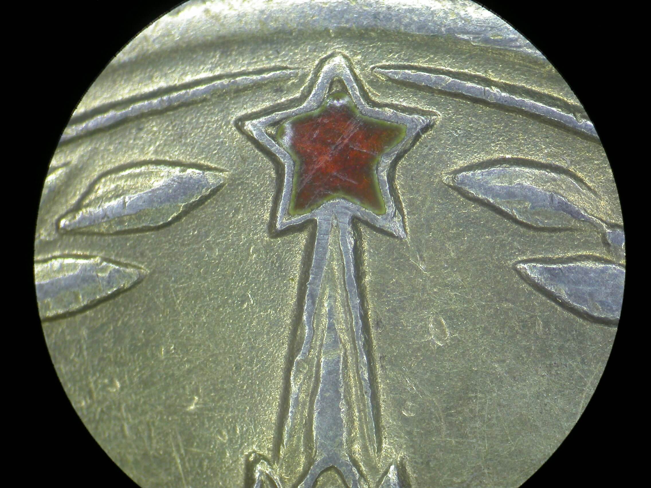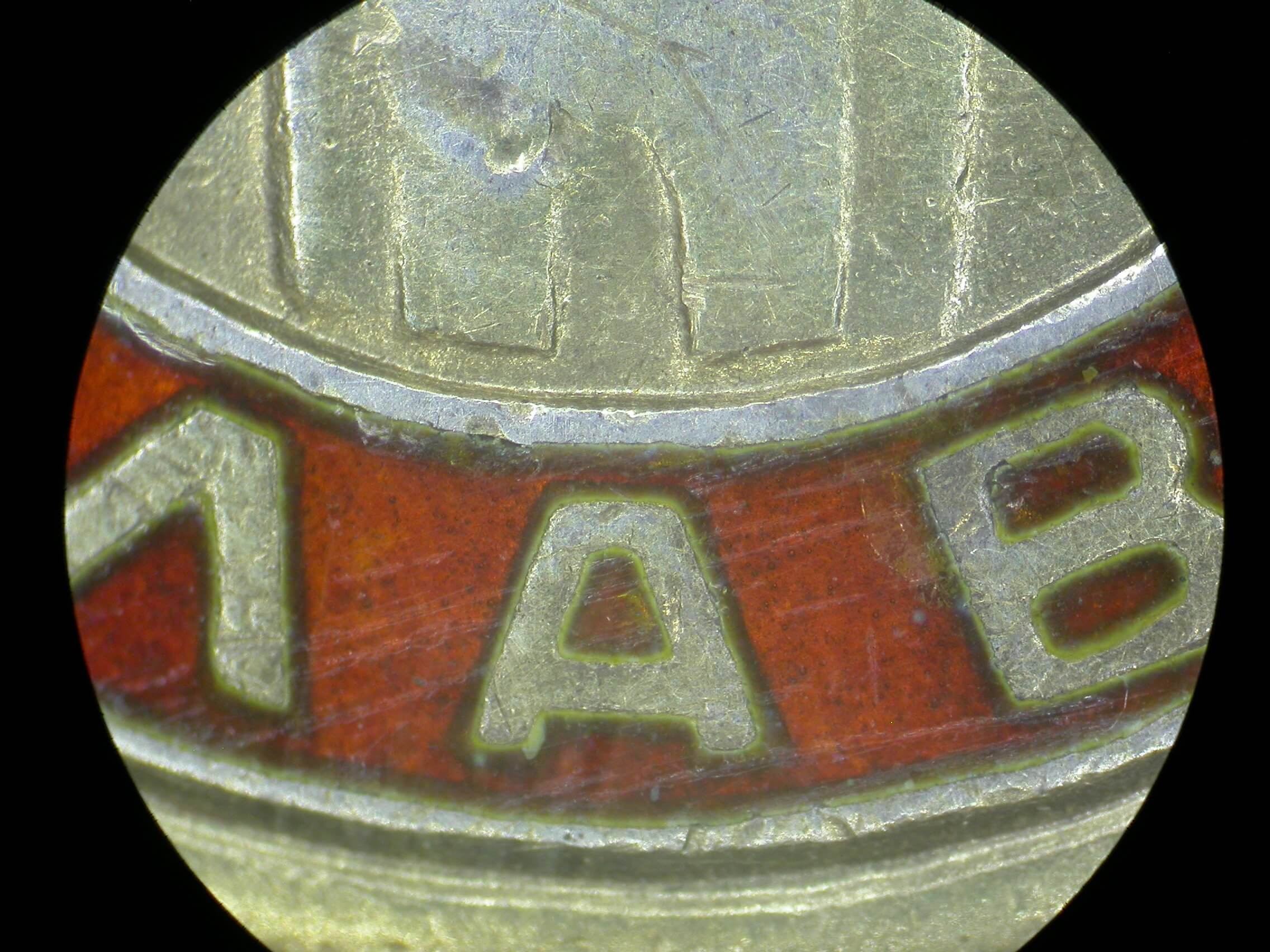 Made of silver and enamels. Measures 45.82 mm in width, 48.07 mm in height and weighs 23.4 grams without its suspension. The serial number is located on top of its reverse.