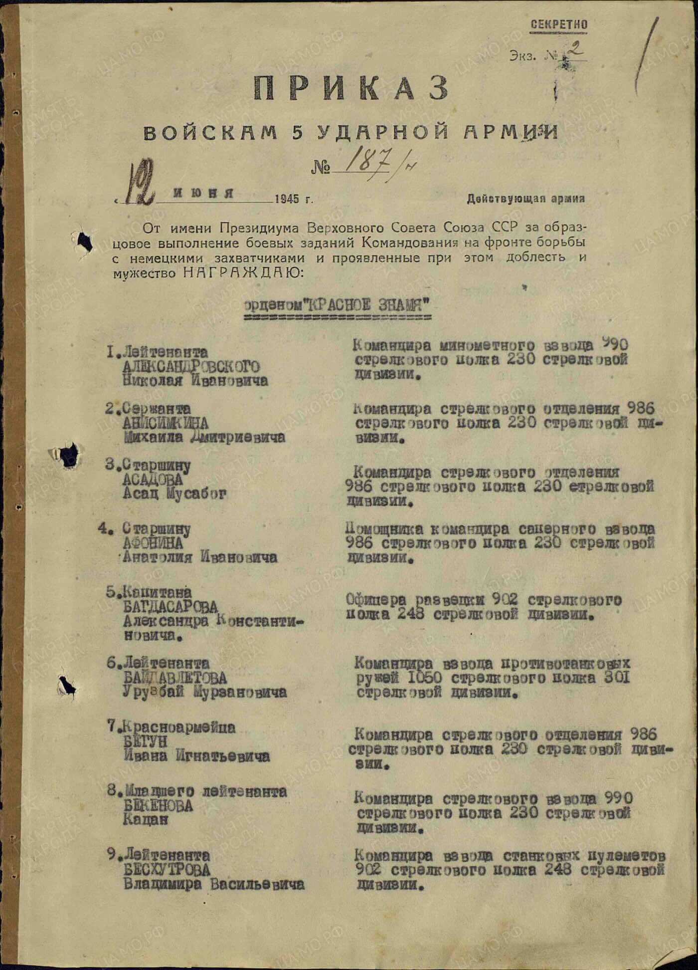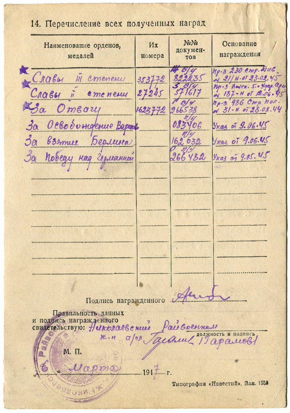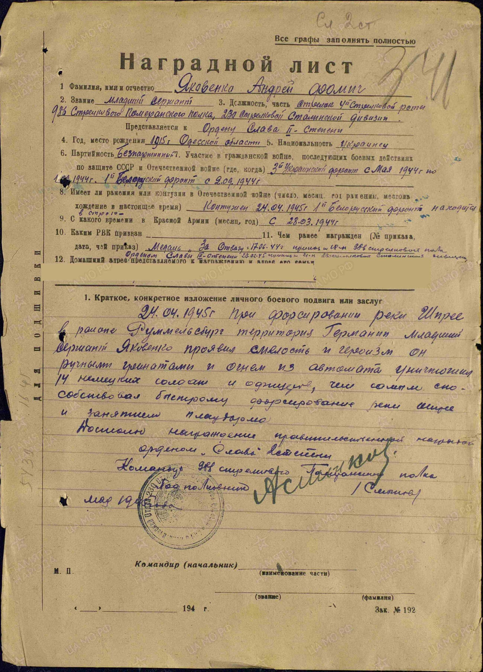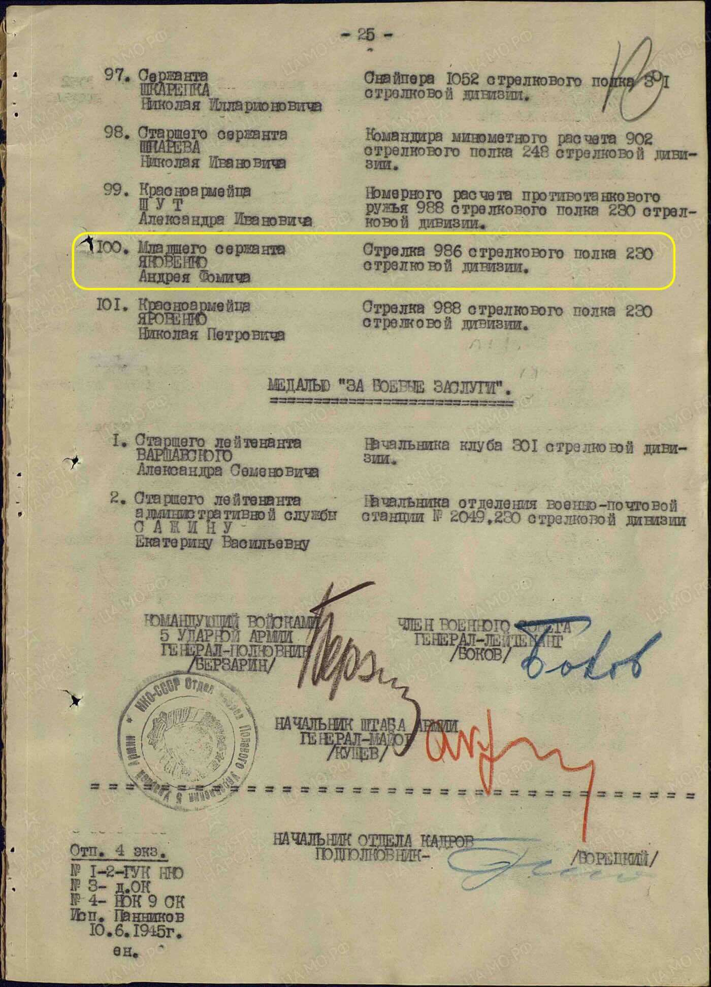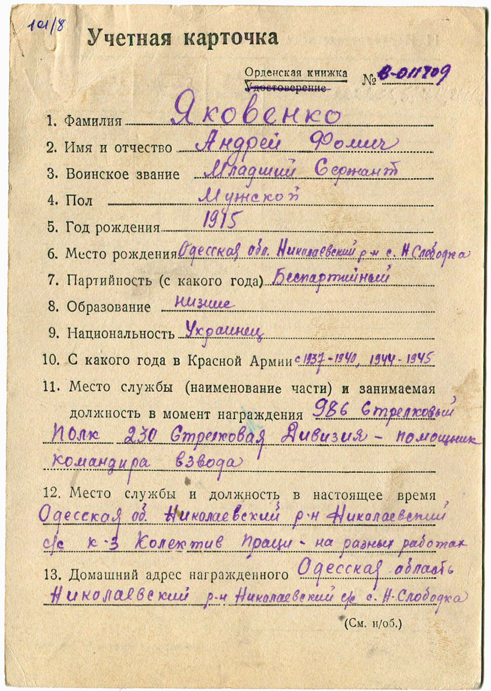 Awarded Jr. Sergeant Andrej Fomich Yakovenko (Андрей Фомич Яковенко)
