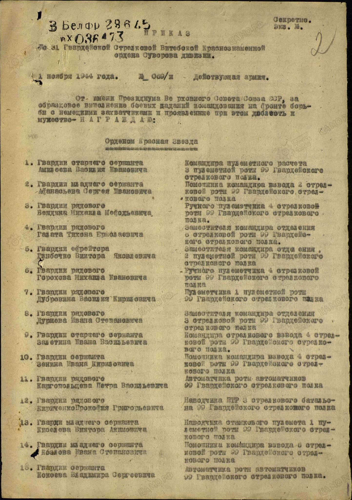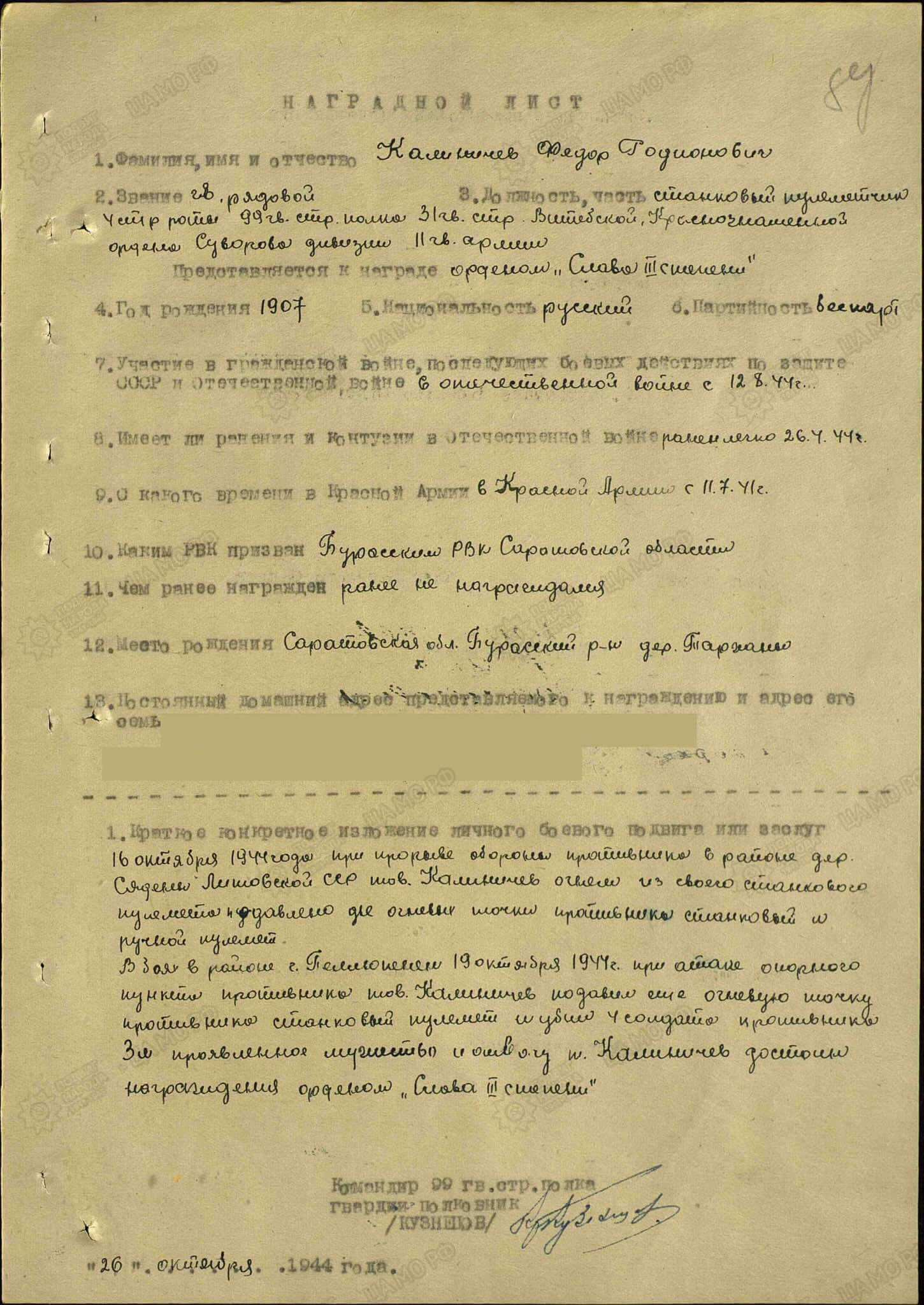 16 October 1944, in an enemy defence breakthrough operation in the area near the village Sadeni (Lithuanian Soviet Socialist republic), comrade KALINICHEV’s machine-gun fire suppressed 2 enemy firing positions: a heavy and a light machine-guns.