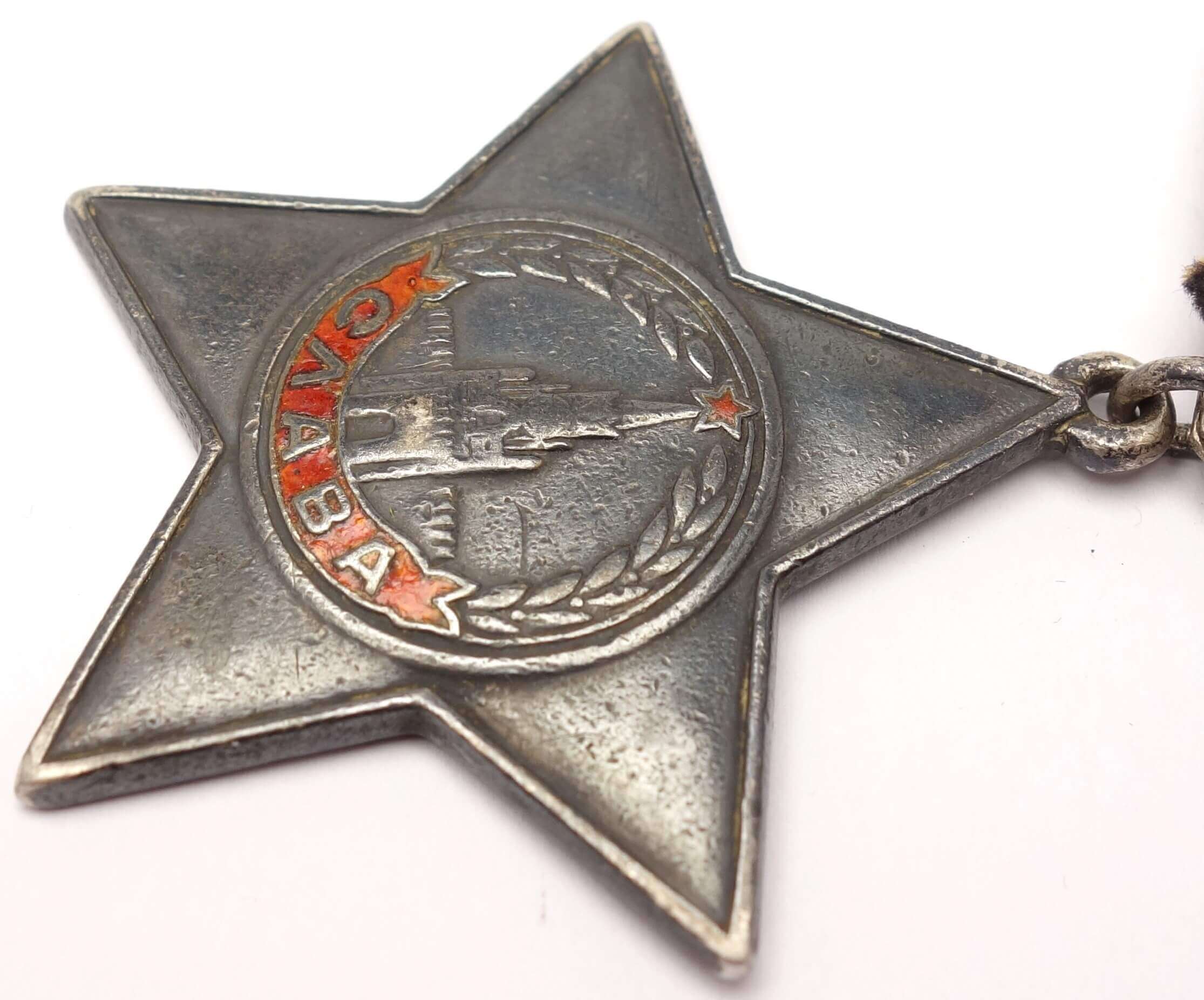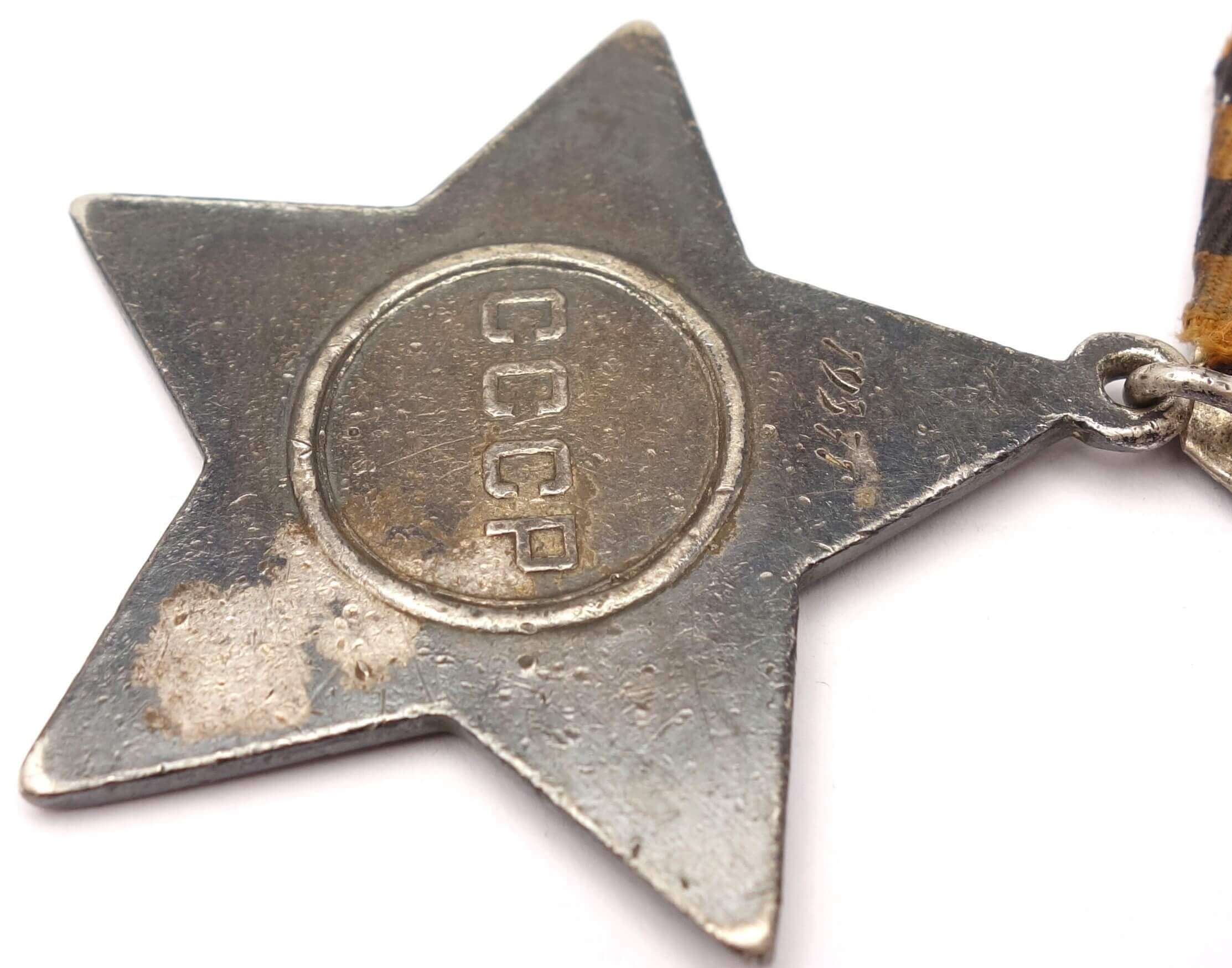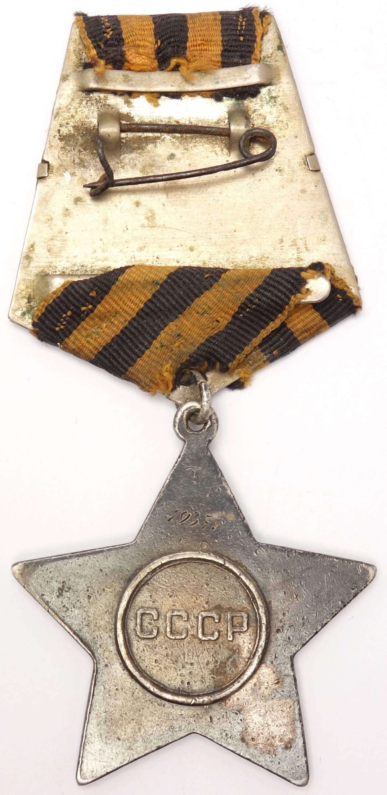 In nice condition considering its an early, low numbered piece. A fair amount of detail is still visible although the raised areas show moderate wear. Both sides have numerous small dings and scratches and the enamels are all original with some superficial chipping only. Its connection ring has been cut and its double layer steel suspension and ribbon are time period to the order.