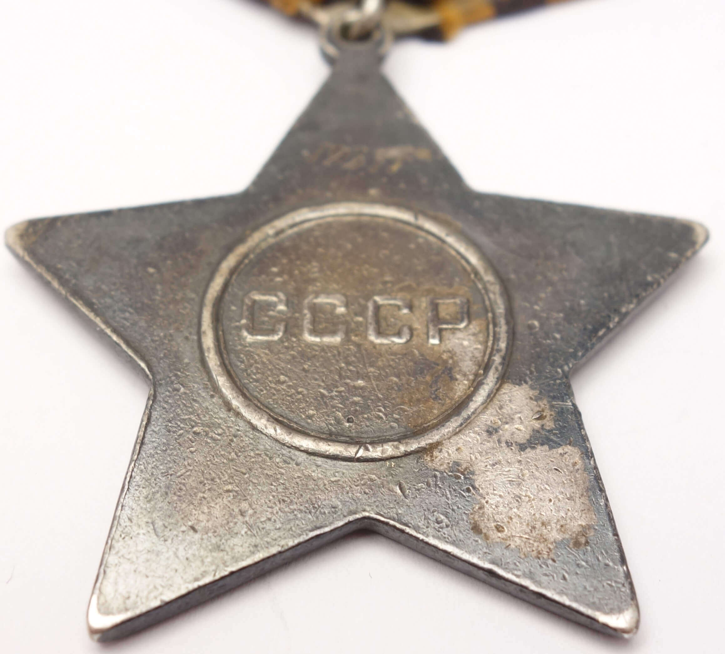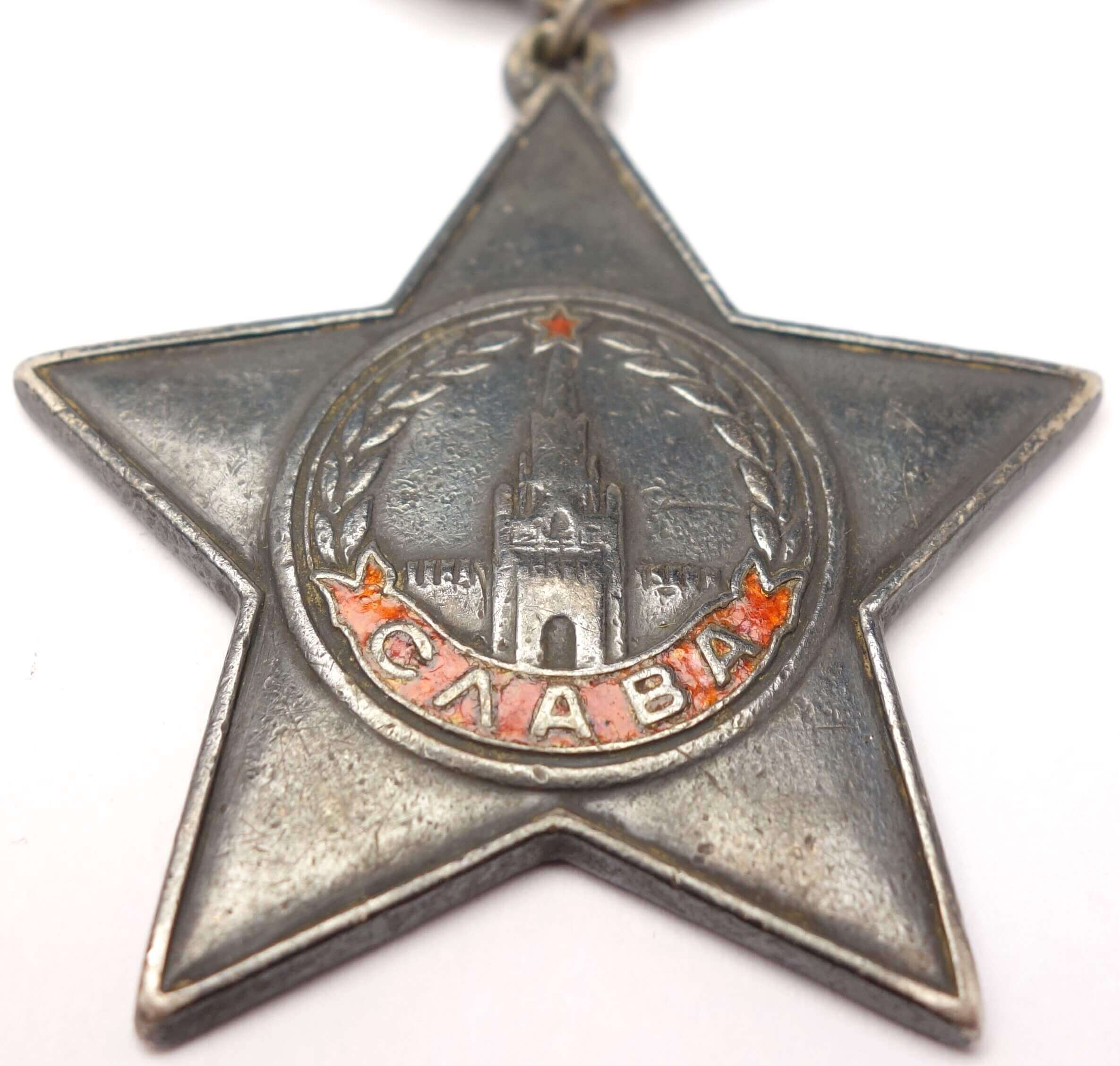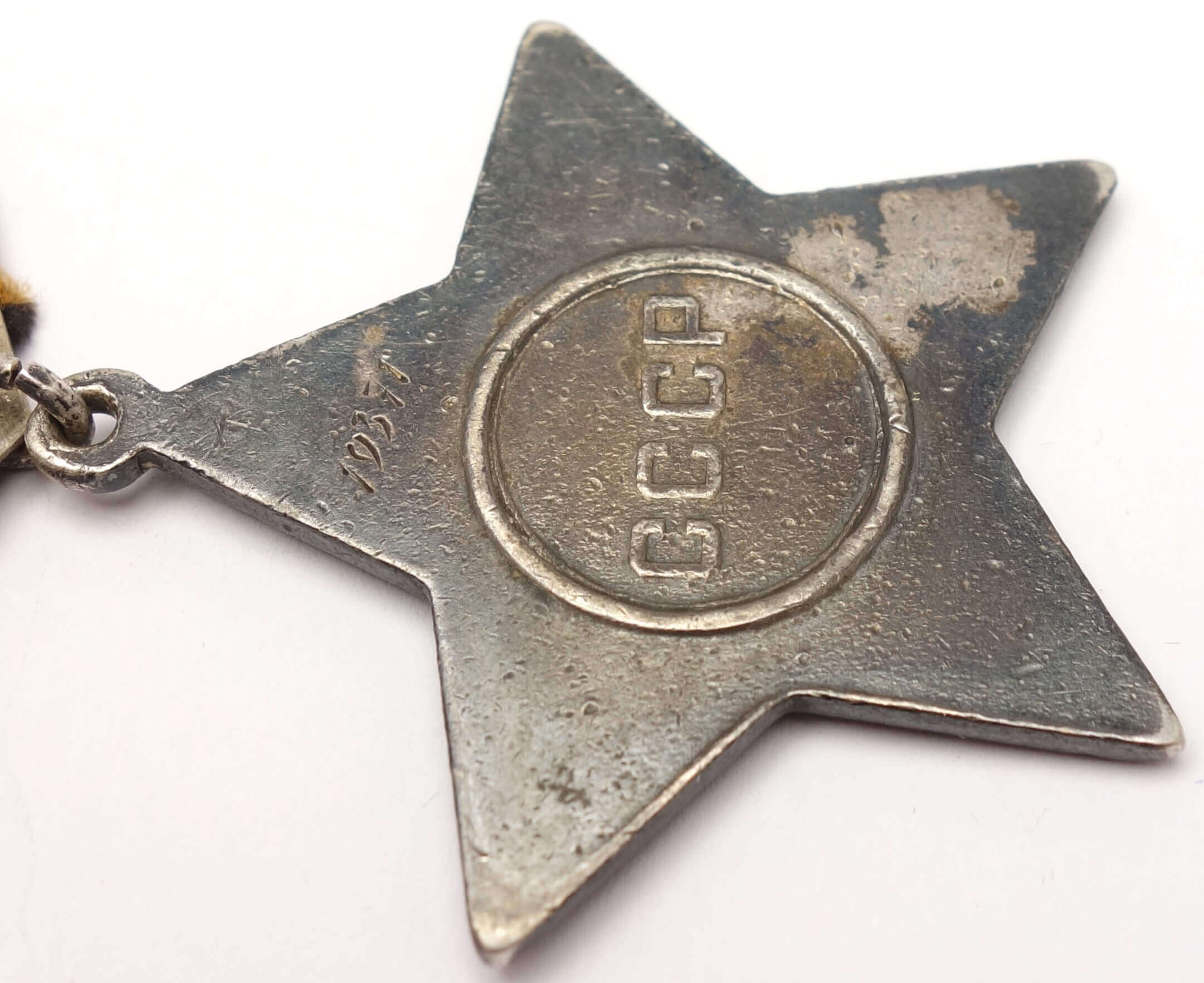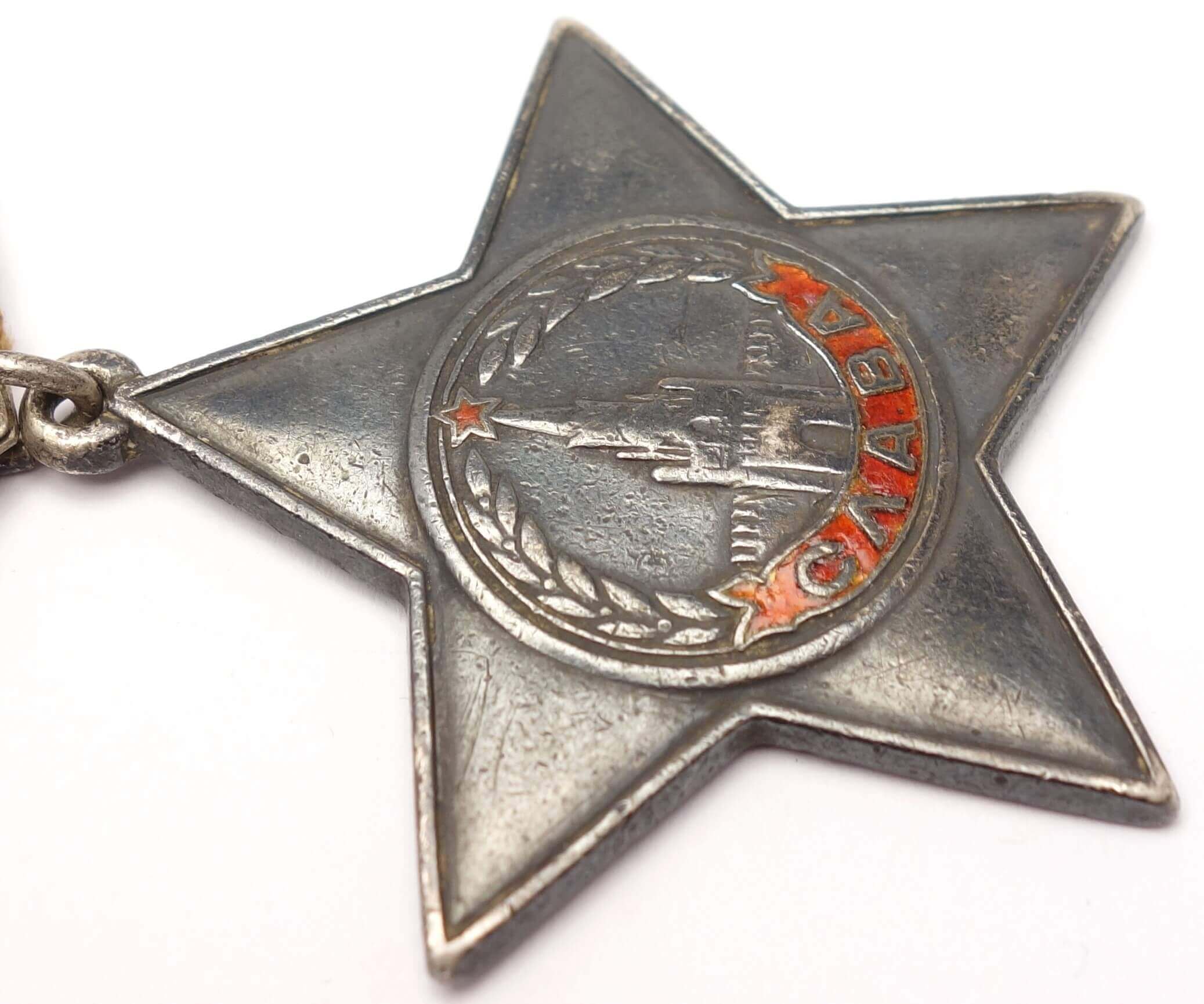 In nice condition considering its an early, low numbered piece. A fair amount of detail is still visible although the raised areas show moderate wear. Both sides have numerous small dings and scratches and the enamels are all original with some superficial chipping only. Its connection ring has been cut and its double layer steel suspension and ribbon are time period to the order.