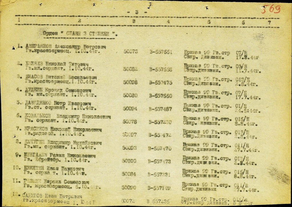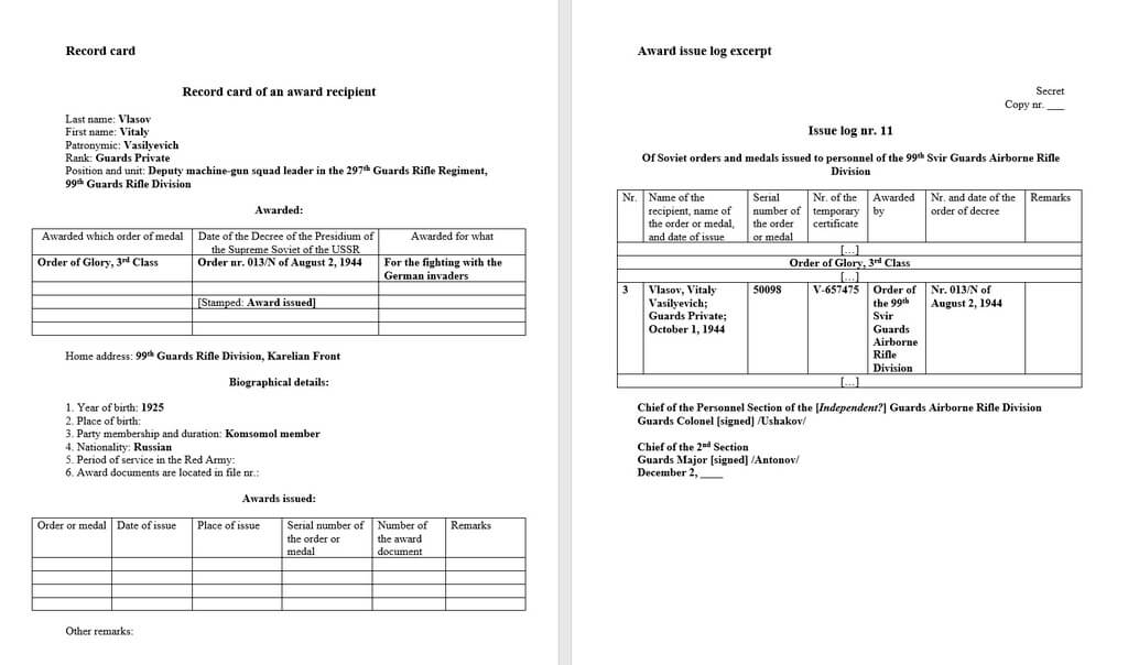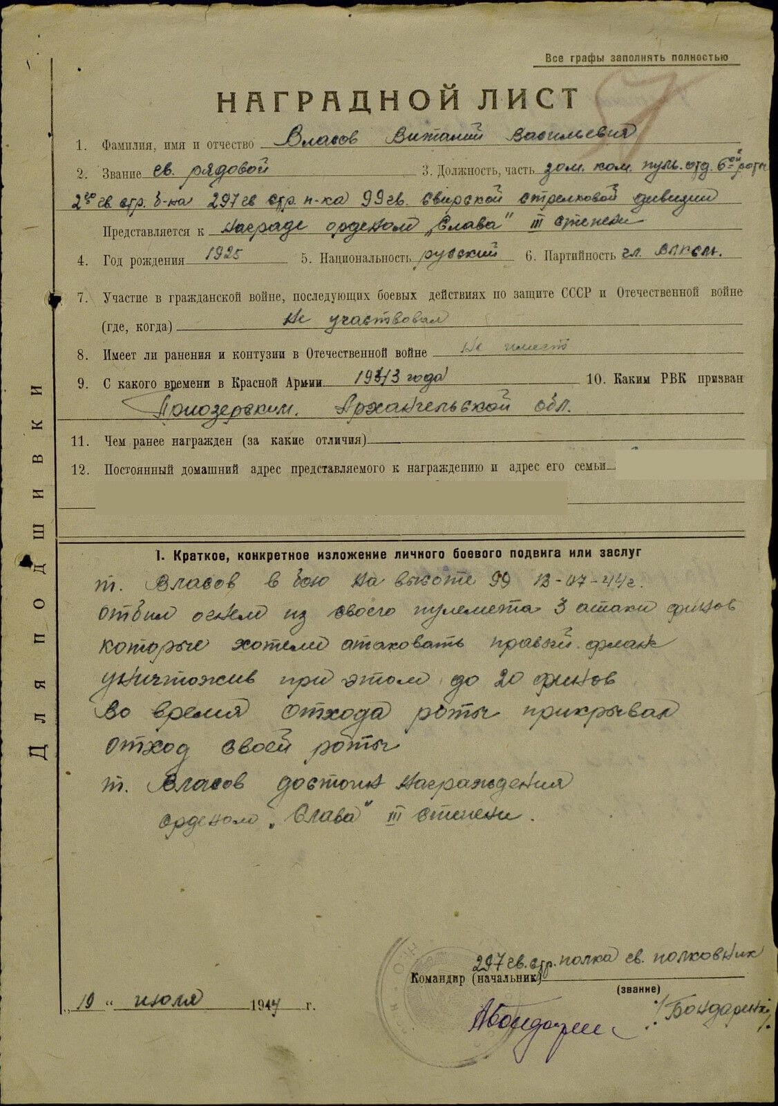 Awarded to Private Vitaliy Vasilievich Vlasov (Виталий Васильевич Власов)