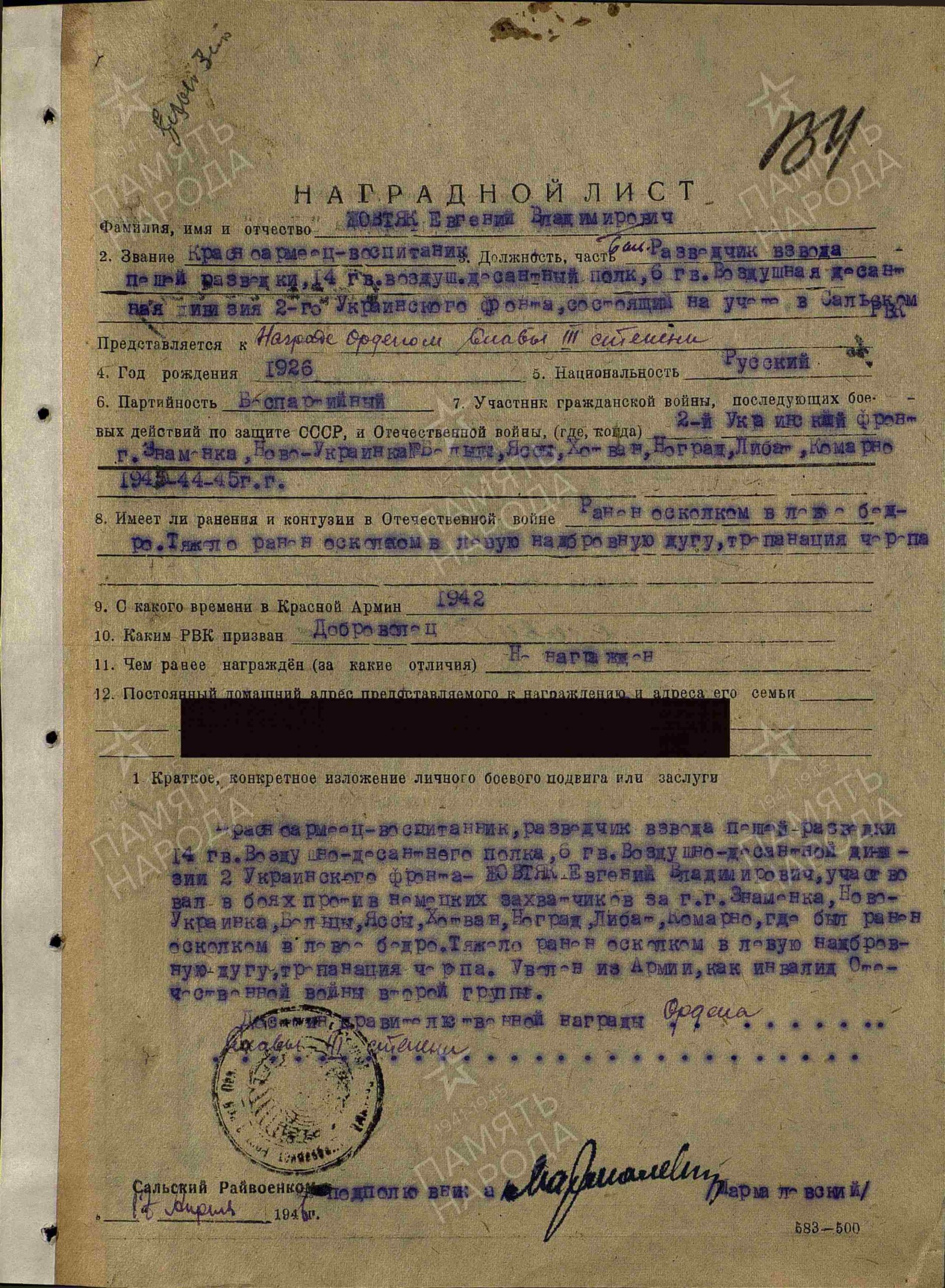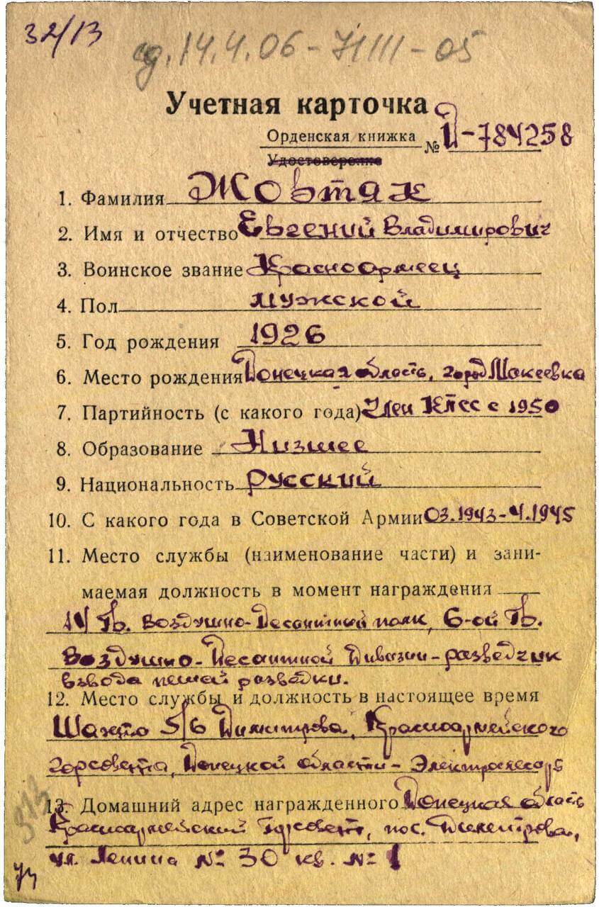 Red Army soldier-instructor, reconnaissance platoon leader of the 14th Guards Airborne Rifle Regiment, 6th Guards Airborne Division, 2nd Ukrainian Front, Zhovtyak, Evgeny Vladimirovich took part in battles against the German invaders at Znamenka, Novo-Ukrainka, Yassi, Khotvan, Libat, Komarno, where he was wounded by shrapnel in the left thigh and repeatedly wounded by shrapnel in the left forearm, sustaining a concussion. He continued to serve in the ranks of the Red Army and proved himself in battles of the Great Patriotic War on the 2nd Ukrainian Front.