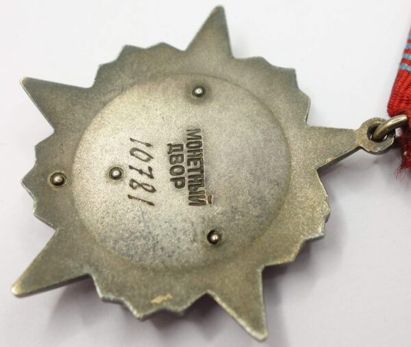This order is in excellent condition, featuring flawless enamel and minimal wear on both sides. The details are sharp, and the silver has developed a dark patina. The separately attached hammer and sickle are authentic, with no repairs. The connection ring is intact, and the double-layer suspension is correct and time priod.