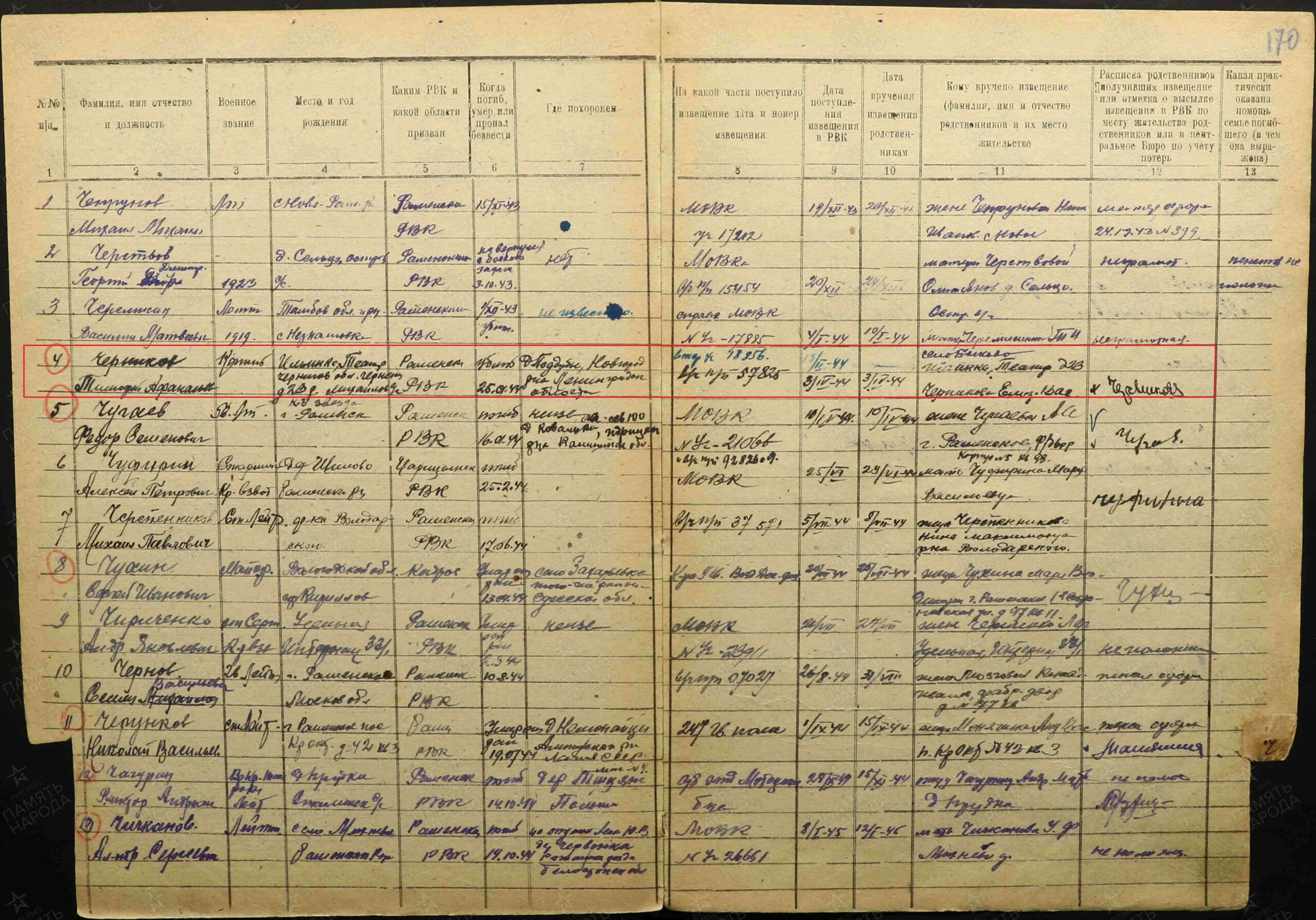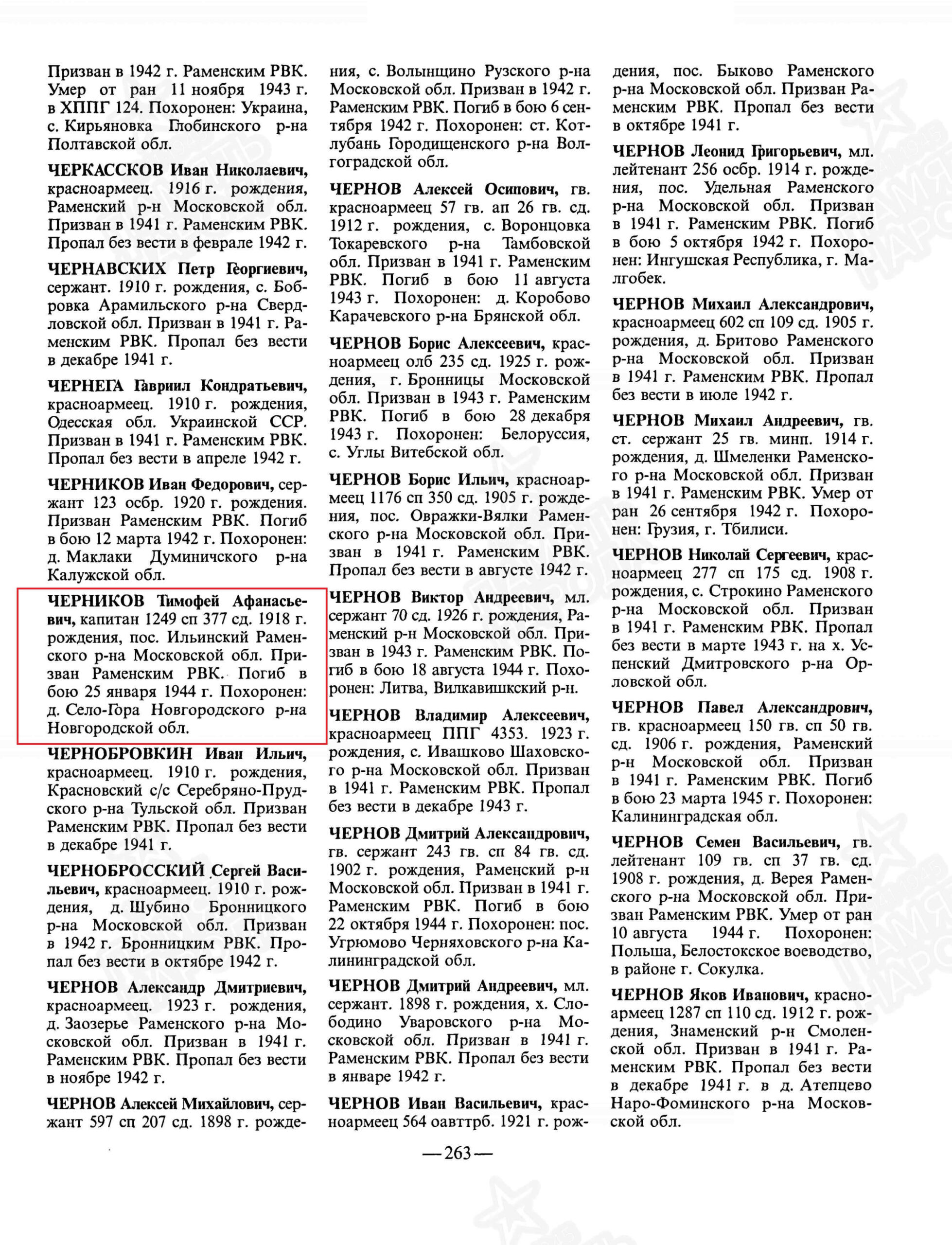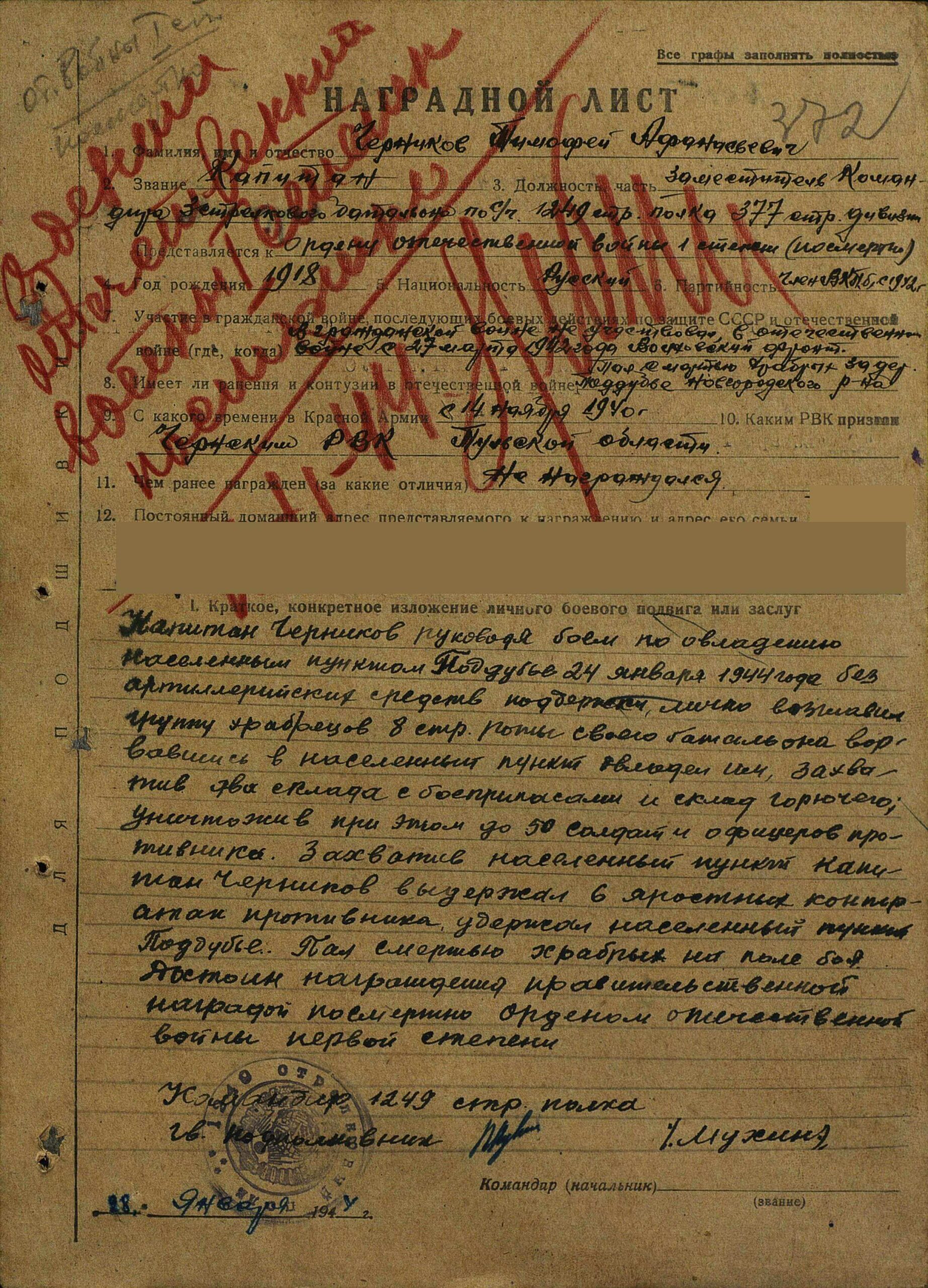 Overseeing the operation to capture the town of Poddubye on January 24, 1944 without artillery support, Captain Chernikov personally headed a group of brave men from his battalion’s 8th Rifle Company. Having rushed into the town, he was able to seize it and capture two ammunition dumps and a fuel depot, killing as many as 50 enemy soldiers and officers in the process. Having captured the town, Captain Chernikov withstood fierce enemy counterattacks and managed to hold the town of Poddubye. He died a brave death on the battlefield.