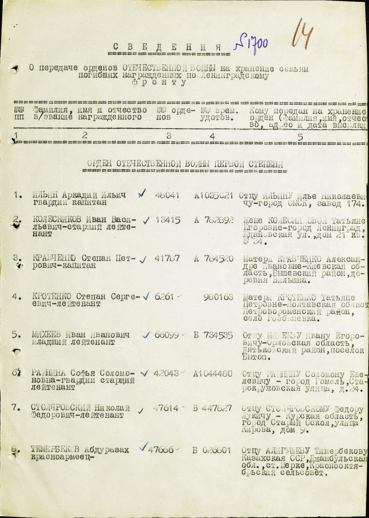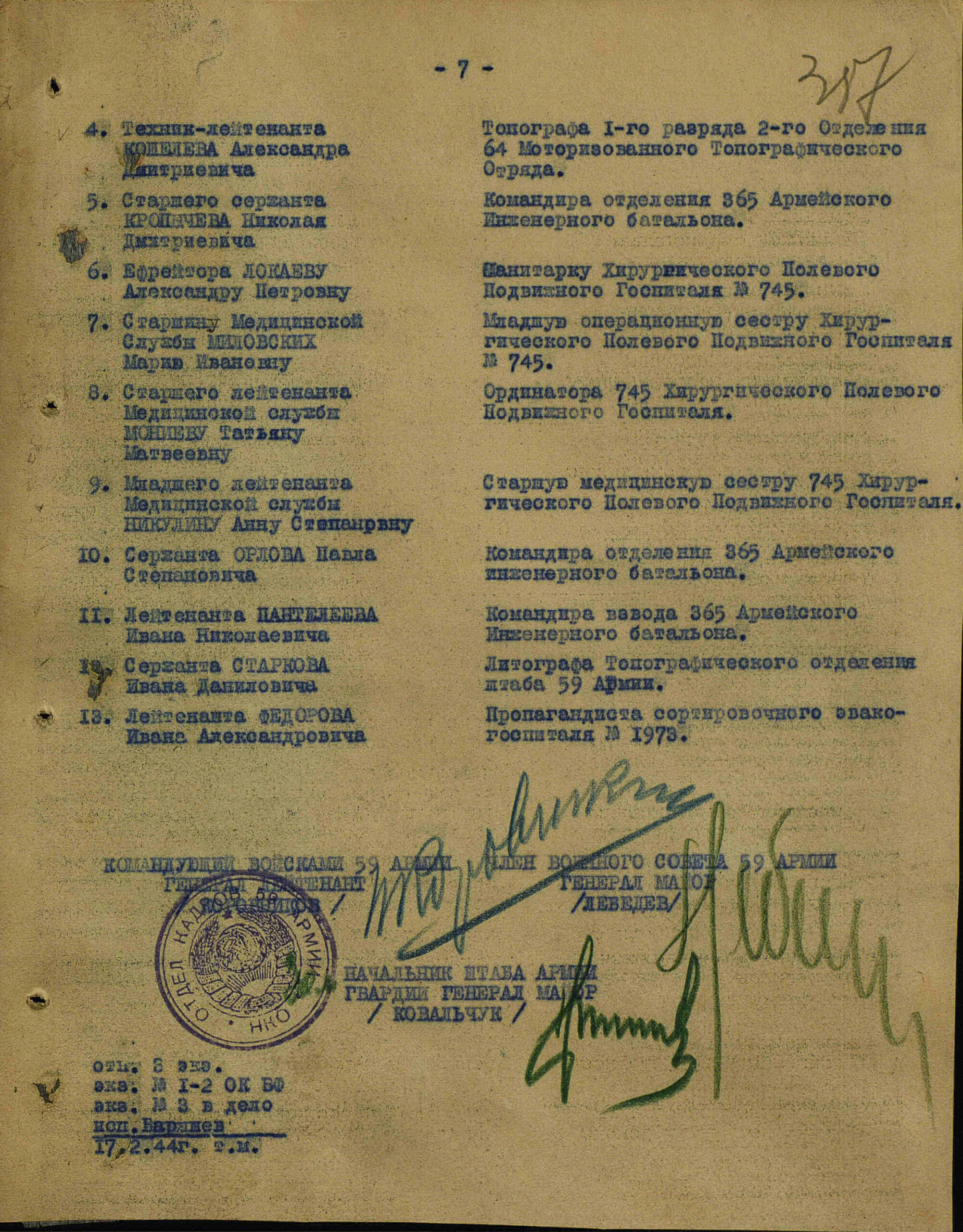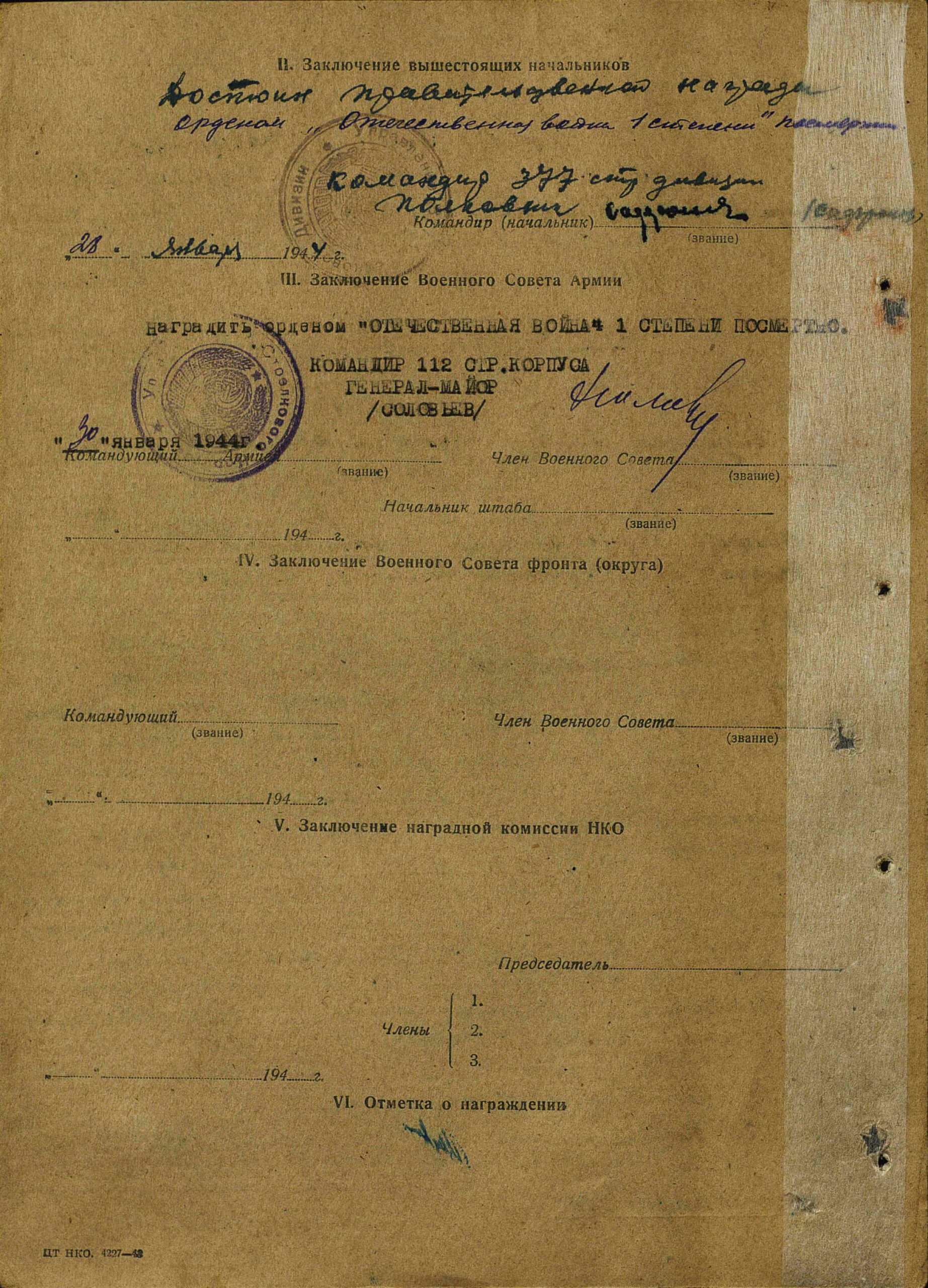 Overseeing the operation to capture the town of Poddubye on January 24, 1944 without artillery support, Captain Chernikov personally headed a group of brave men from his battalion’s 8th Rifle Company. Having rushed into the town, he was able to seize it and capture two ammunition dumps and a fuel depot, killing as many as 50 enemy soldiers and officers in the process. Having captured the town, Captain Chernikov withstood fierce enemy counterattacks and managed to hold the town of Poddubye. He died a brave death on the battlefield.