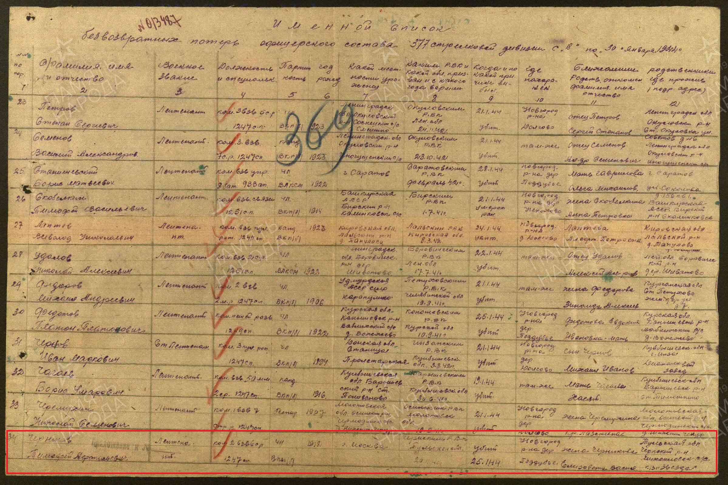 For personally leading an assault without artillery support, seizing the town Poddubye [Leningrad front], capturing two ammunition dumps and a fuel depot, eliminating up to 50 enemy soldiers and officers, and holding the town against fierce counterattacks, where he fell a brave death on the battlefield