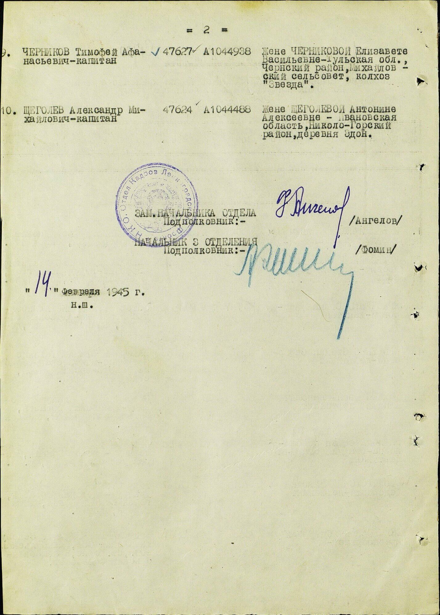 Awarded posthumously to Captain Timofei Afanasyevich Chernikov (Тимофей Афанасьевич Черников)