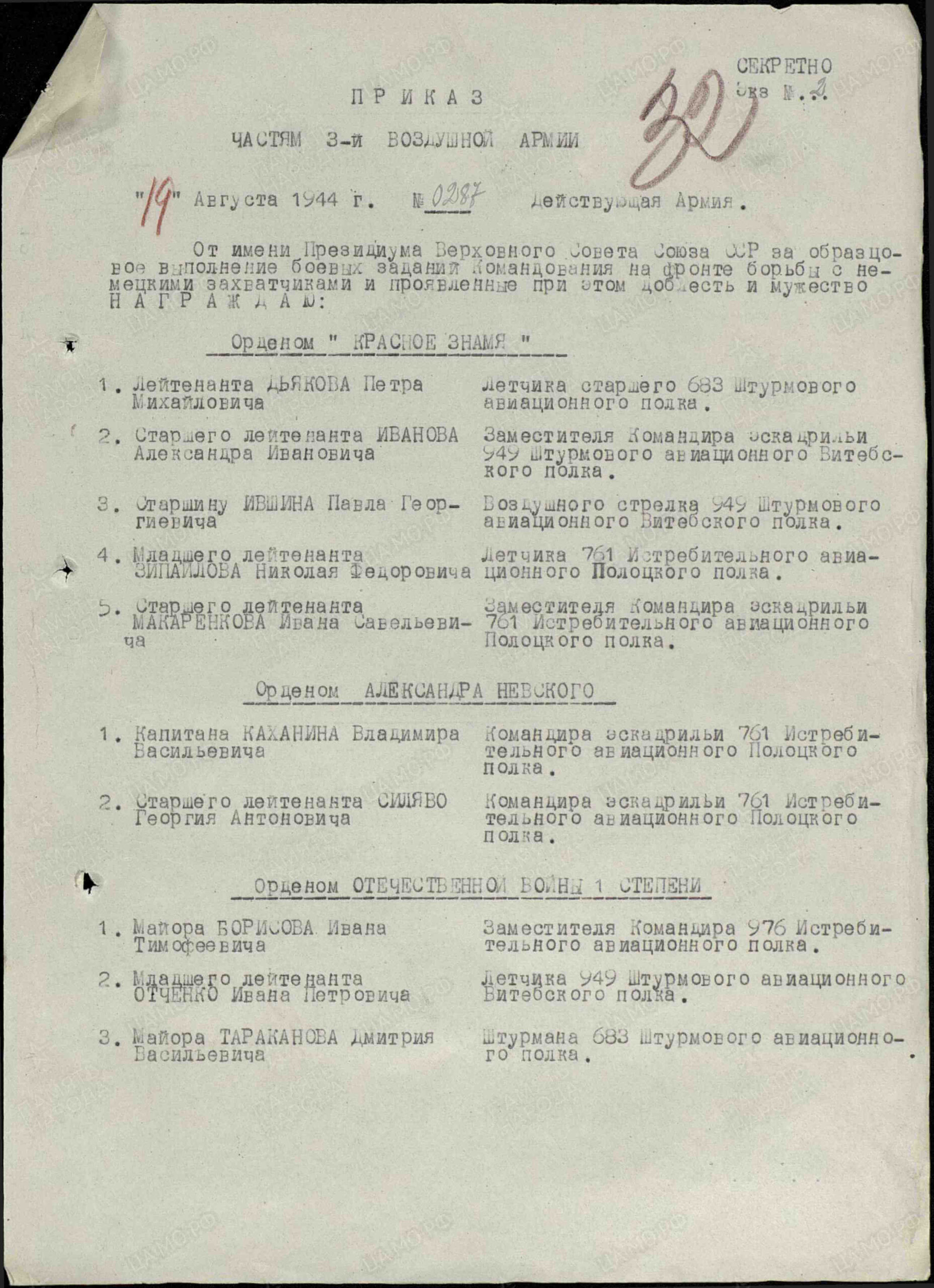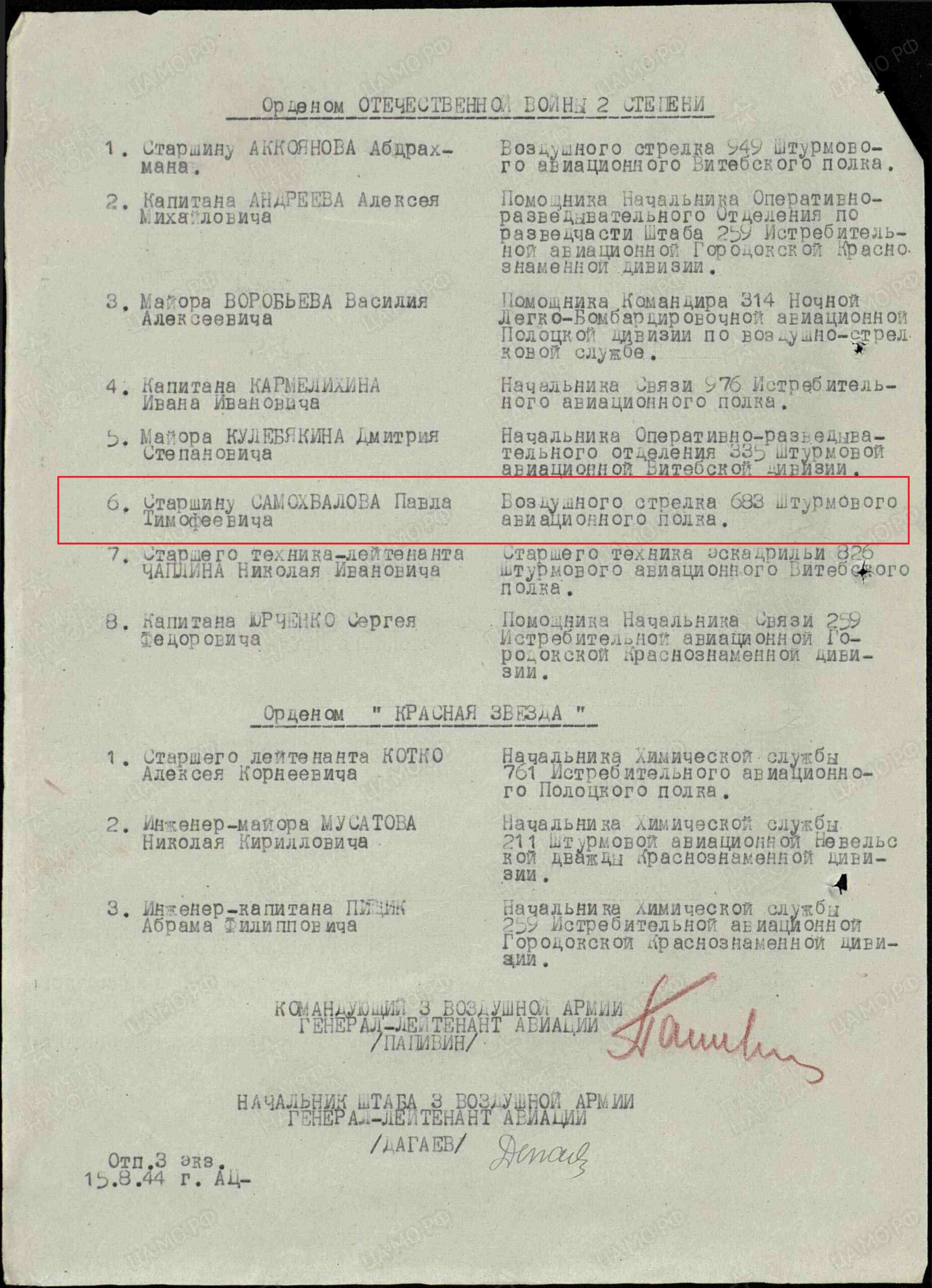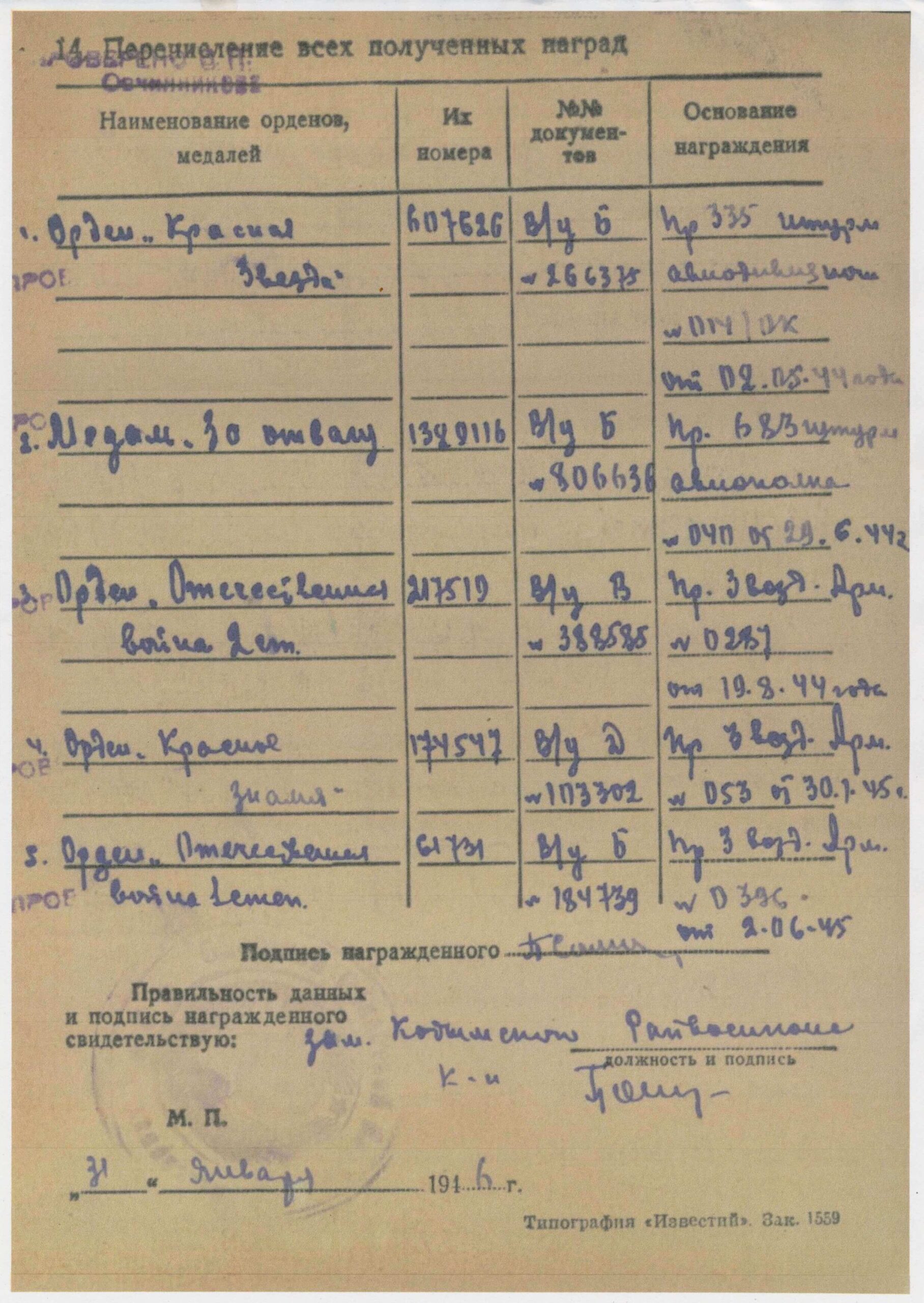 For his active participation and 20 successful combat sorties, he is deemed worthy of the Order of the Patriotic War, 2nd Class.