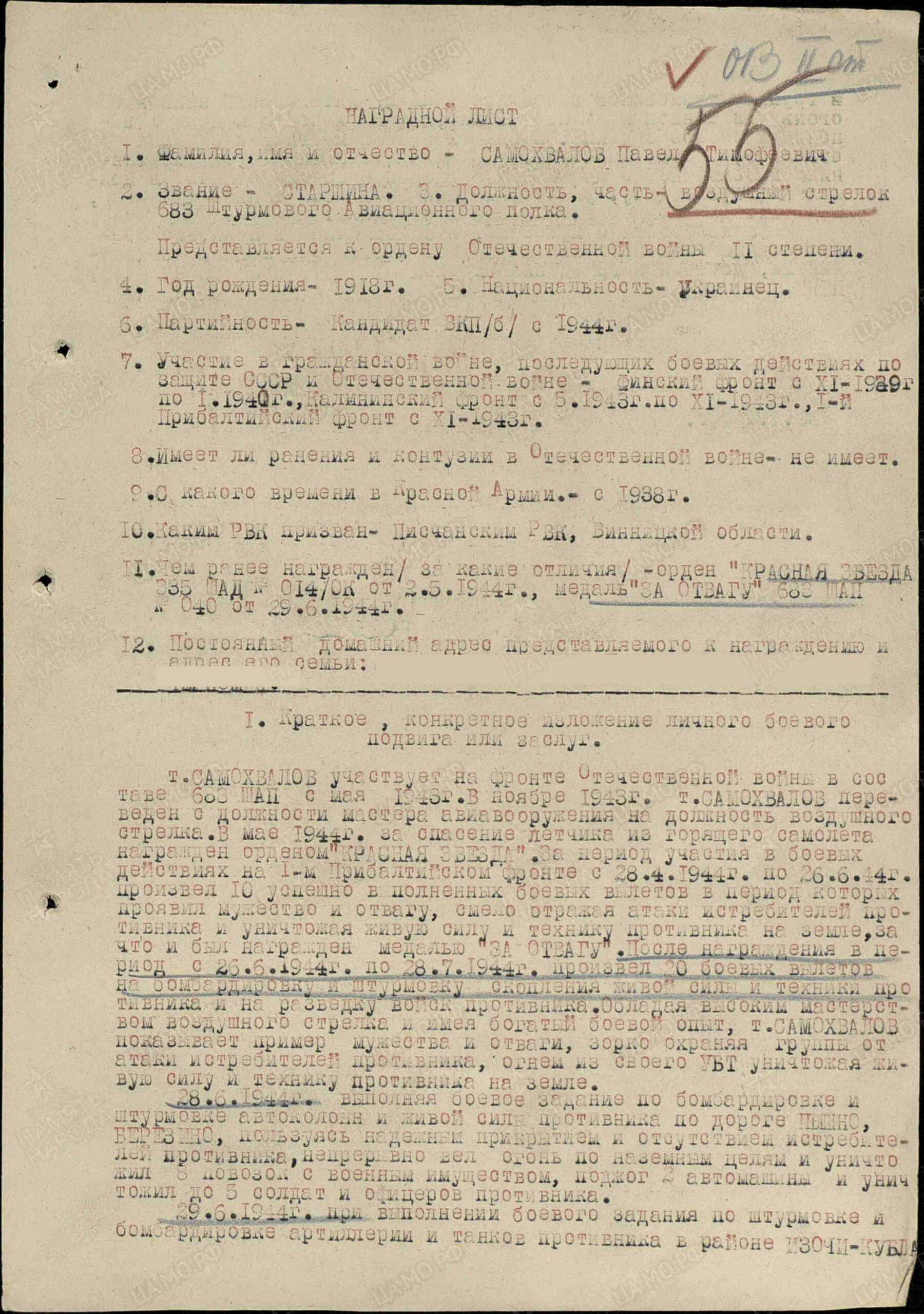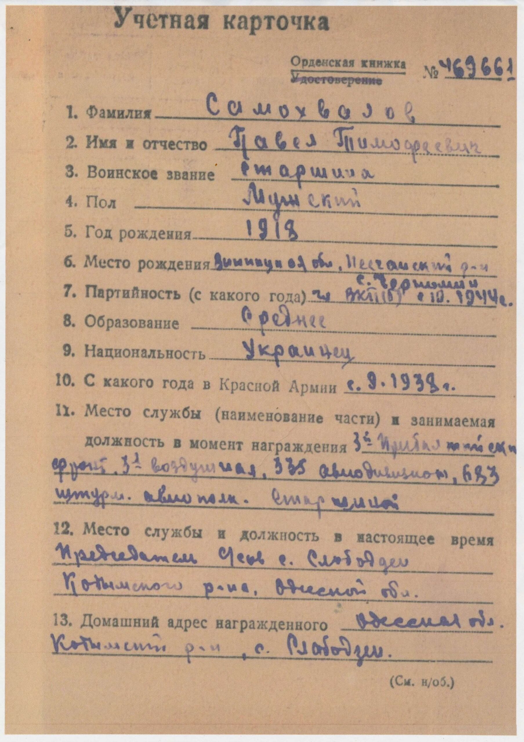 Comrade Samokhvalov has been serving on the front lines of the Patriotic War in the USSR against German invaders since November 1943. Initially appointed as a Senior Radio Operator-Gunner, he took on the role of aerial gunner in the regiment.