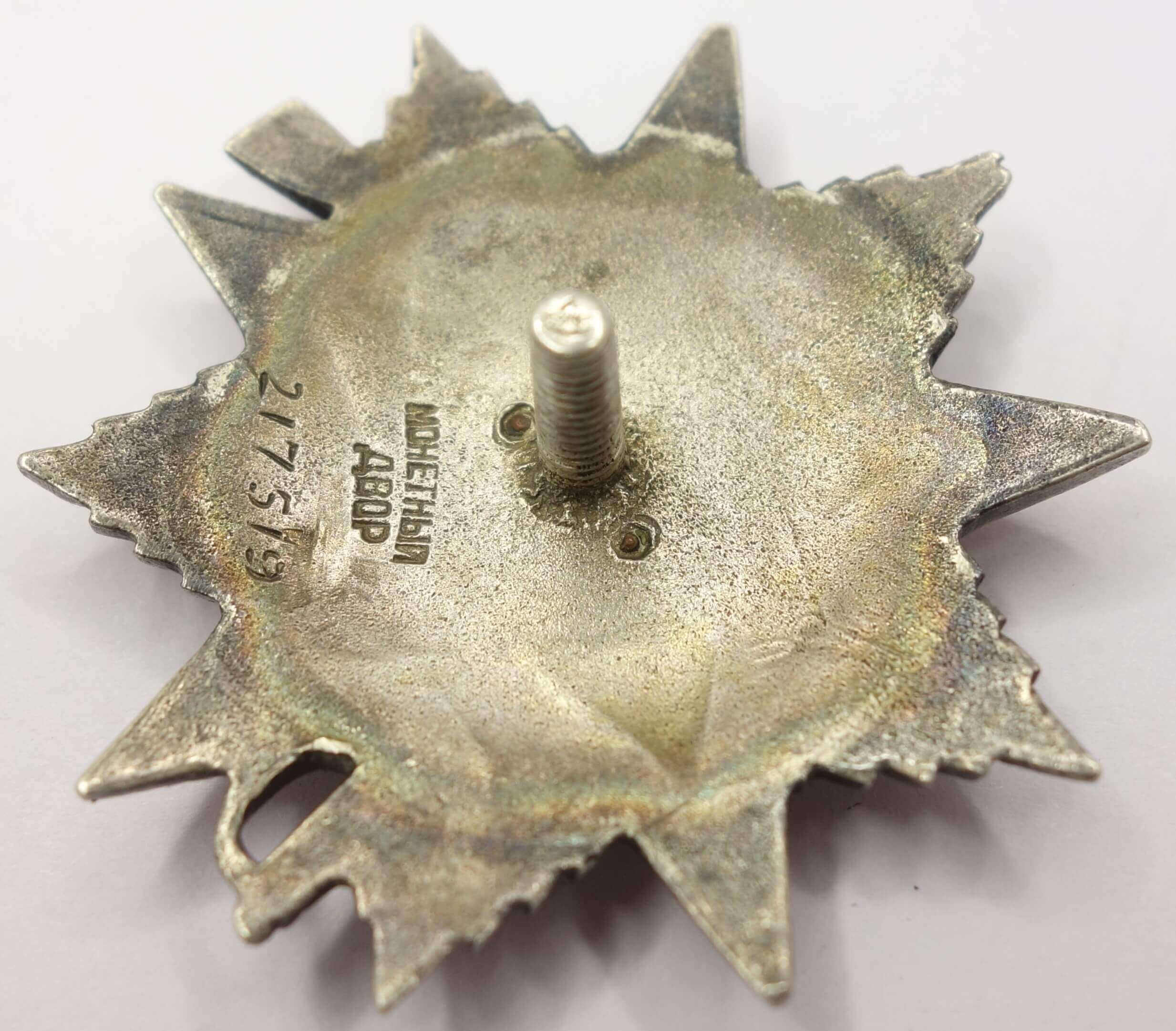 Made of solid silver, gold and enamels. The order weighs 28.4 grams without its screwplate and measures 44.89 mm in width and 46.87 mm in height. Its mint mark and serial number are located at the bottom of its reverse.