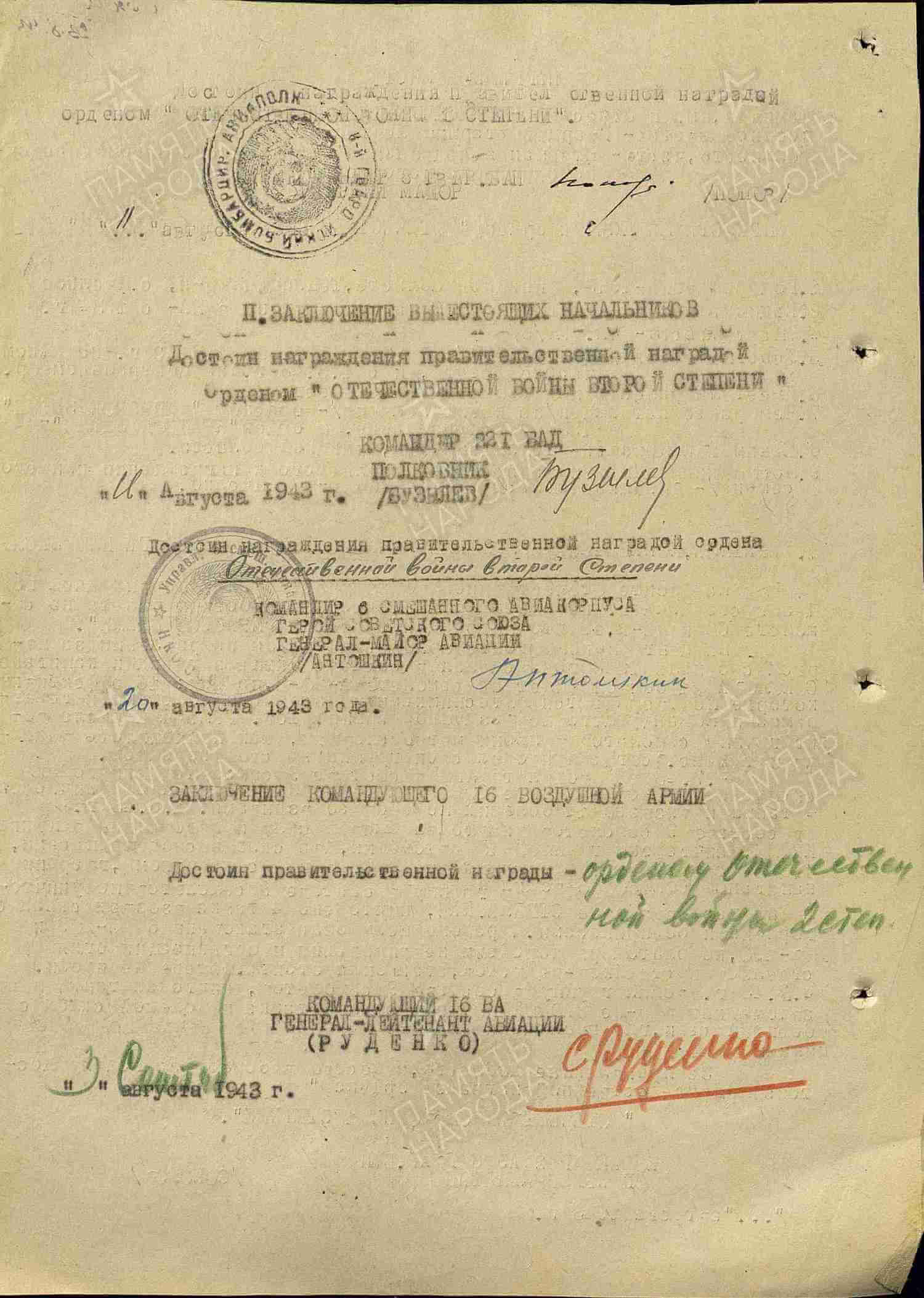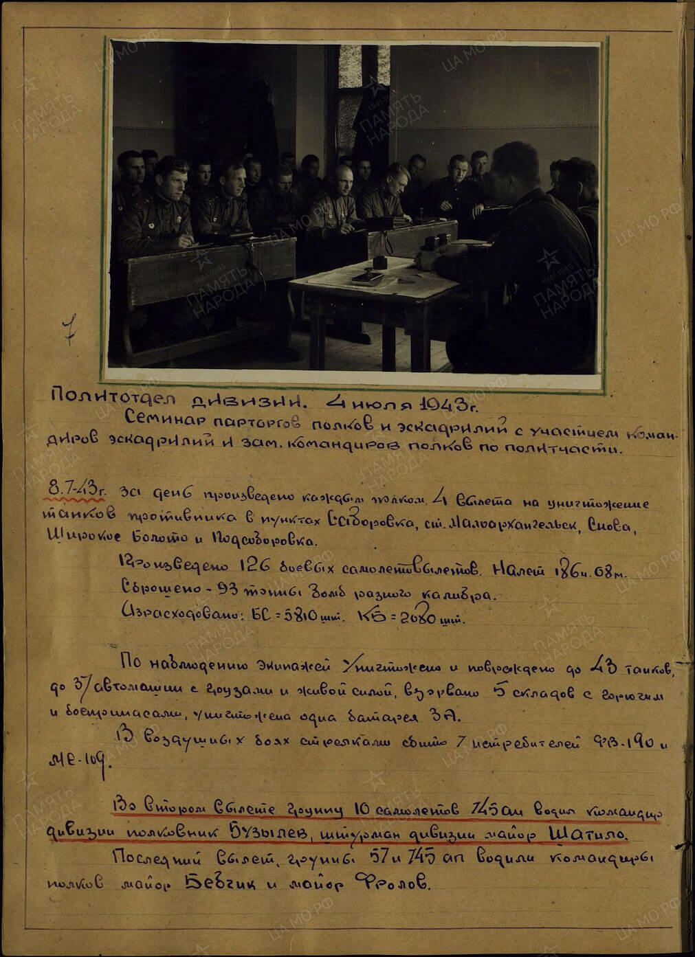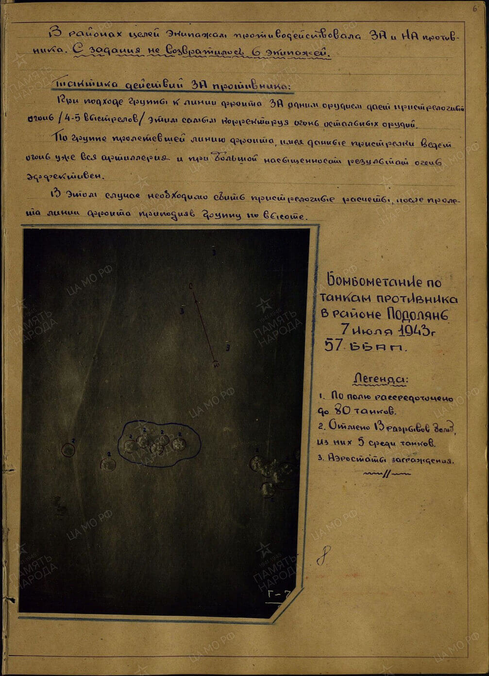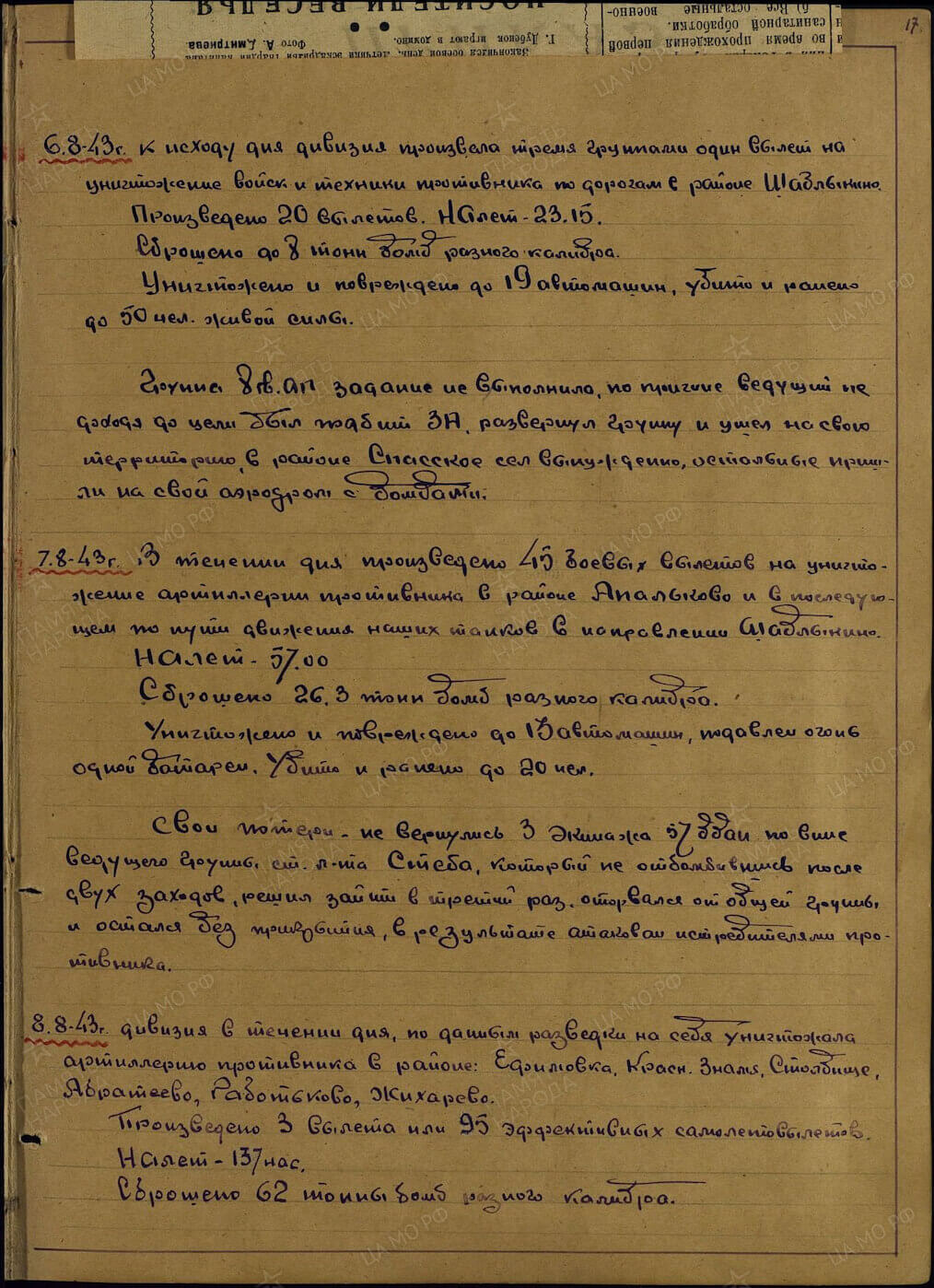 On 09.07.1943, he led a group of 9 aircrafts in a mission against the enemy armour concentration in the village SOBOROVKA. The strike resulted in destruction of 4 enemy tanks and caused 11 large fires followed by secondary explosions. On 01.08.1943, he led a group of 9 aircrafts in a mission against the enemy armour concentration in the village KROMY. The group destroyed 10 vehicles and 2 ammunition depots, which is corroborated by the aerial photographs. On 03.08.1943, in the crew of Gu.Cpt. SOKOLOV, he led a group of 9 aircrafts in a mission against the enemy armour concentration in the village STRELETSKAYA. The strike resulted in destruction of 4 tanks and 2 depots (fuel and ammunition). Above the designated target, they were attacked by 8 Me-109 and Fw-190. Thanks to good piloting skill and efficient coordination of defensive fire, the enemy attack was fended off and our aircrafts suffered no losses. On 04.08.1943, he led a group of 9 aircrafts in a ground strike against the enemy armour concentration in the village NARYSHKINO. 3 tanks and a large ammunition depot were destroyed (very large explosions wee spotted), which was corroborated by the aerial photographs № 4, 9, and 11.