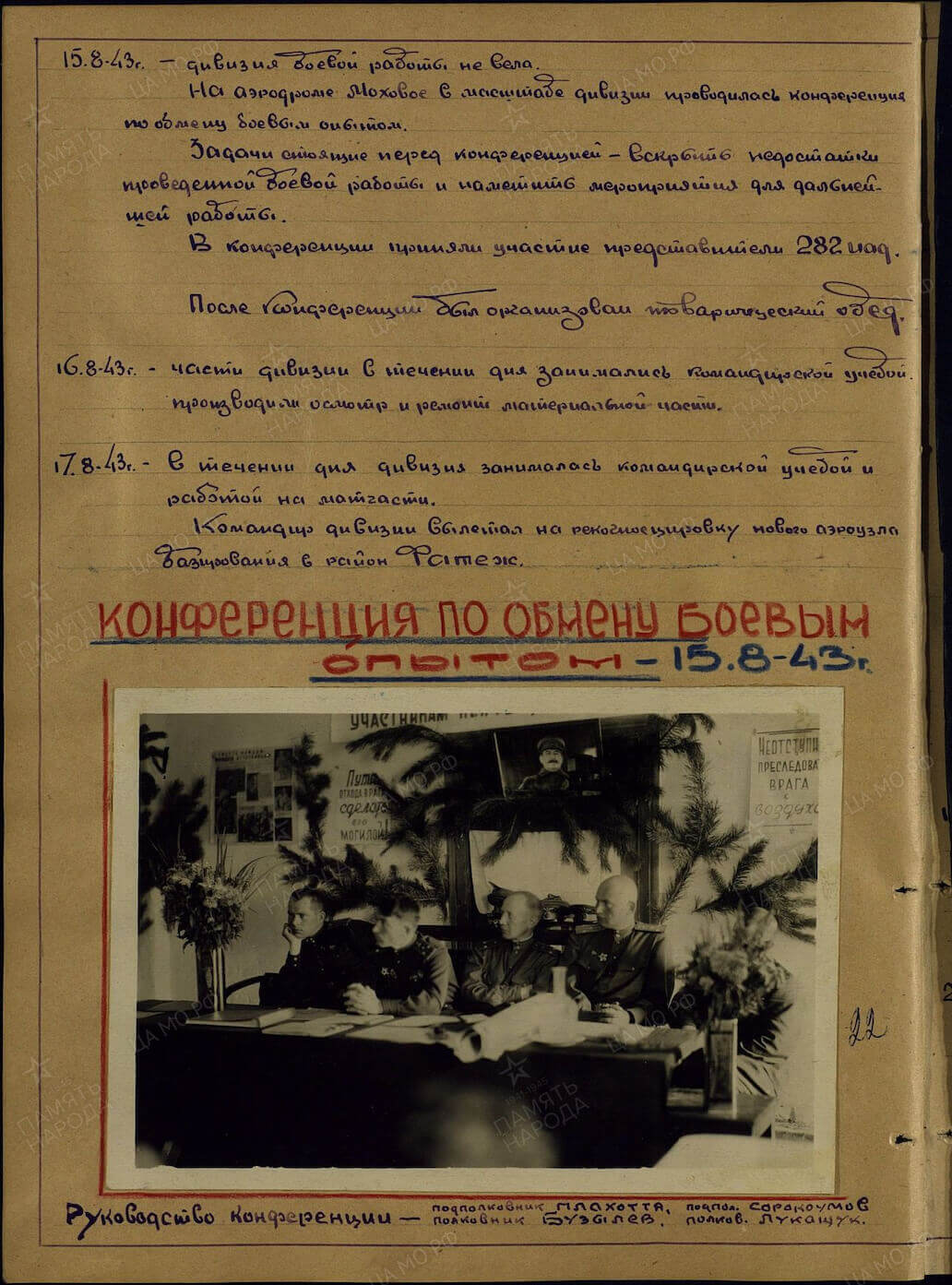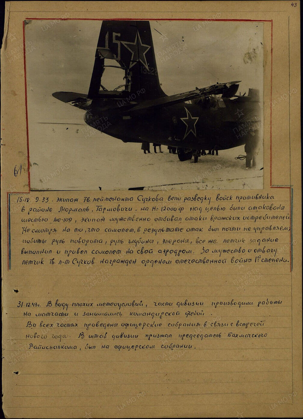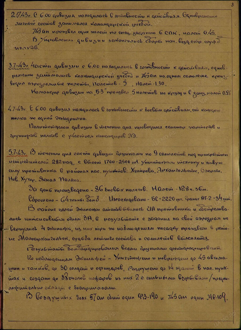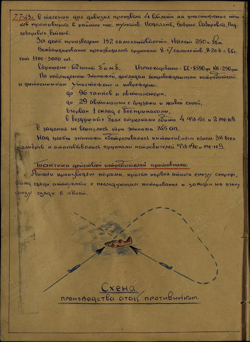 On 09.07.1943, he led a group of 9 aircrafts in a mission against the enemy armour concentration in the village SOBOROVKA. The strike resulted in destruction of 4 enemy tanks and caused 11 large fires followed by secondary explosions. On 01.08.1943, he led a group of 9 aircrafts in a mission against the enemy armour concentration in the village KROMY. The group destroyed 10 vehicles and 2 ammunition depots, which is corroborated by the aerial photographs. On 03.08.1943, in the crew of Gu.Cpt. SOKOLOV, he led a group of 9 aircrafts in a mission against the enemy armour concentration in the village STRELETSKAYA. The strike resulted in destruction of 4 tanks and 2 depots (fuel and ammunition). Above the designated target, they were attacked by 8 Me-109 and Fw-190. Thanks to good piloting skill and efficient coordination of defensive fire, the enemy attack was fended off and our aircrafts suffered no losses. On 04.08.1943, he led a group of 9 aircrafts in a ground strike against the enemy armour concentration in the village NARYSHKINO. 3 tanks and a large ammunition depot were destroyed (very large explosions wee spotted), which was corroborated by the aerial photographs № 4, 9, and 11.