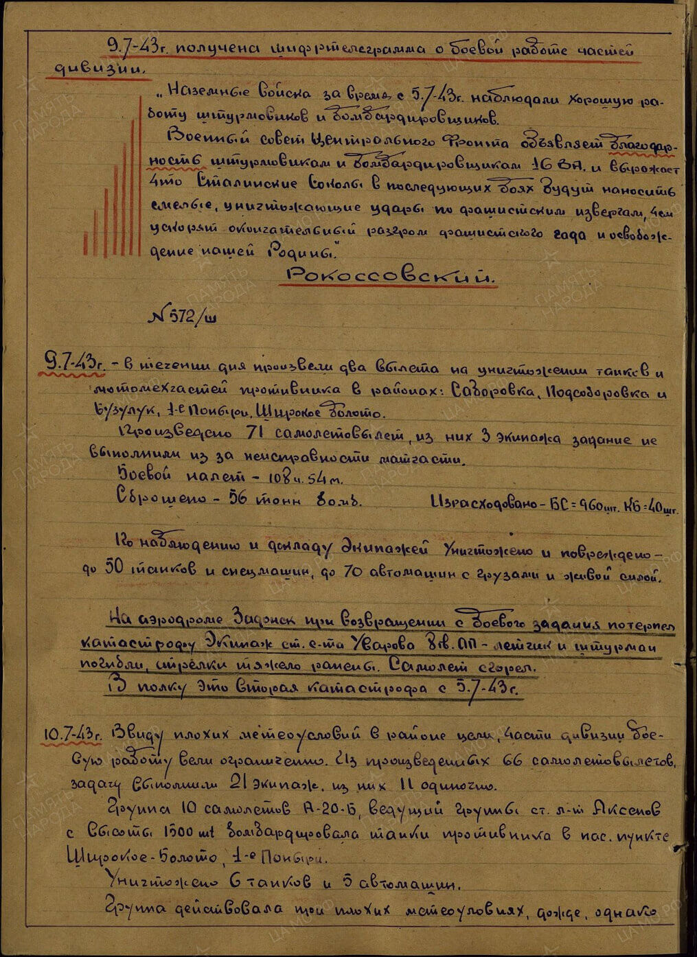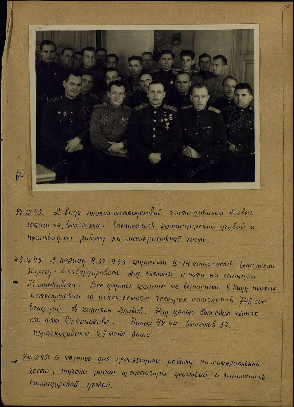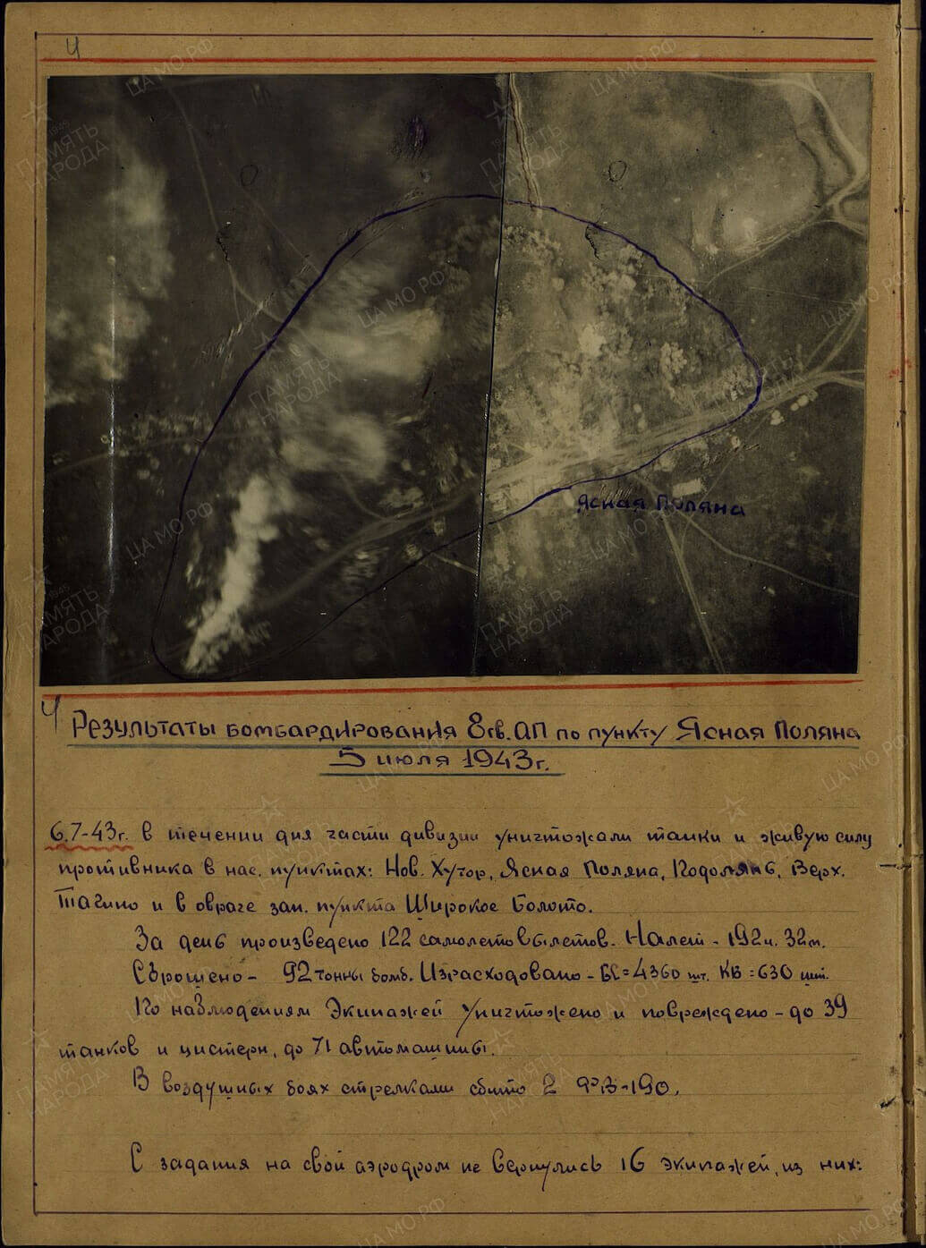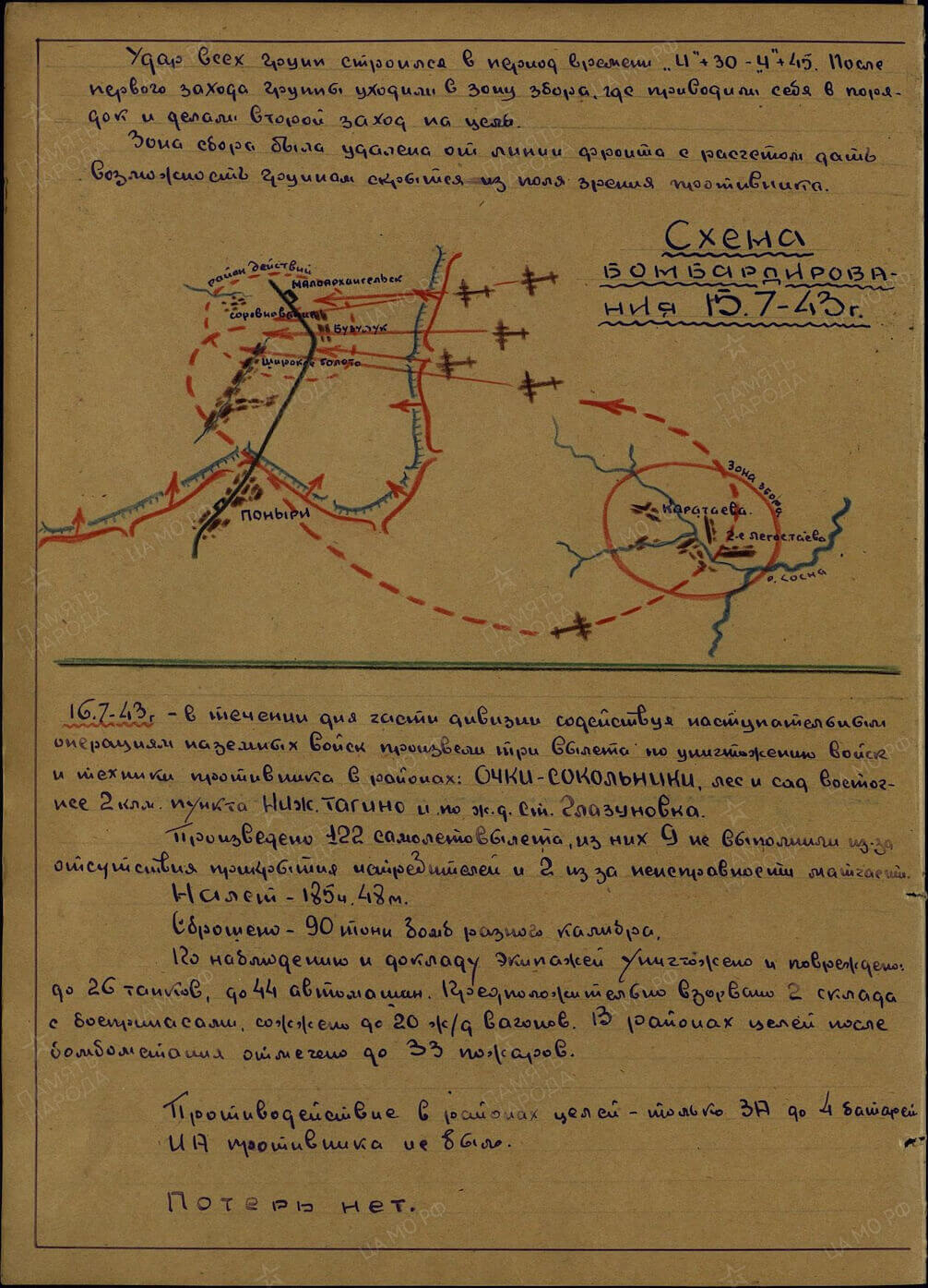 On 09.07.1943, he led a group of 9 aircrafts in a mission against the enemy armour concentration in the village SOBOROVKA. The strike resulted in destruction of 4 enemy tanks and caused 11 large fires followed by secondary explosions. On 01.08.1943, he led a group of 9 aircrafts in a mission against the enemy armour concentration in the village KROMY. The group destroyed 10 vehicles and 2 ammunition depots, which is corroborated by the aerial photographs. On 03.08.1943, in the crew of Gu.Cpt. SOKOLOV, he led a group of 9 aircrafts in a mission against the enemy armour concentration in the village STRELETSKAYA. The strike resulted in destruction of 4 tanks and 2 depots (fuel and ammunition). Above the designated target, they were attacked by 8 Me-109 and Fw-190. Thanks to good piloting skill and efficient coordination of defensive fire, the enemy attack was fended off and our aircrafts suffered no losses. On 04.08.1943, he led a group of 9 aircrafts in a ground strike against the enemy armour concentration in the village NARYSHKINO. 3 tanks and a large ammunition depot were destroyed (very large explosions wee spotted), which was corroborated by the aerial photographs № 4, 9, and 11.