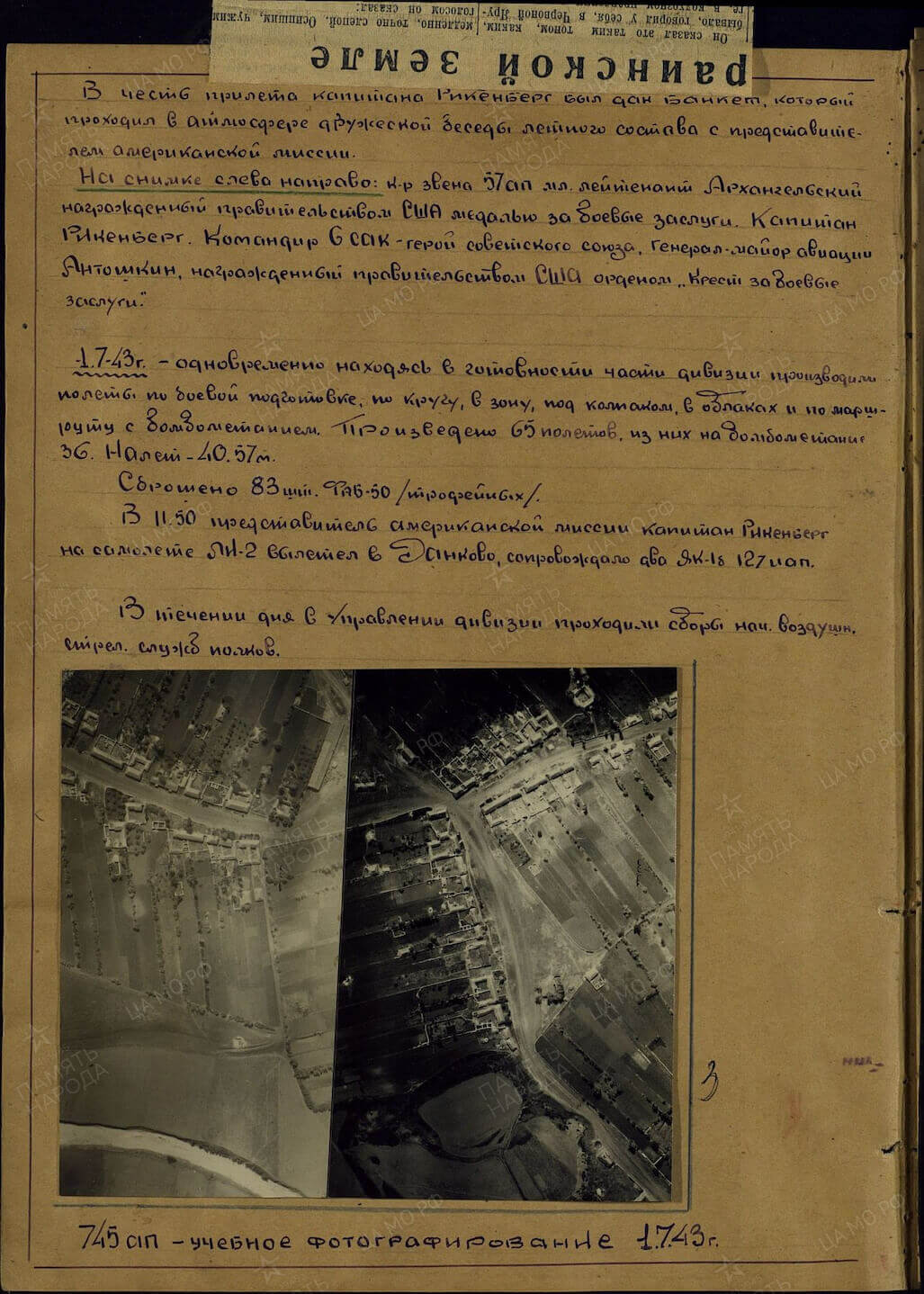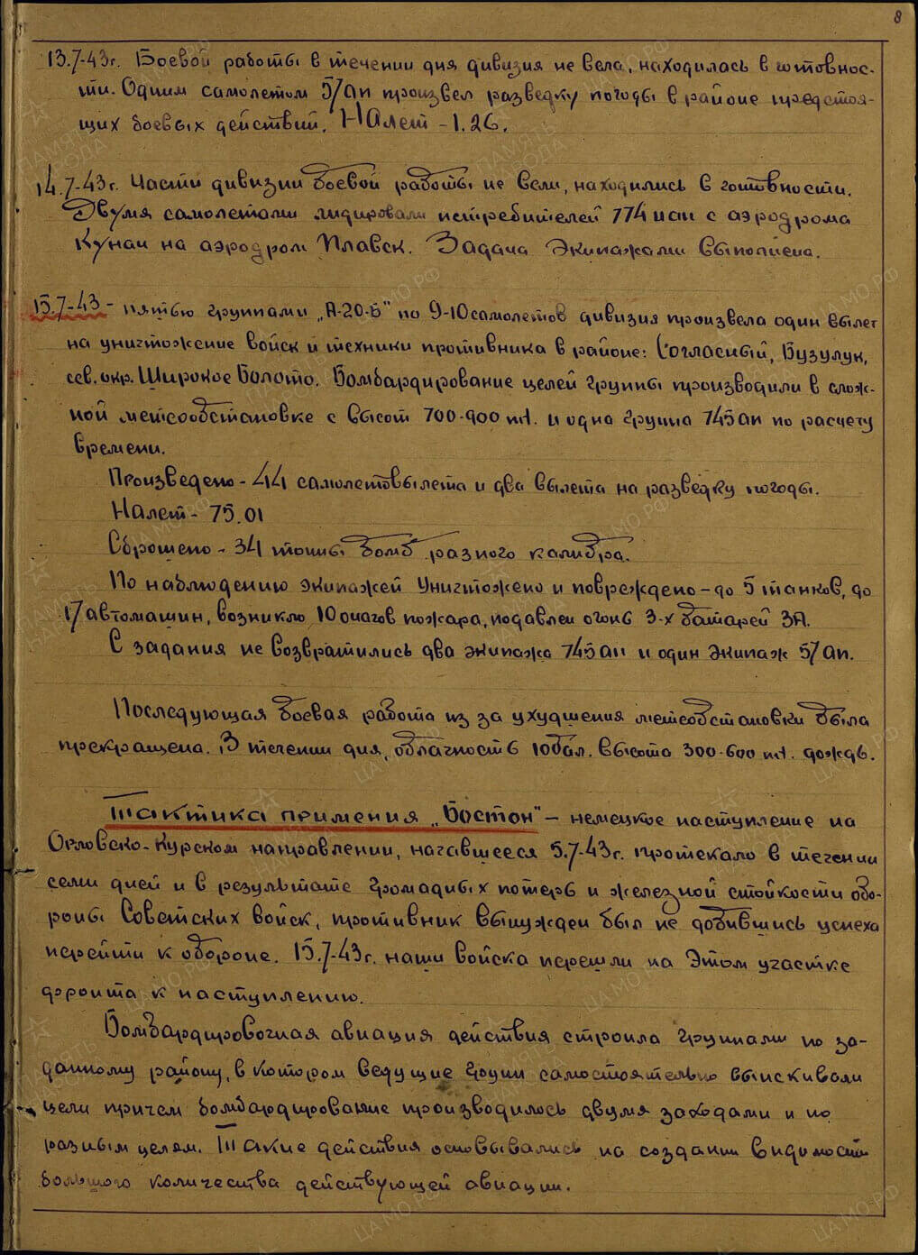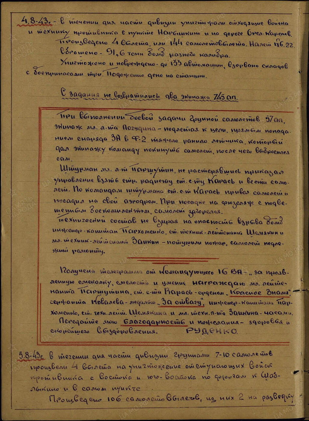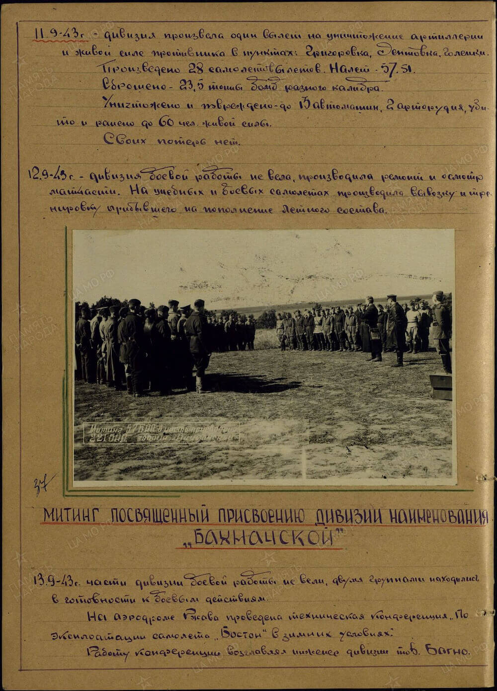 On 09.07.1943, he led a group of 9 aircrafts in a mission against the enemy armour concentration in the village SOBOROVKA. The strike resulted in destruction of 4 enemy tanks and caused 11 large fires followed by secondary explosions. On 01.08.1943, he led a group of 9 aircrafts in a mission against the enemy armour concentration in the village KROMY. The group destroyed 10 vehicles and 2 ammunition depots, which is corroborated by the aerial photographs. On 03.08.1943, in the crew of Gu.Cpt. SOKOLOV, he led a group of 9 aircrafts in a mission against the enemy armour concentration in the village STRELETSKAYA. The strike resulted in destruction of 4 tanks and 2 depots (fuel and ammunition). Above the designated target, they were attacked by 8 Me-109 and Fw-190. Thanks to good piloting skill and efficient coordination of defensive fire, the enemy attack was fended off and our aircrafts suffered no losses. On 04.08.1943, he led a group of 9 aircrafts in a ground strike against the enemy armour concentration in the village NARYSHKINO. 3 tanks and a large ammunition depot were destroyed (very large explosions wee spotted), which was corroborated by the aerial photographs № 4, 9, and 11.