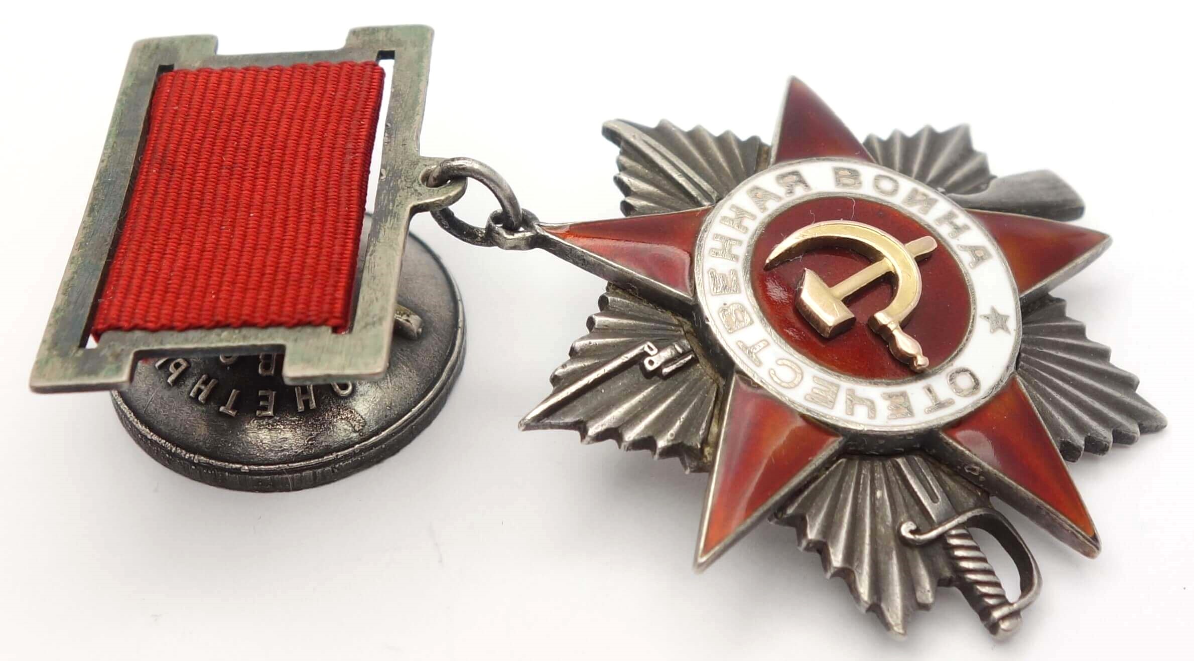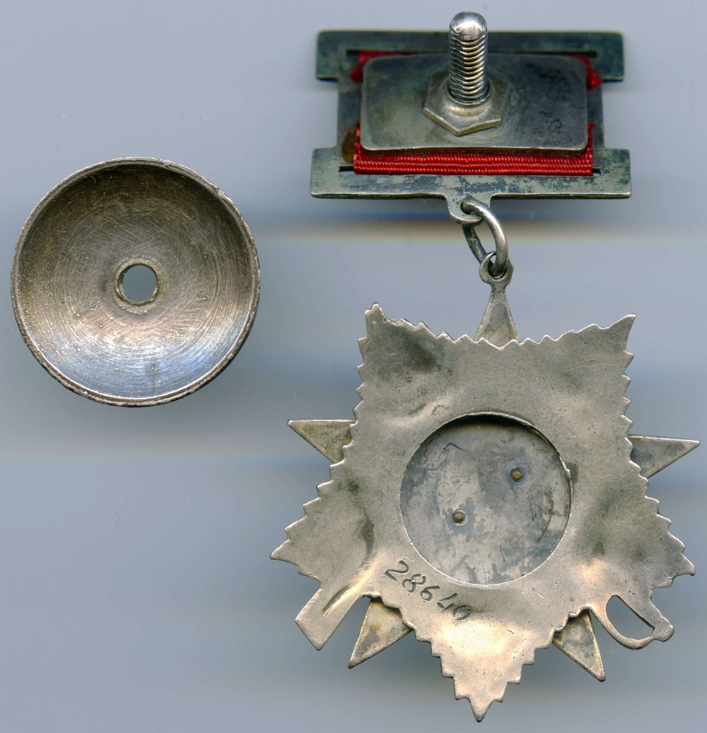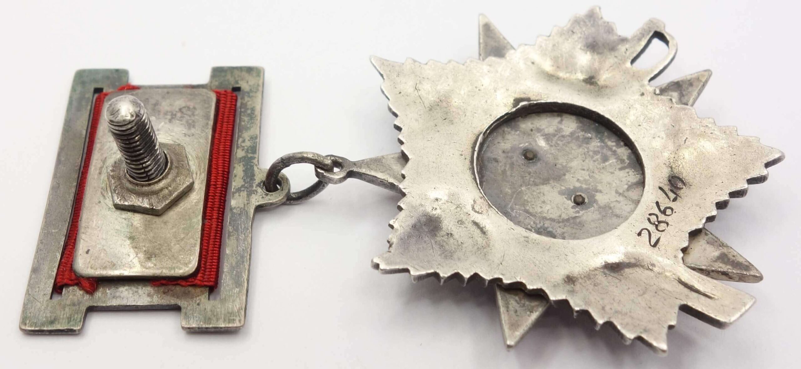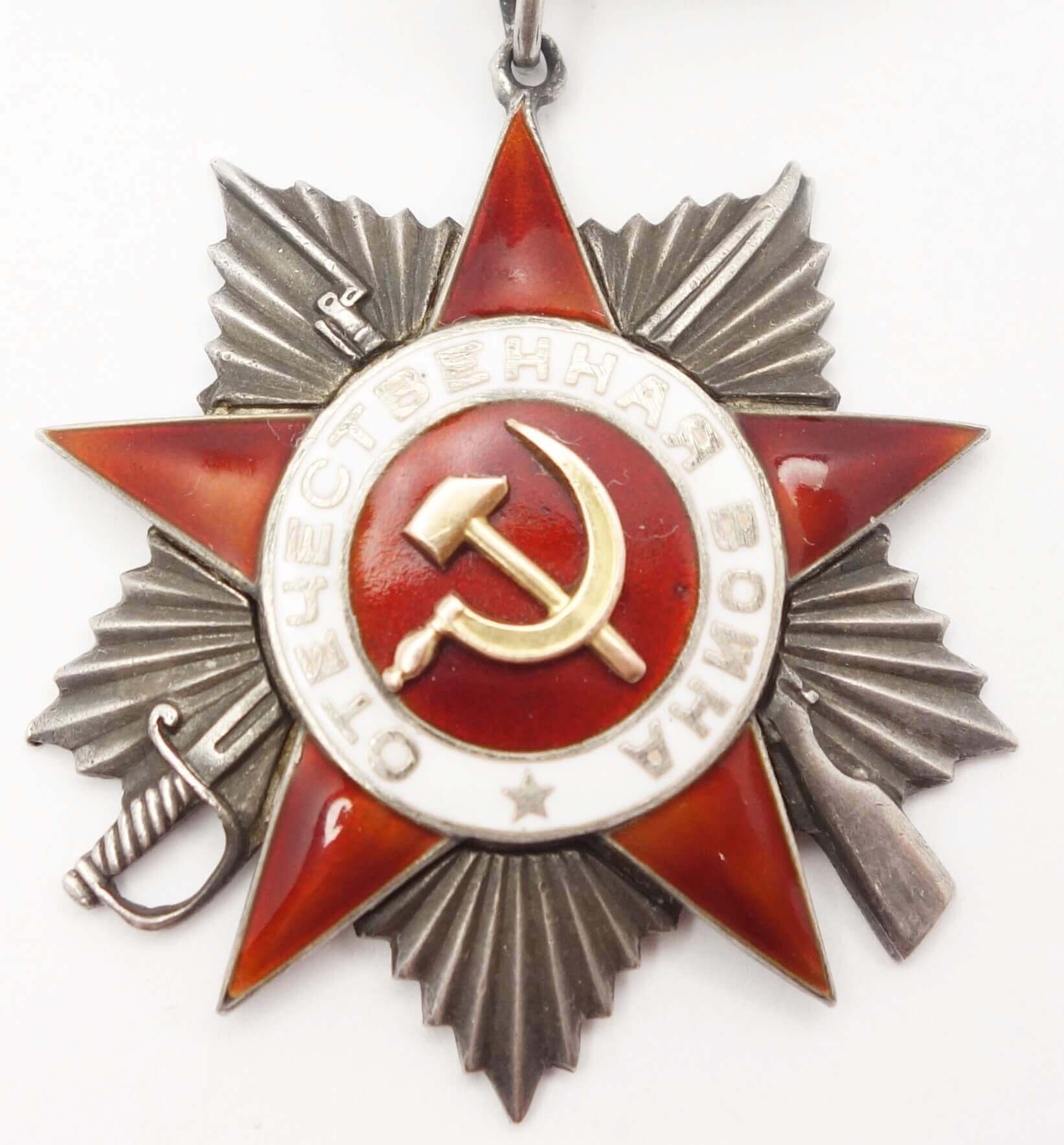 This order is nice but repaired condition. Its details are all crisp and even the raised hammer and sickle shows light wear only. The enamels have been professionally been replaced by hot enamels a long time ago. This is beautifully done and barely noticeable to the untrained eye. The order however has its original eyelet on top and its suspension and screwplate are authentic as well. Its connection ring between the suspension and the medal itself has not been cut.
