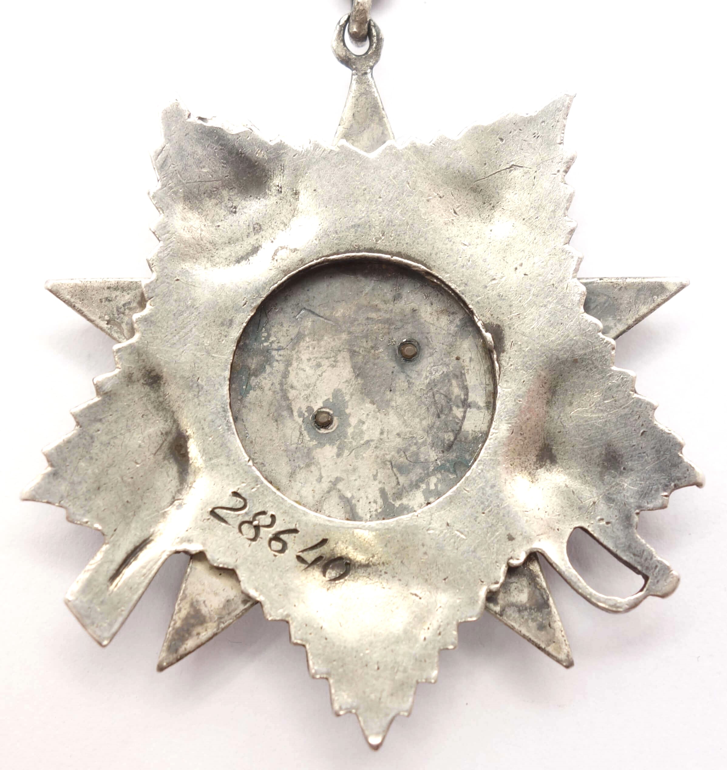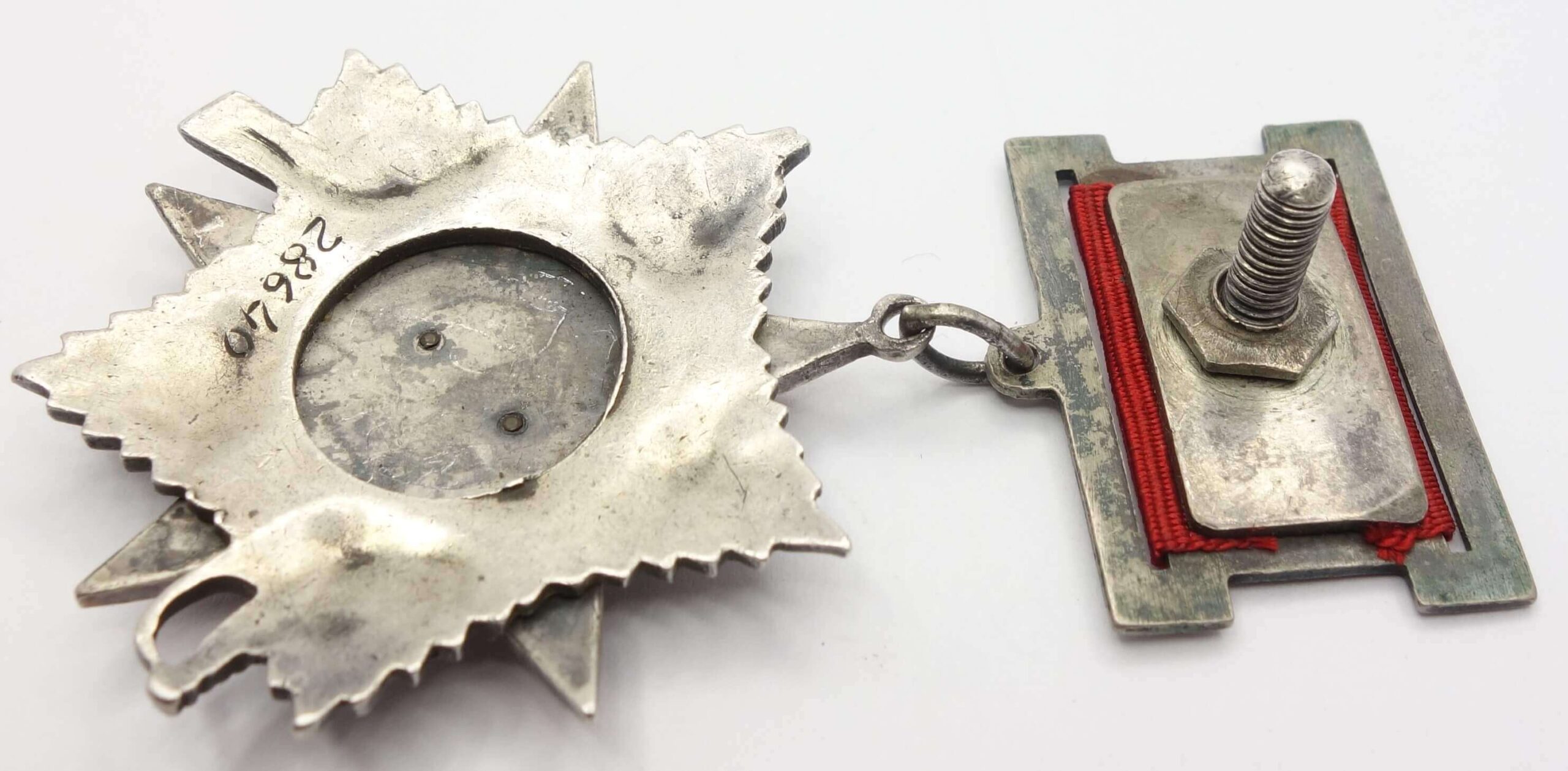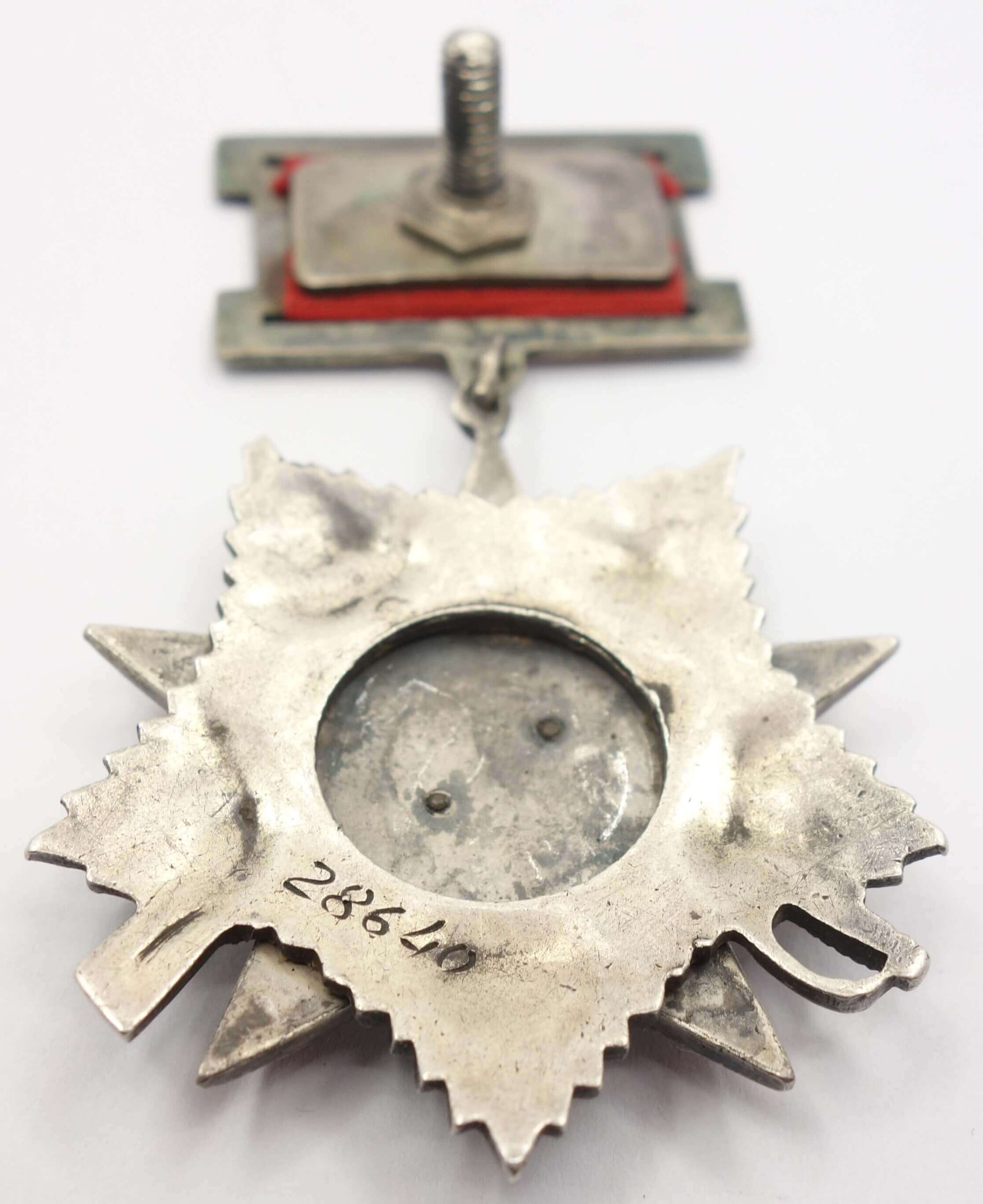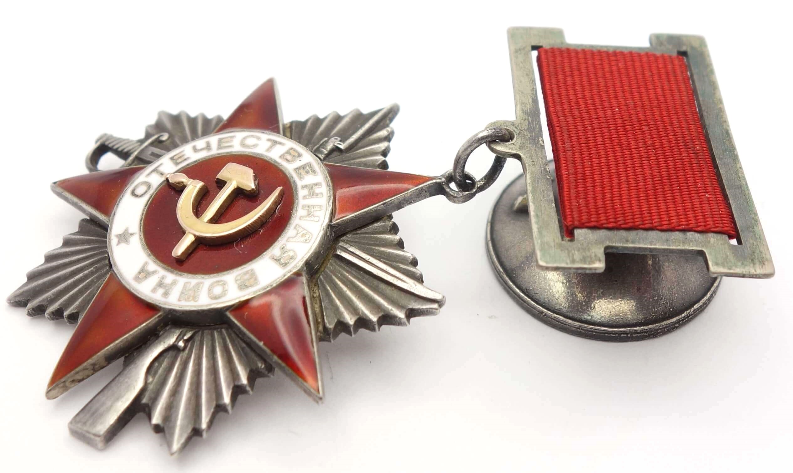 This order is nice but repaired condition. Its details are all crisp and even the raised hammer and sickle shows light wear only. The enamels have been professionally been replaced by hot enamels a long time ago. This is beautifully done and barely noticeable to the untrained eye. The order however has its original eyelet on top and its suspension and screwplate are authentic as well. Its connection ring between the suspension and the medal itself has not been cut.
