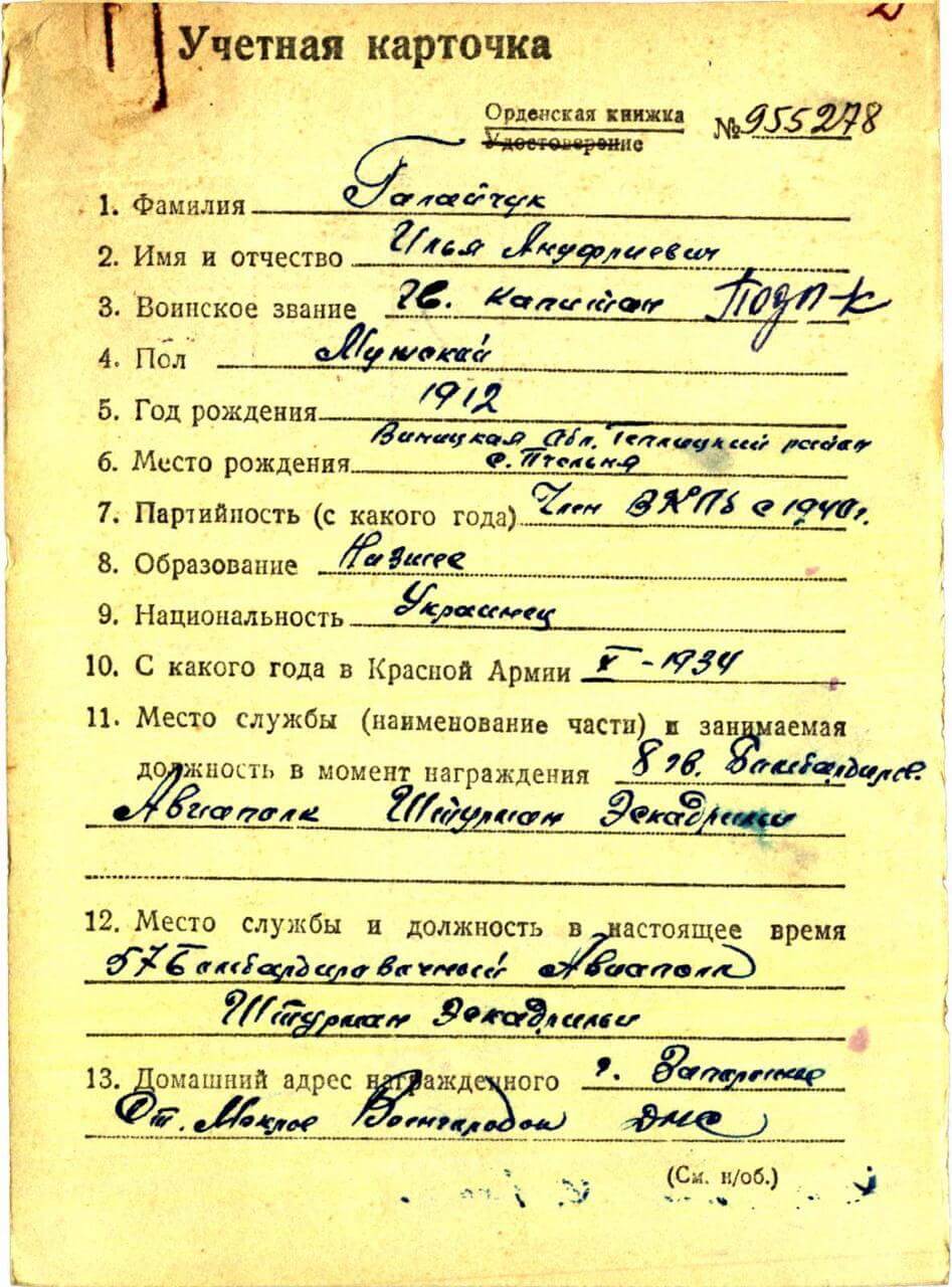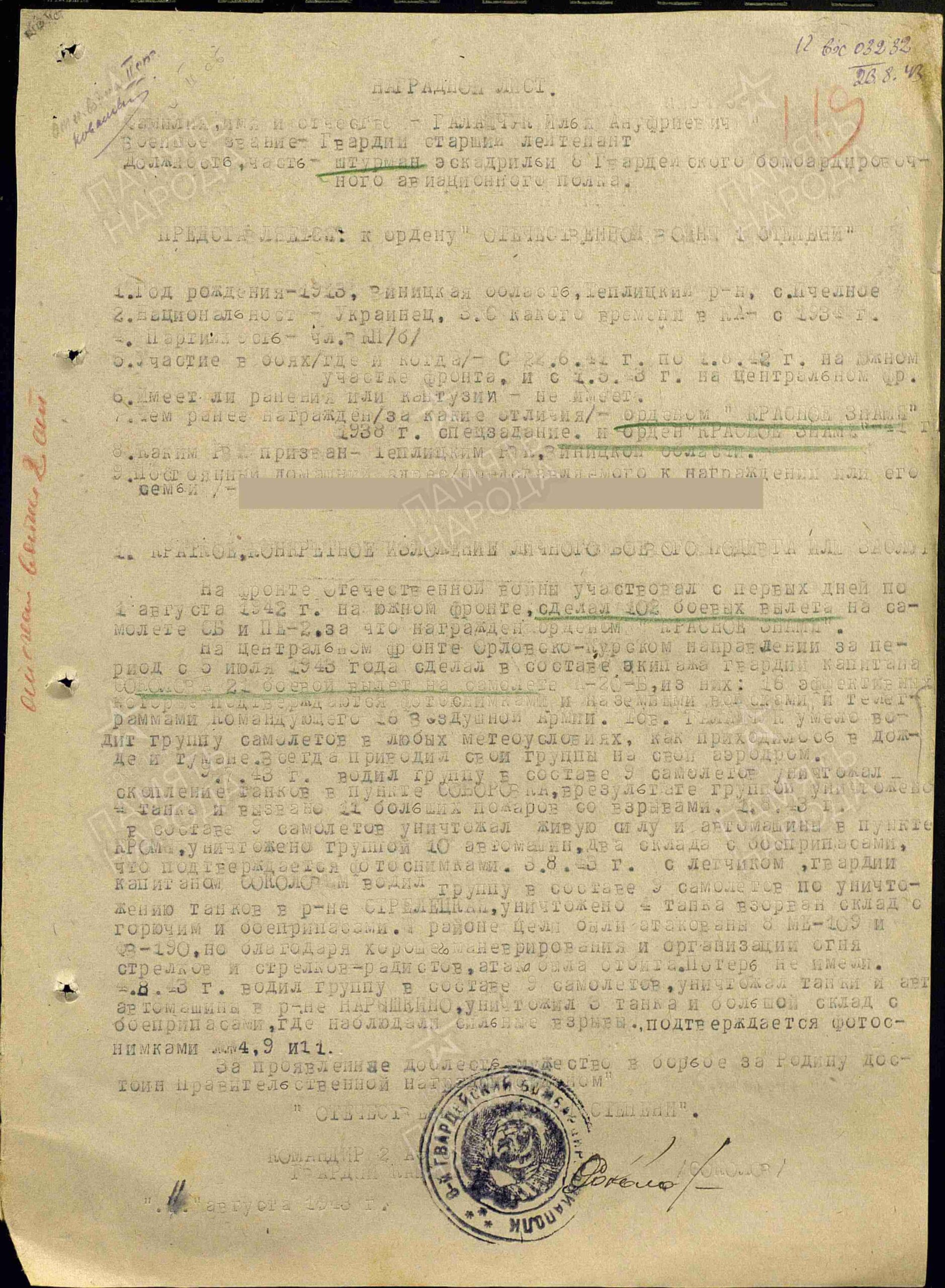 On the Orel-Kursk sector of the Central front during the period since 05 July 1943, he conducted 21 combat mission on A-20B aircraft piloted by Guards Captain SOKOLOV. Of these missions: 16 were effective missions corroborated by the aerial photographs, by the land troops, and by the dispatches from the commander of 16 Airforce. Comrade GALAYCHUK is proficient in navigating the path for the aircraft formations in any water conditions, such as rain and fog. He always laid proper course and brought the aircrafts to the home base.