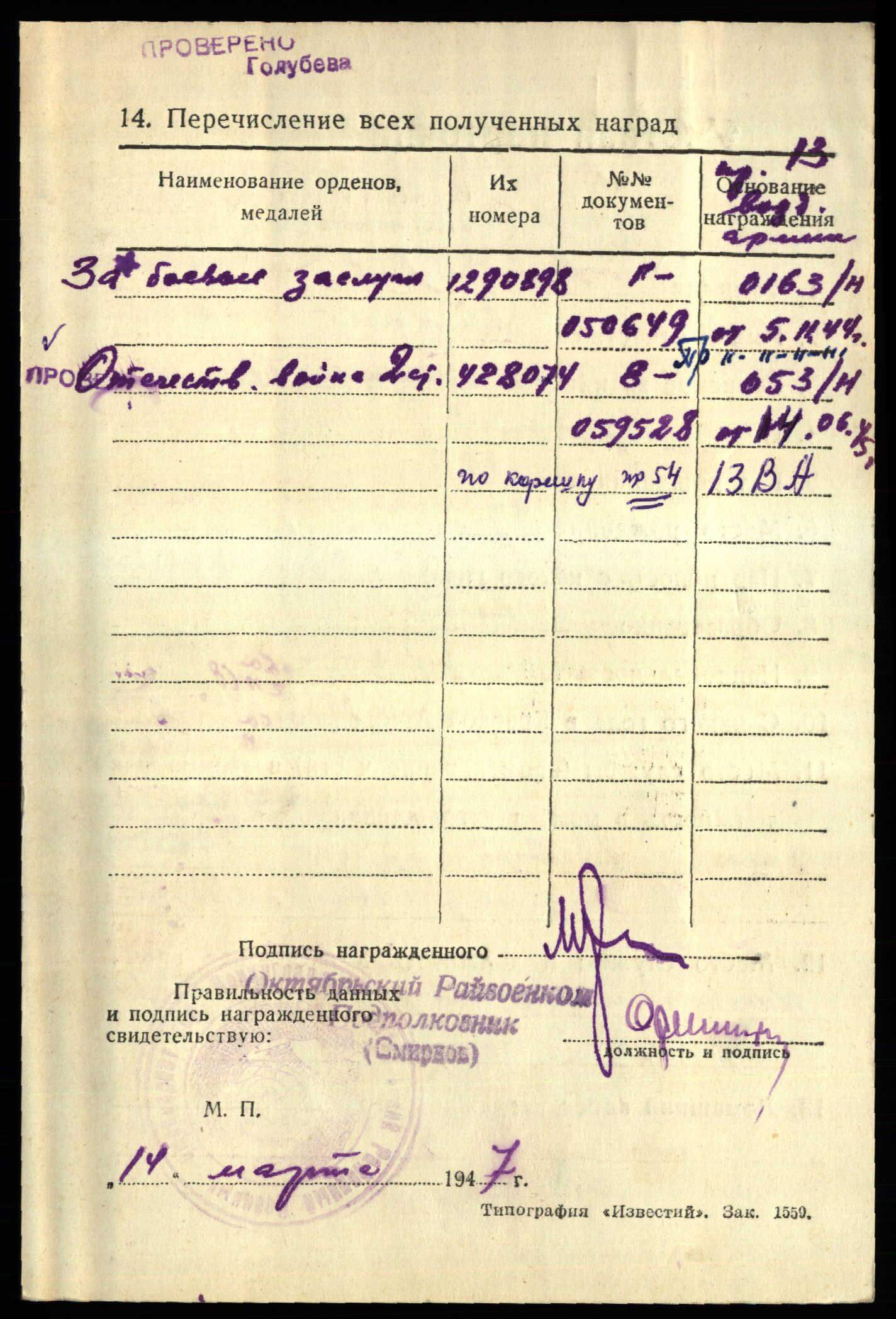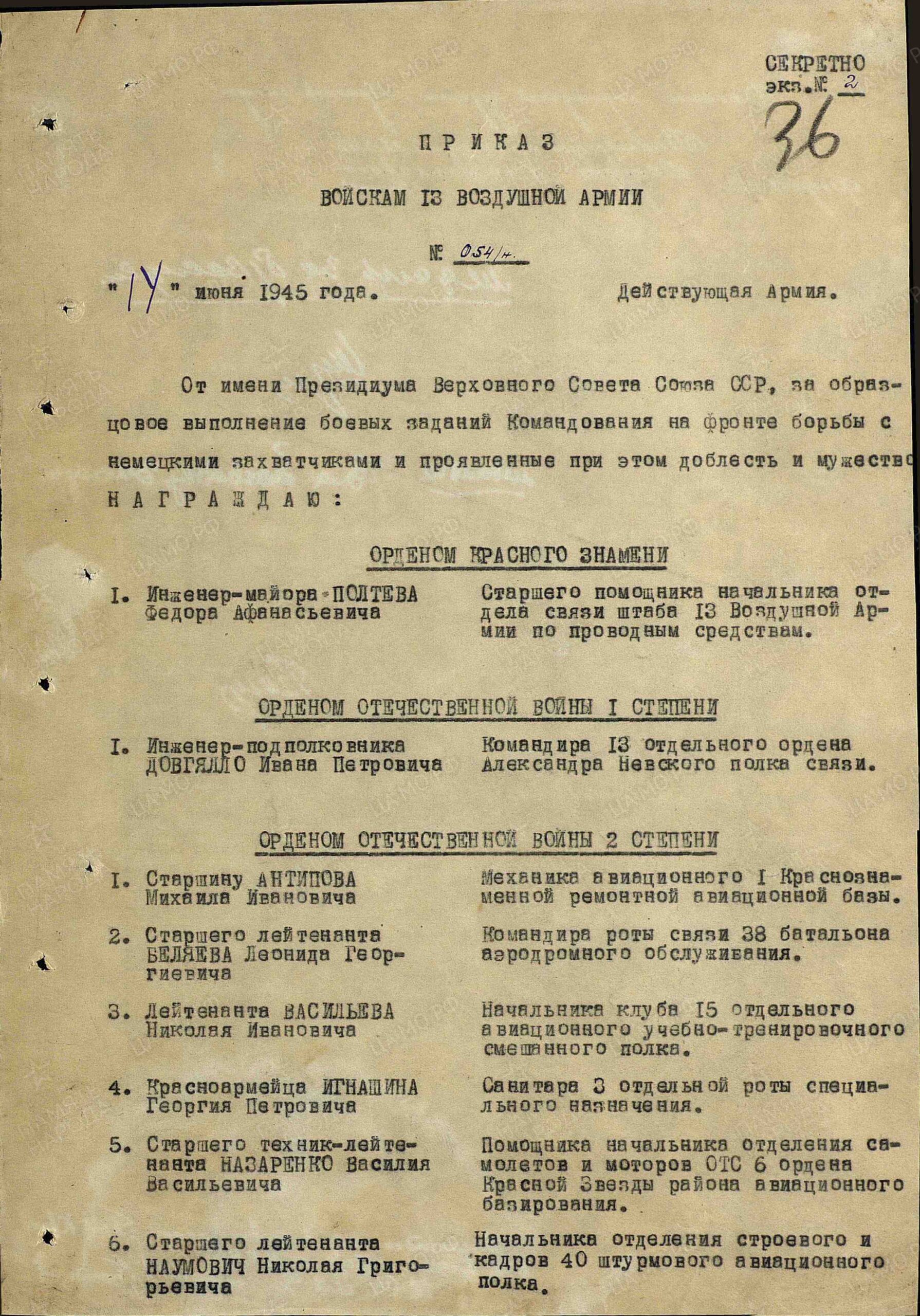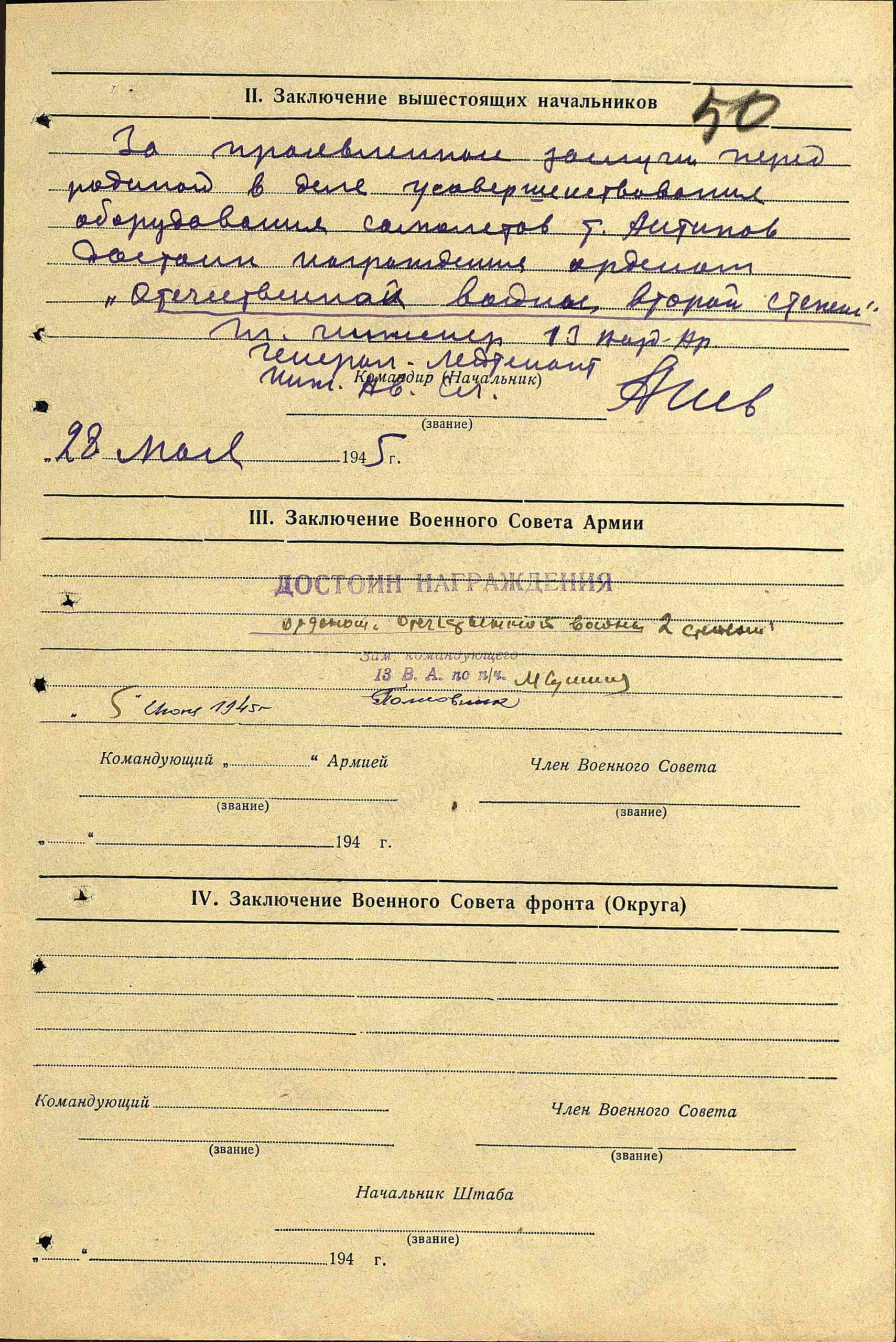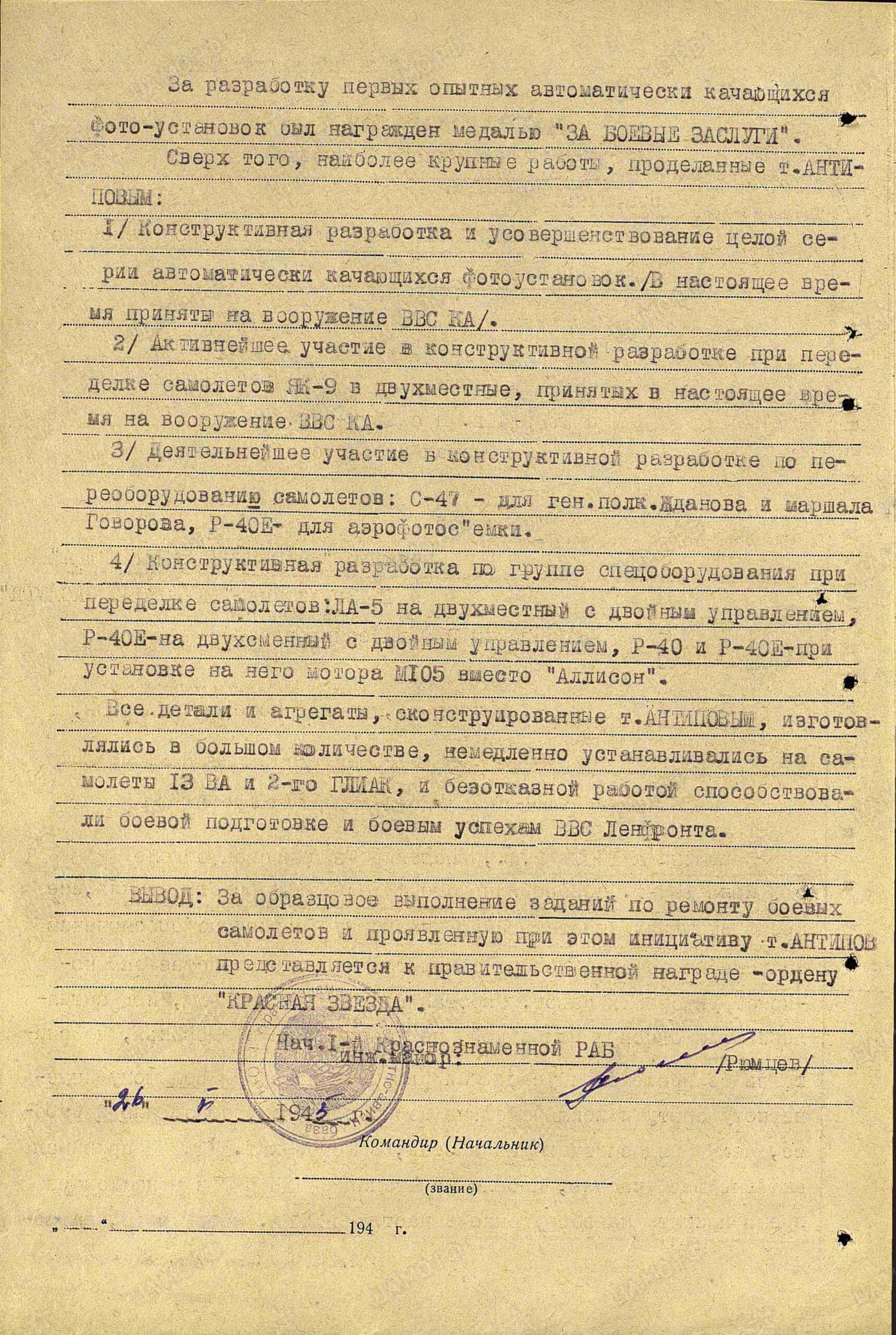 Conclusion: For the exemplary execution of repairs to combat aircraft and the initiative he exhibited in the process, comrade Antipov is being nominated for the Order of the Red Star.