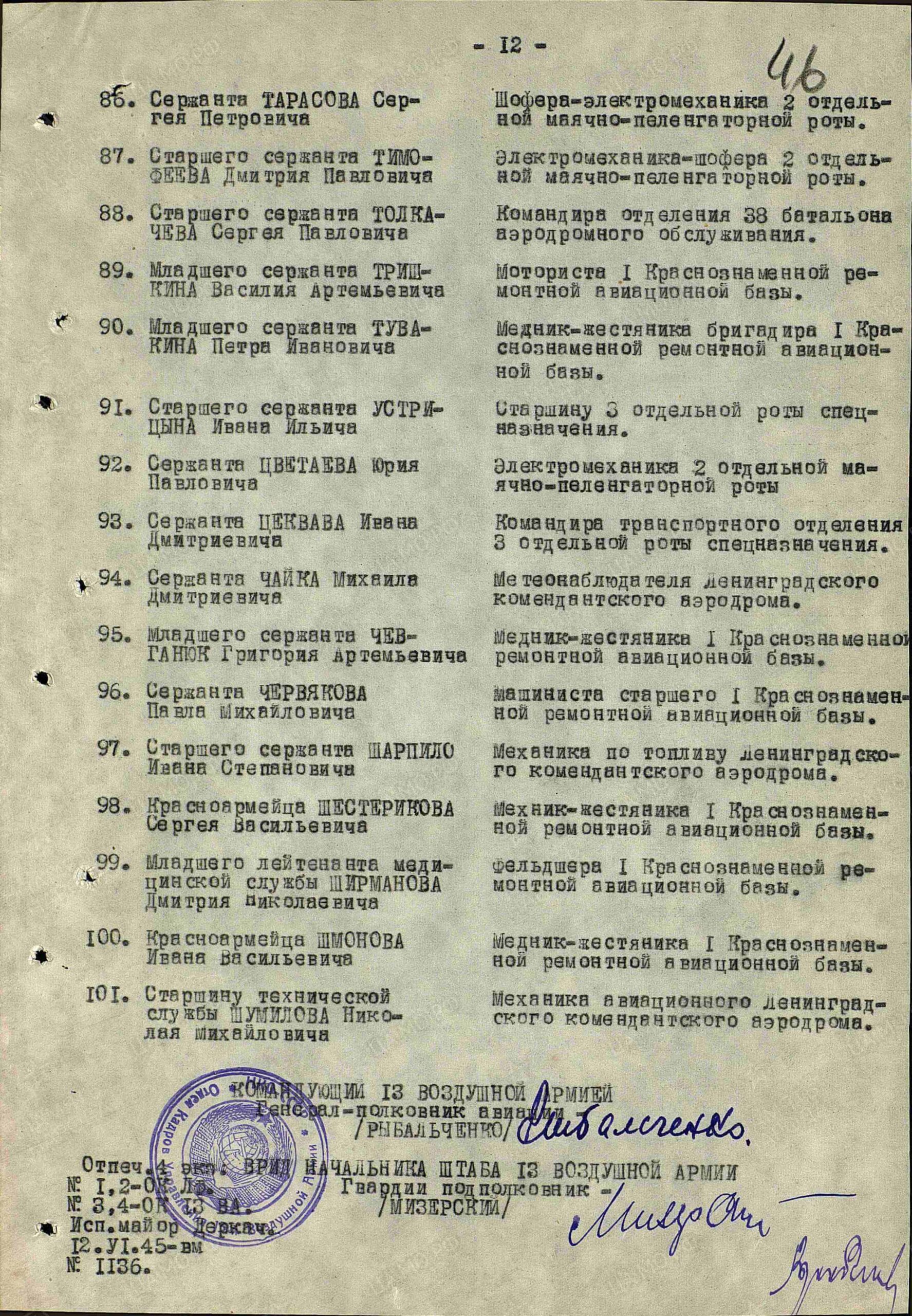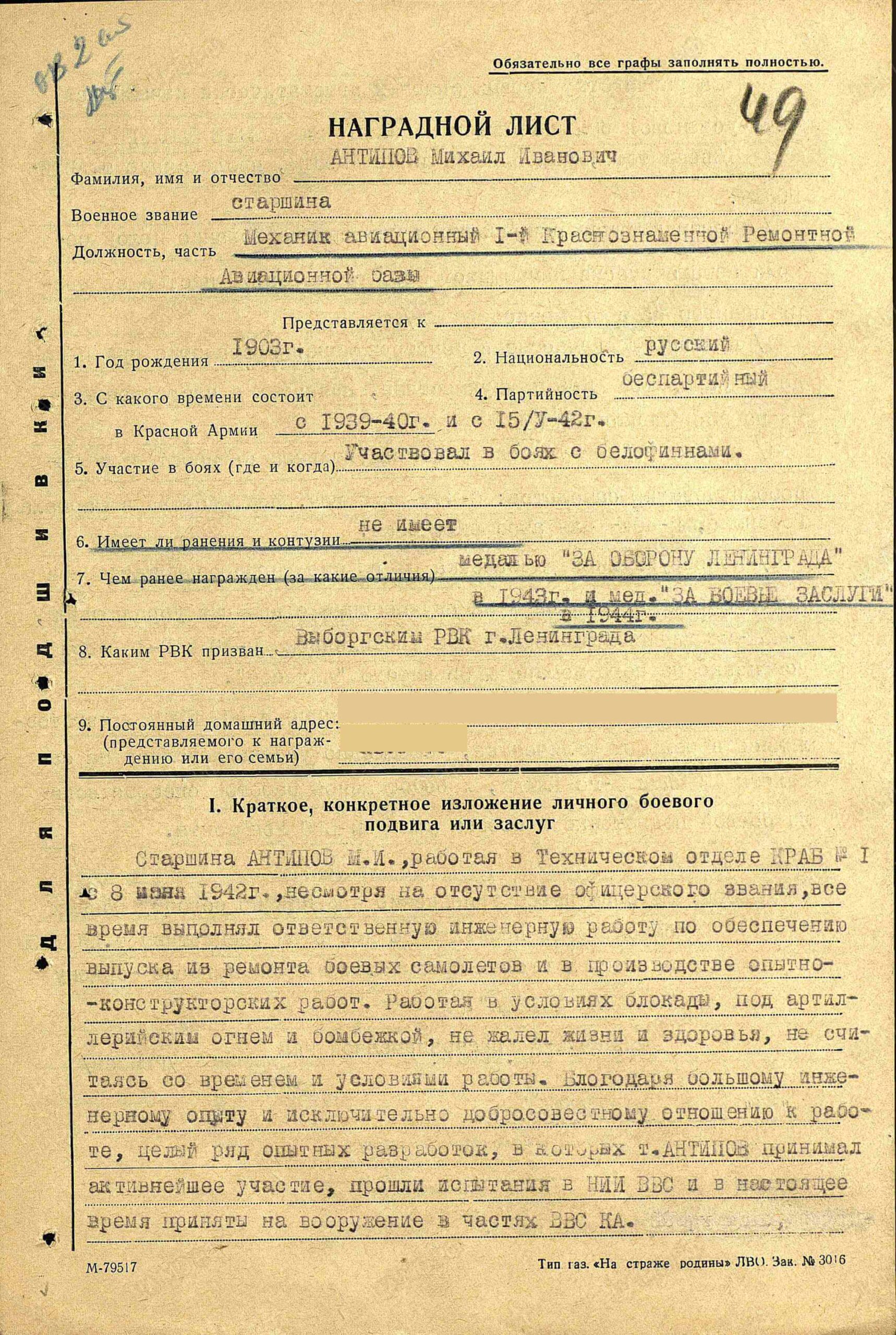 Having served with the Technical Department of the 1st Red Banner Aircraft Repair Depot since May 8, 1942, Master Sergeant M.I. Ivanov constantly carried out important engineering duties pertaining to the completion of repairs to combat aircraft and the conduct of research and development, even though he does not hold an officer’s rank. He worked under siege conditions and under artillery shelling and aerial bombardment, ignored the mortal danger and his personal health and worked with utter disregard for the time of day and the working conditions. Owing to his extensive engineering experience and his exceptionally conscientious attitude toward his duties, a large number of pilot projects, in which comrade Antipov was actively involved, passed the tests at the Air Force’s Scientific Research Institute and have now been adopted by the Red Army Air Forces.