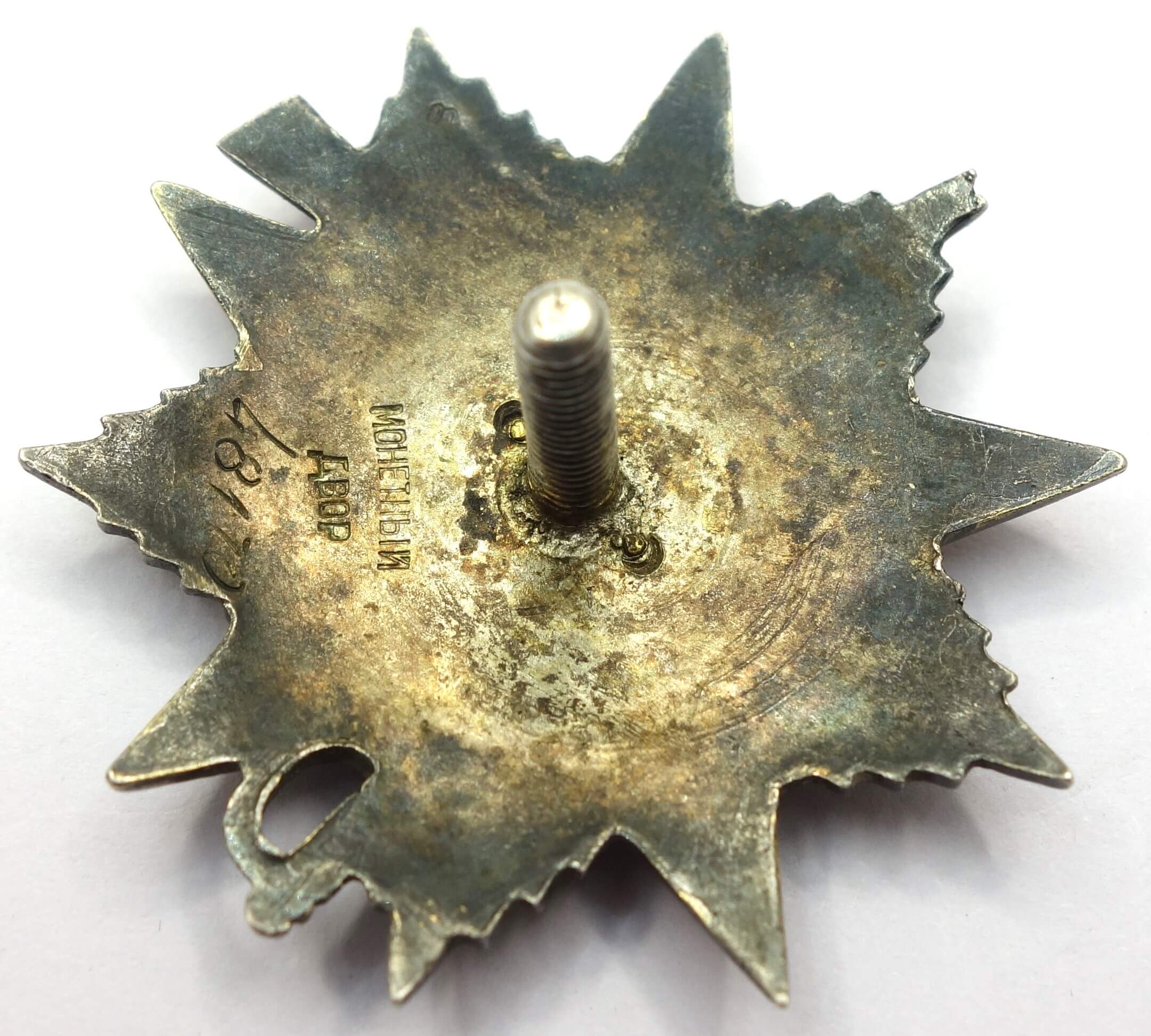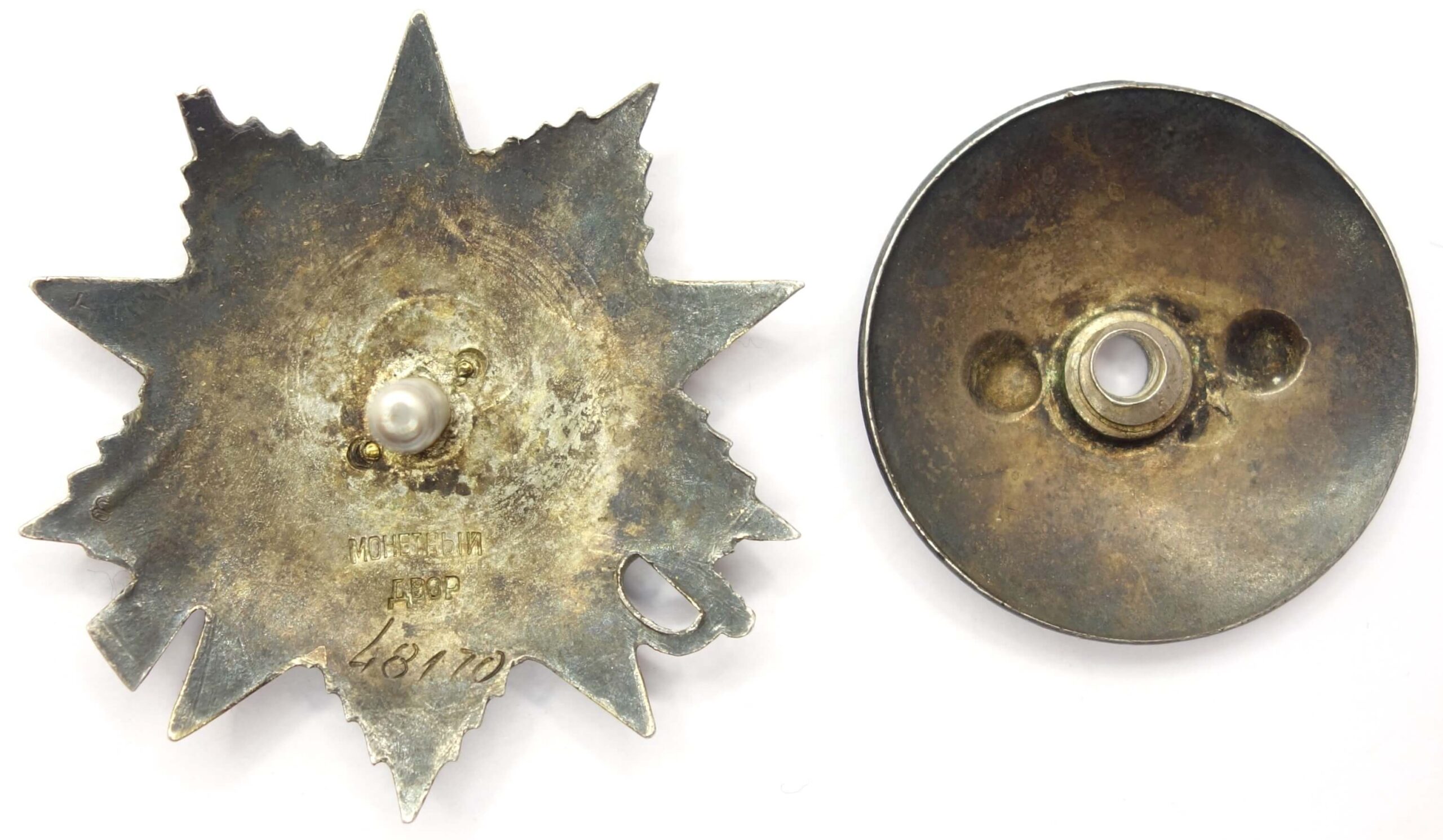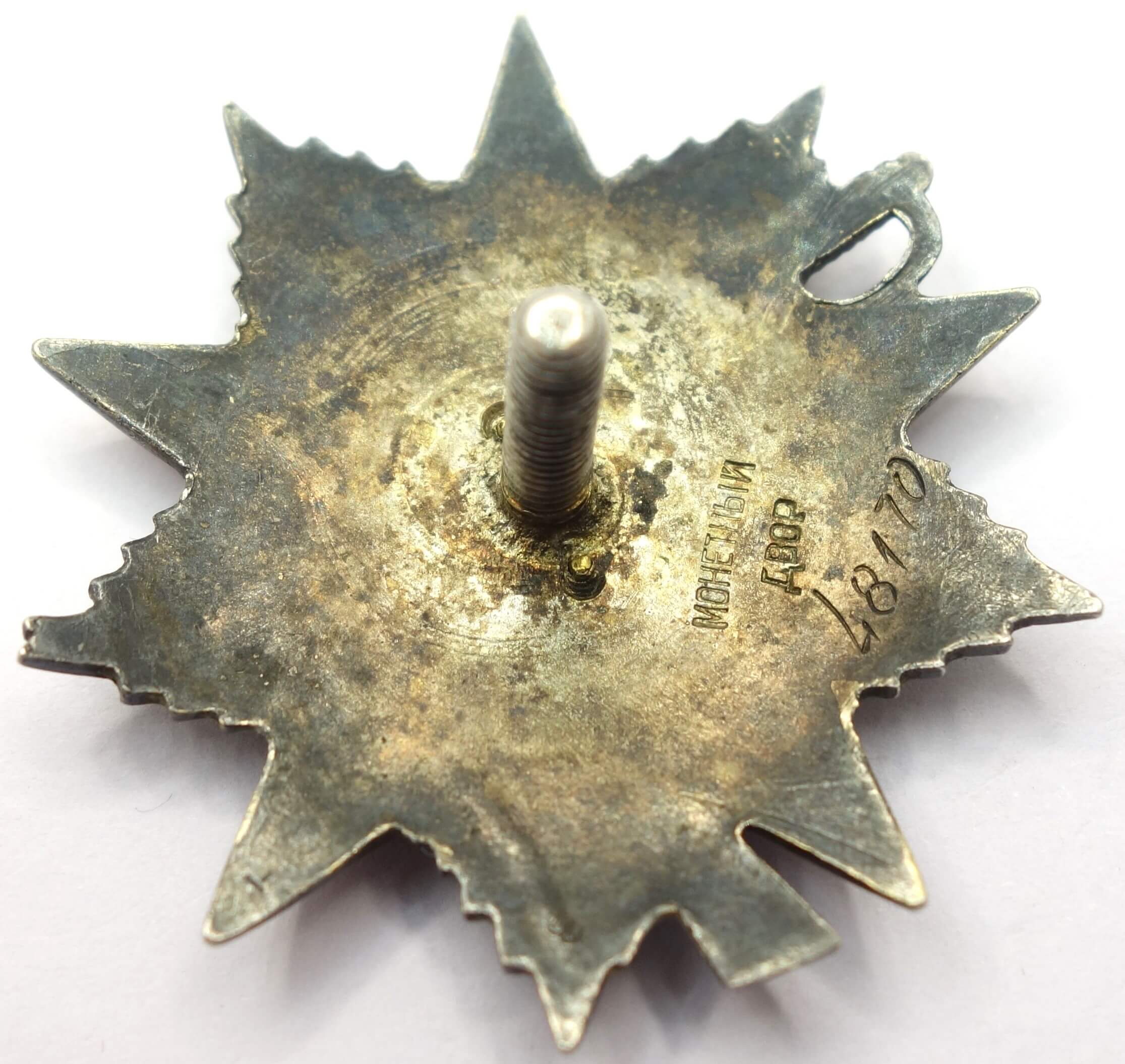 Made of solid silver, gold and enamels. The order weighs 24.3 grams without its screwplate and measures 44.91 mm in width and 47.05 mm in height.  This early screwback order is produced by the Krasnokamsky Mint (KMD). The minimum known serial number for this variation is 34787 and the maximum is 71998.