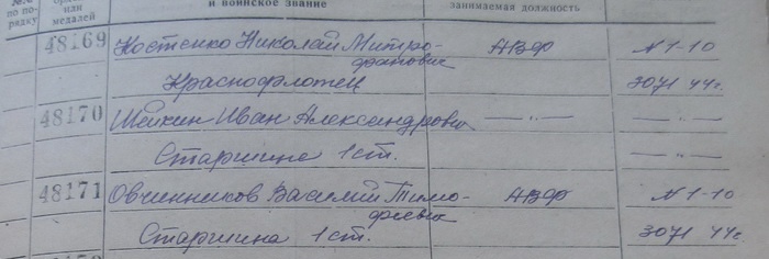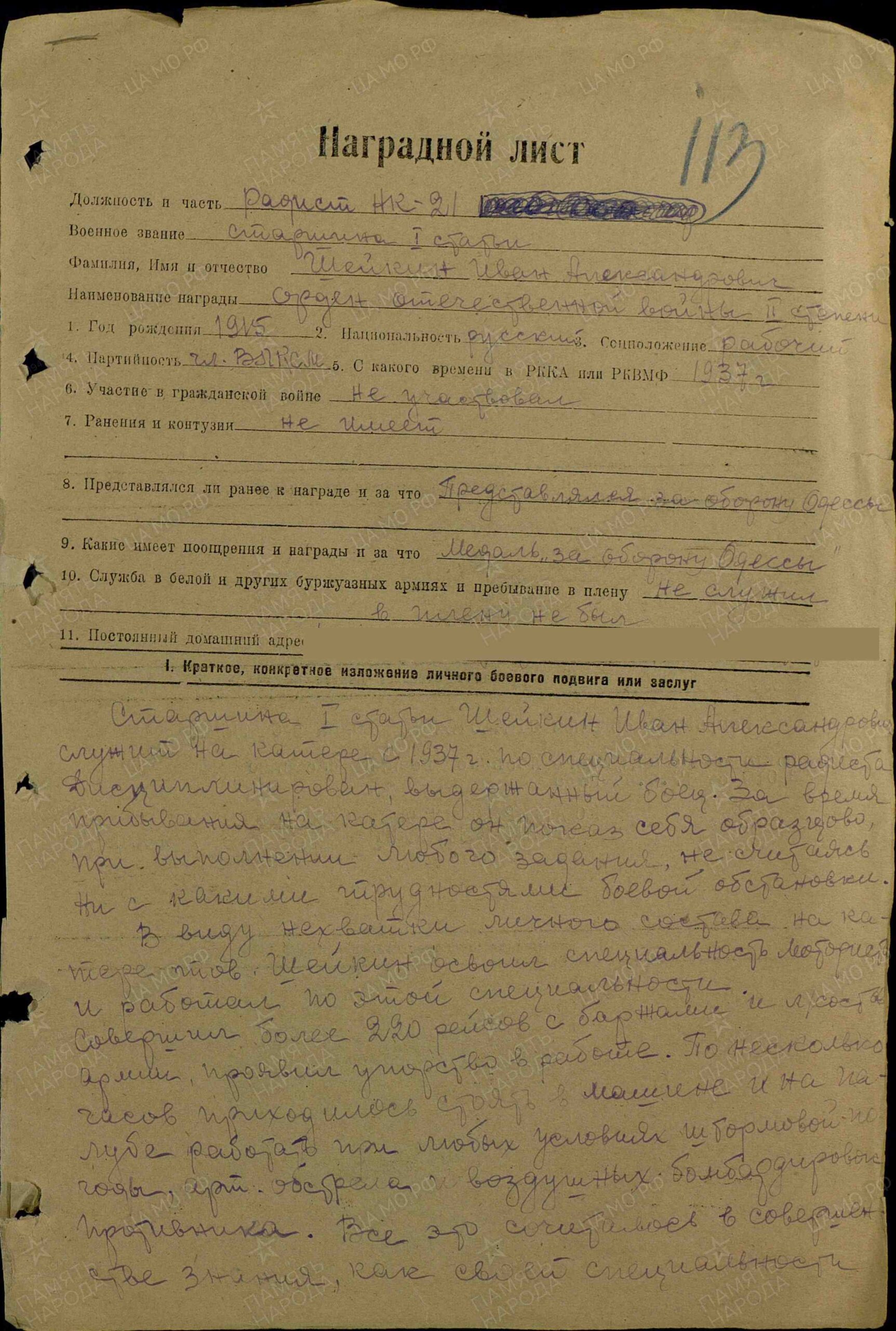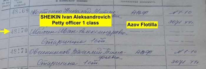 Awarded to Petty officer 1 class Ivan Aleksandrovich Sheikin (Иван Александрович Шейкин)