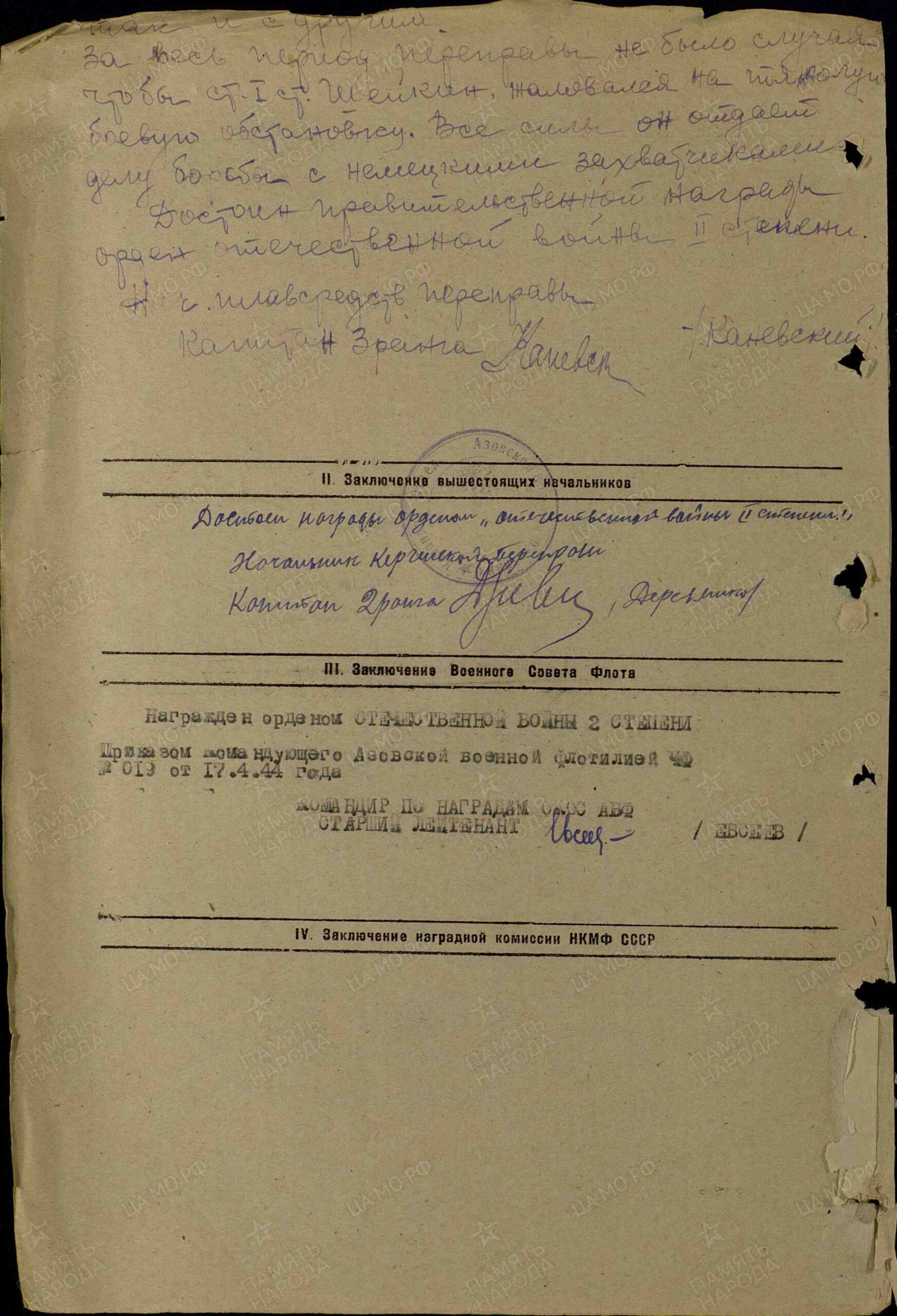 During the whole period of the crossing operations, there were no occurrences of Petty officer 1 class SHEIKIN complaining about severity of combat conditions. He dedicated all his energy to the cause of struggle against the German invaders.
