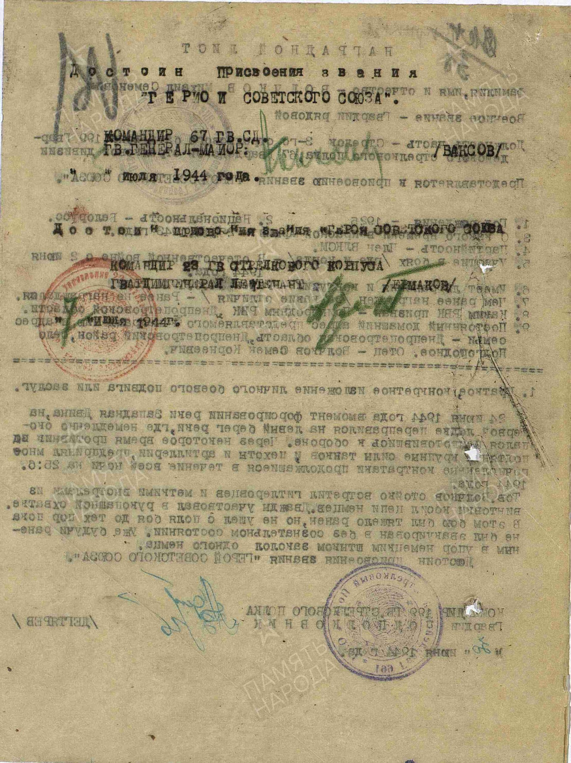For his heroic actions during the crossing of the Western Dvina in June 1944, where at 18/19 years old he repelled several enemy counterattacks, repeatedly engaged in hand-to-hand combat, and -already severely wounded- killed a German soldier at close quarters with his bayonet. Initially recommended for the title HERO OF THE SOVIET UNION