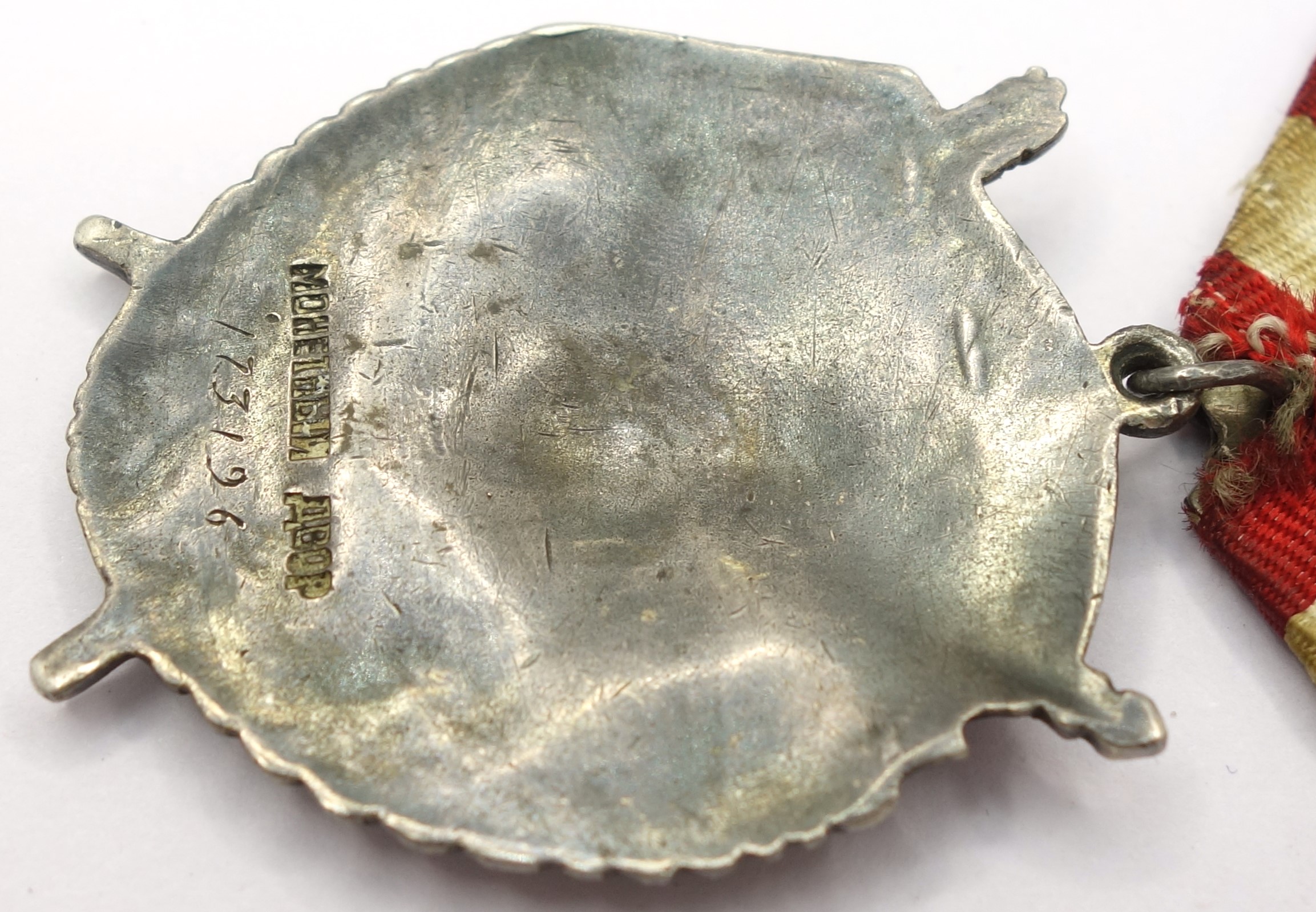 In good overall condition with light wear on the raised details such as the central wreath and torch. The red and white enamels are generally well preserved without repairs but show a chip on the 9 o’clock ray of the center star. Both sides display medium silver toning and its suspension ring remains uncut. The order comes with its time period double layer suspension and old ribbon.