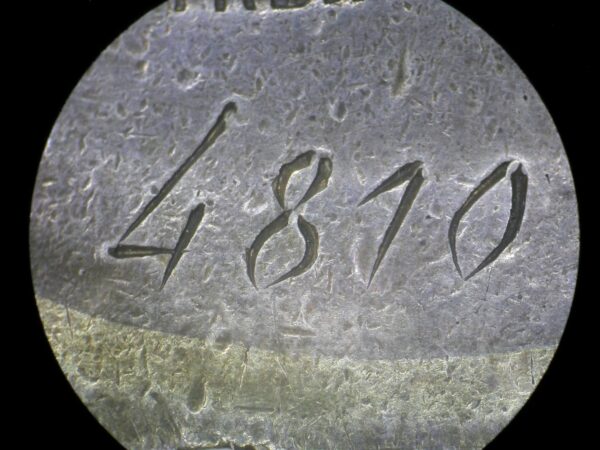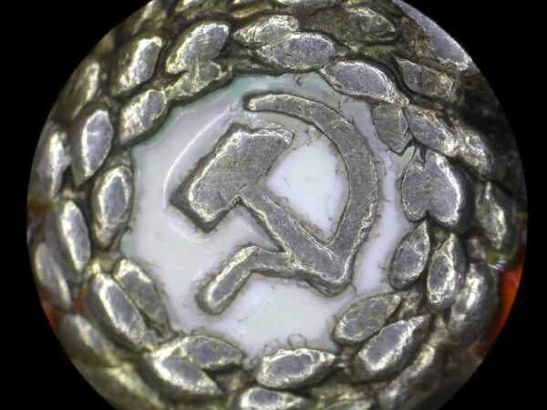 Made of silver and enamels, it measures 36.86 mm wide by 44.88 mm tall (including the eyelet) and weighs 22.3 grams without the suspension. The mint mark is located above the serial number in one straight line, with a maker’s mark “7” at the center.
