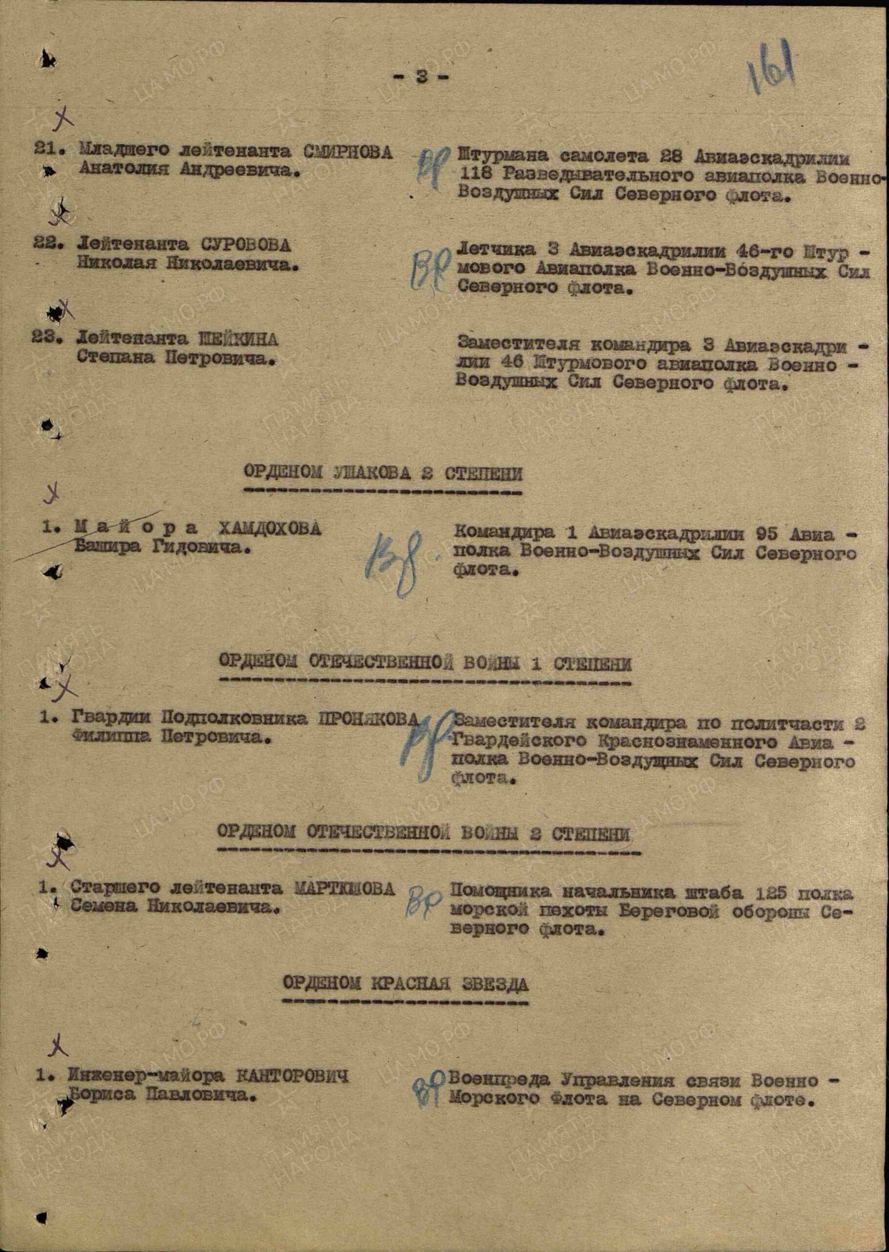 He has taken part in the Patriotic War since January 1942. For exemplary performance of 65 combat sorties, he was awarded two government awards. After his last awarding on 16.03.1944, he carried out 25 combat sorties on short-range reconnaissance and 4 combat sorties on long range reconnaissance of enemy ports and sea lanes in the northern and northwestern Finland and in Norway. During these combat reconnaissance sorties, the following were observed: