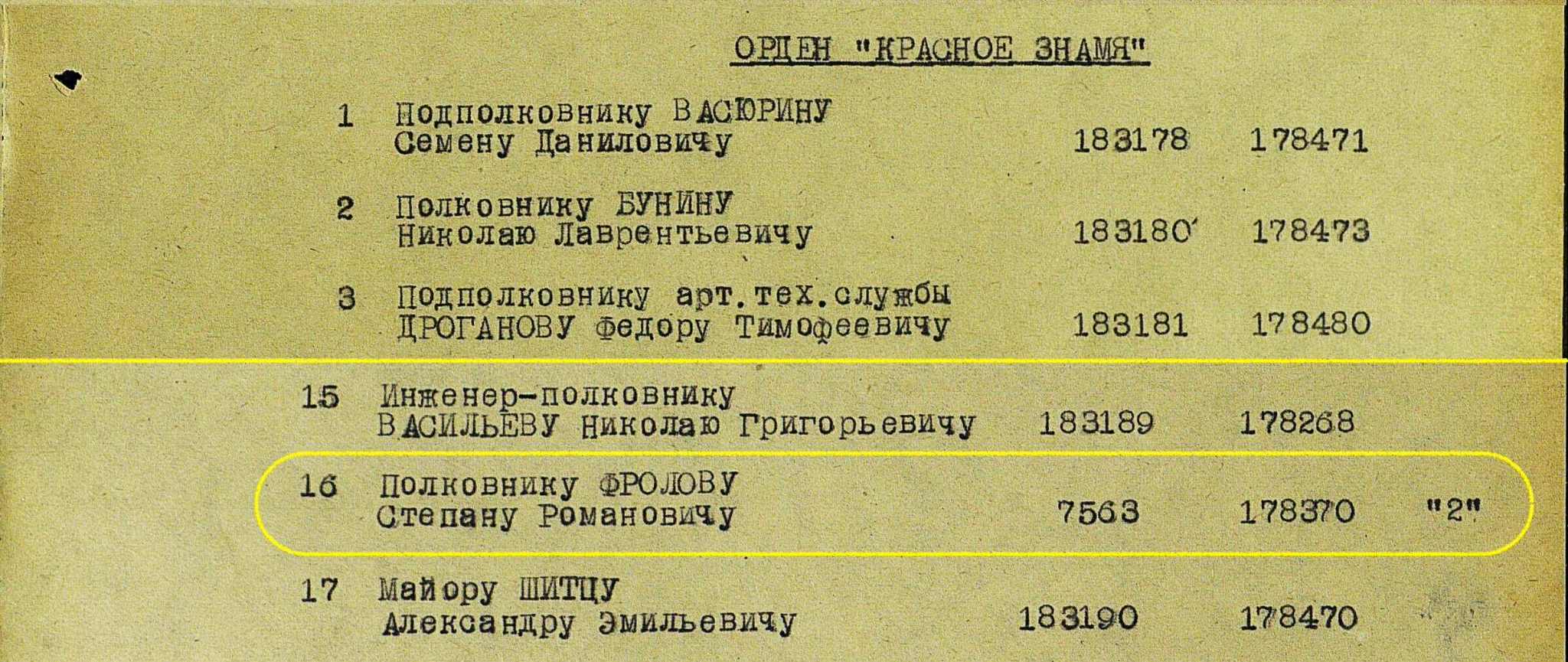 Awarded to Colonel Stepan Romanovich Frolov (Степан Романович Фролов)