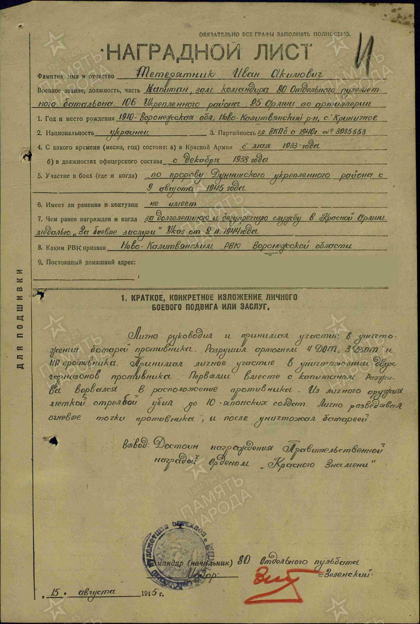 Major Tetryatnik distinguished himself on the Japanese front, killing 10 Japanese soldiers, for which he was awarded the Order of the Patriotic War 2nd Class