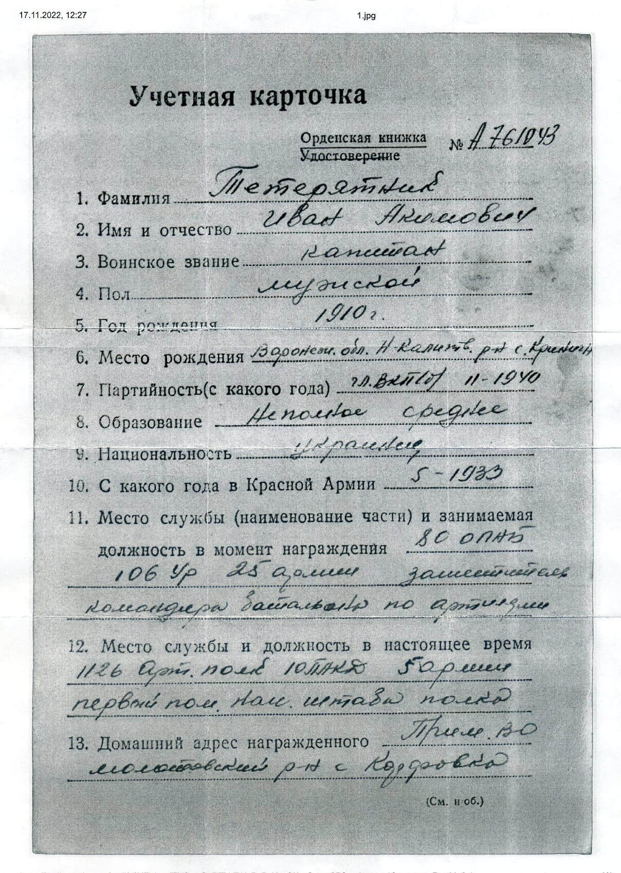 Awarded to Major Ivan Akimovich Tetryatnik (Иван Акимович Тетерятник)