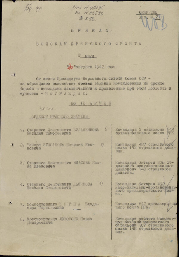 When our infantry withdrew from the village of Milyayevo on orders from unit command, comrade Vlasov’s battery provided covering fire for the withdrawal of our rifle units. Comrade Vlasov personally directed the artillery fire. During the ceaseless three-day fighting near the village of Minyayevo, and later near the village of Klyuchinki, the battery was subjected to aerial bombardment by dozens of enemy aircraft (60-70 aircraft), heavy artillery and mortar shelling, and rifle and machine-gun fire. Nevertheless the battery suffered only insignificant, single-digit losses. These successes in battle stem from the battery’s preparations during lulls at the front line, which were utilized to the fullest extent for intensive combat training programs and for preparing fortified firing positions and camouflaging them.