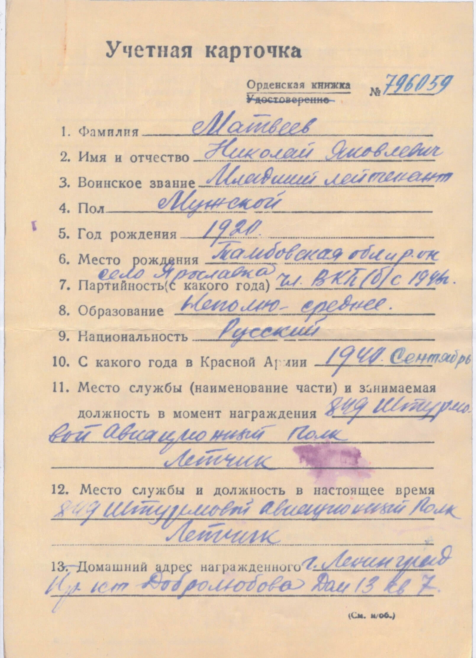 Awarded to Pilot in the 849th Ground-Attack Regiment, Jr. Lieutenant Nikolai Yakovlevich Matveyev (Николай Яковлевич Матвеев)