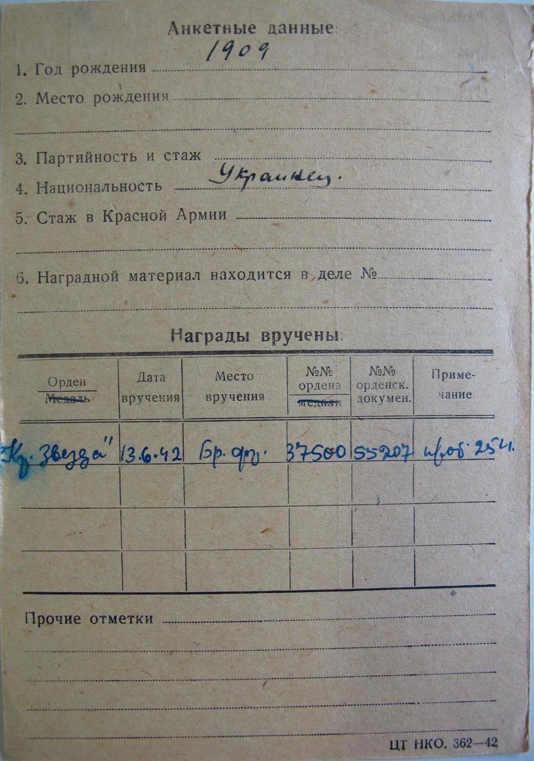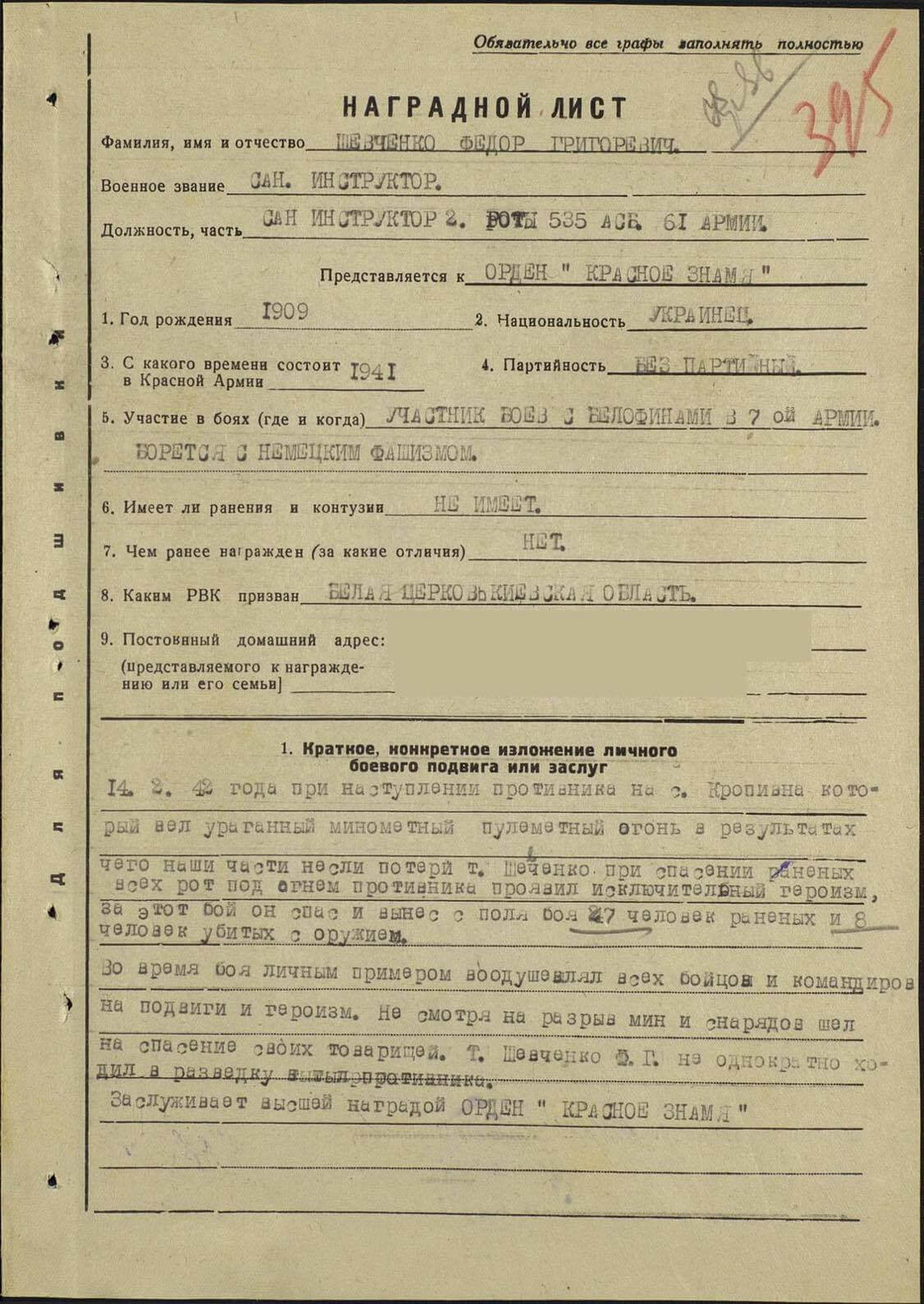 “During the enemy attack near the village Krapivna on 14 February 1942, the enemy delivered hurricane of mortar fire, which inflicted losses on our troops. Comrade SHEVCHENKO exhibited exceptional heroism in rescuing the wounded of the different companies from under the enemy fire. In this engagement, he rescued and evacuated from the battlefield: 27 wounded and 8 killed with their personal firearms.