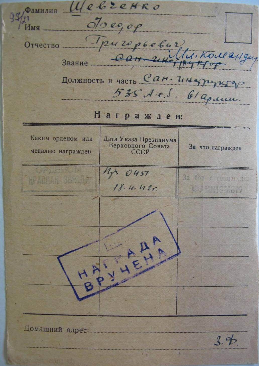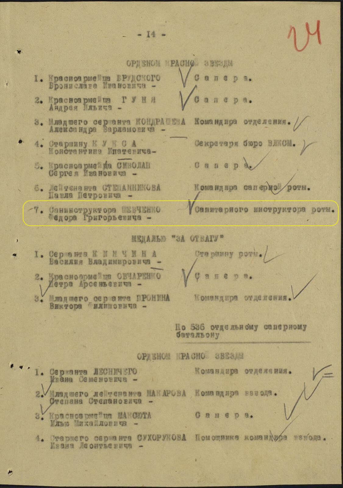 Awarded to Medical instructor Fedor Grigorievich Shevchenko (Федор Григорьевич Шевченко)