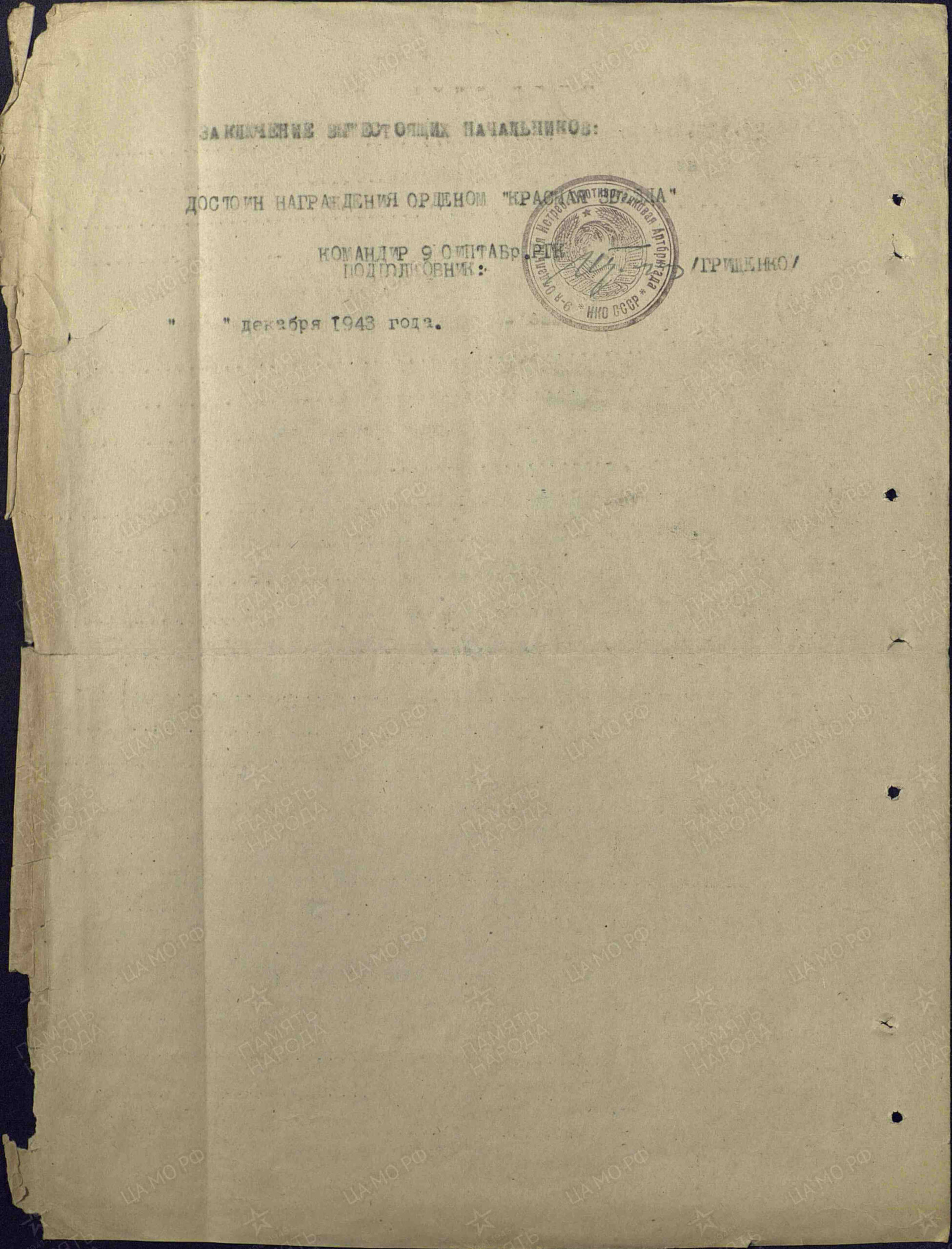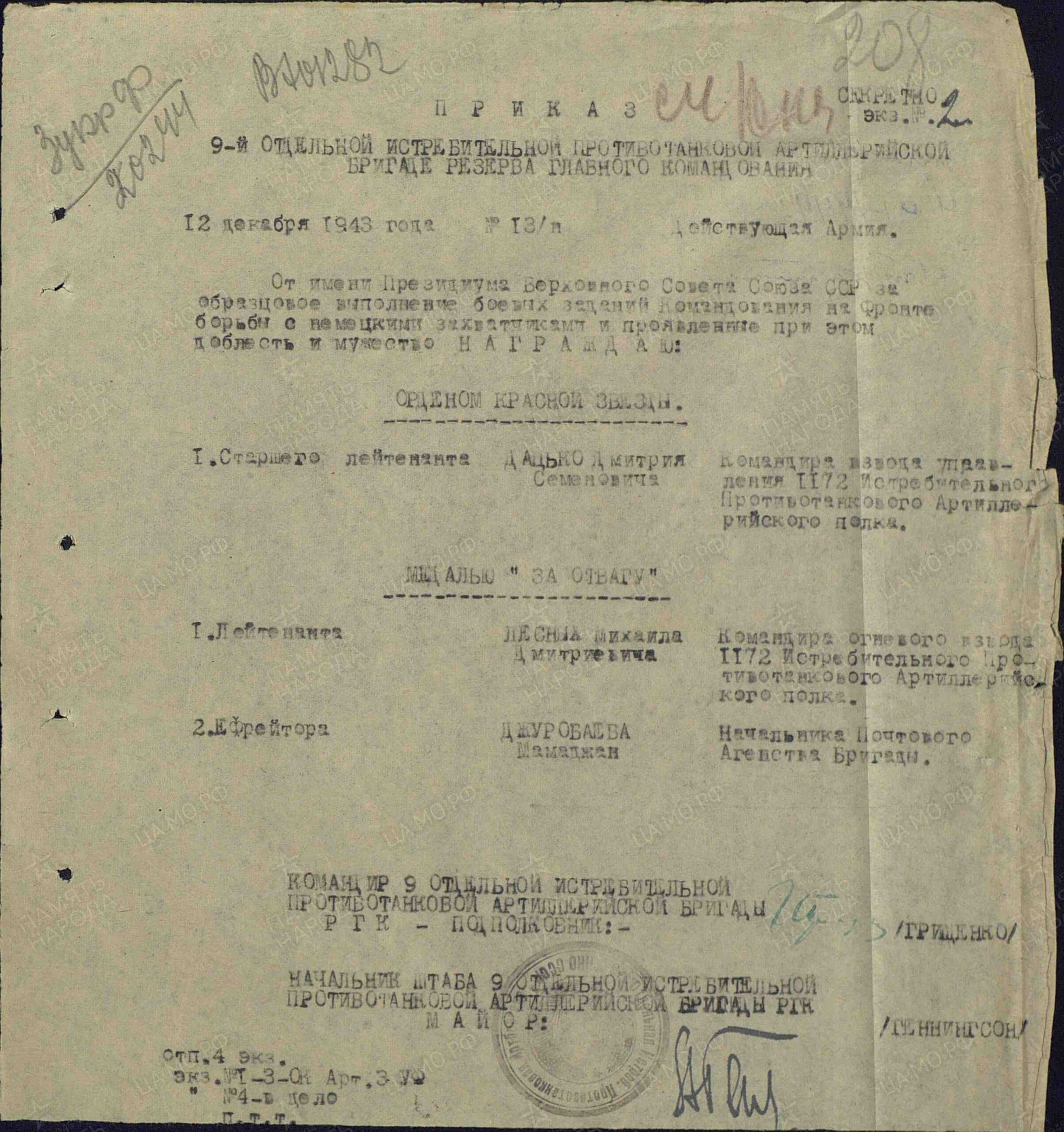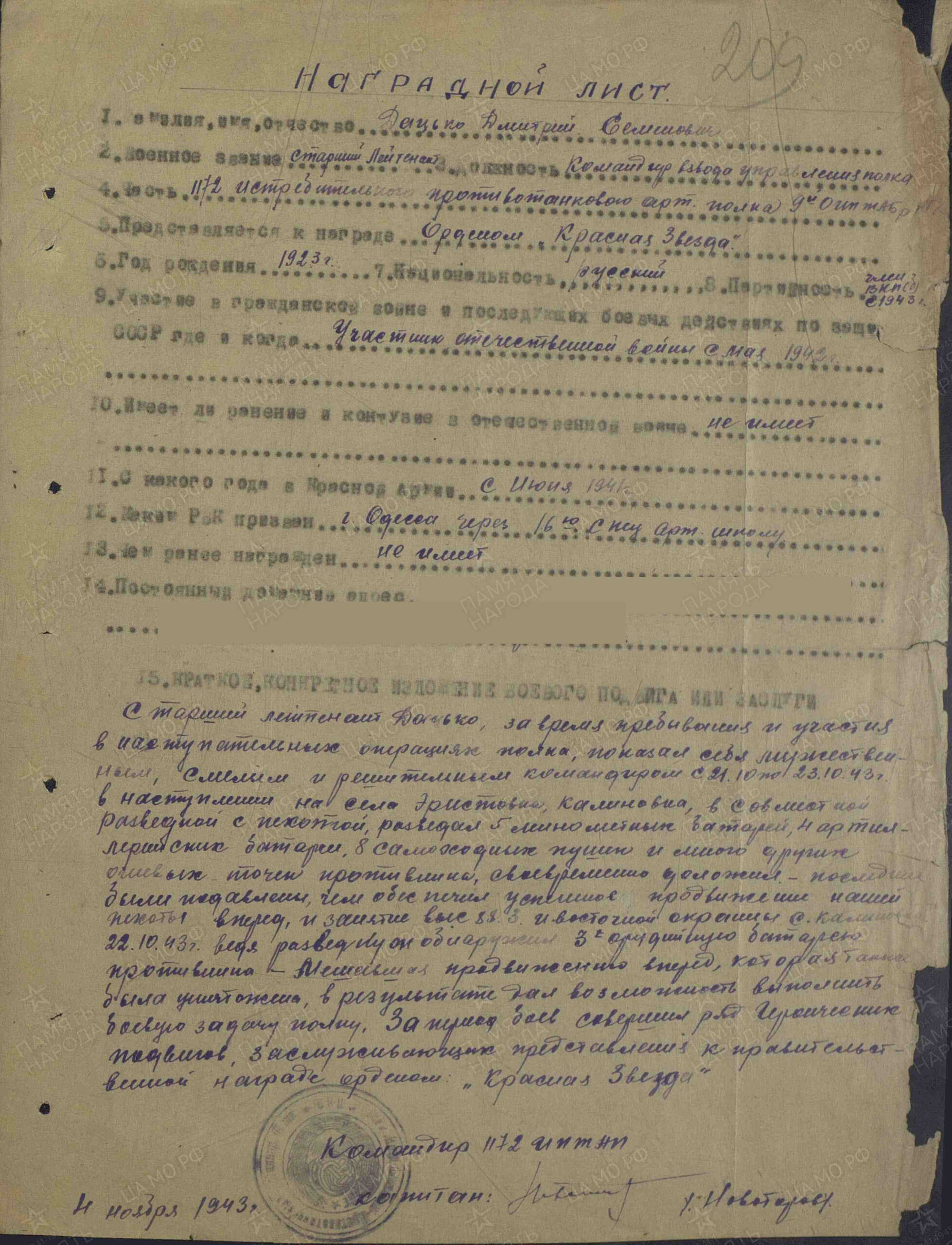 During his assignment and participation in the regiment’s offensive operations, Senior Lieutenant Datsko has proven himself a valorous, bold, and decisive commander from 21.10-23.10.1943 in an attack on the villages of Eristovka and Kalinovka. While in a combined reconnaissance with the infantry he discovered five enemy mortar batteries, four artillery batteries, eight self-propelled cannons, and many other firing positions, reporting them in a timely manner and resulting in their suppression, the subsequent advance of our infantry, and occupation of hill 88.3 and the eastern edge of the village of Kalinovka. On 22.10.1943 while conducting a reconnaissance he discovered the enemy third battery hindering our advance forward, which was also destroyed and as a result permitted the accomplishment of the regiment’s combat mission. During the fighting, he achievement a series of heroic accomplishments, deserves the State award, the “Order of the Red Star”.