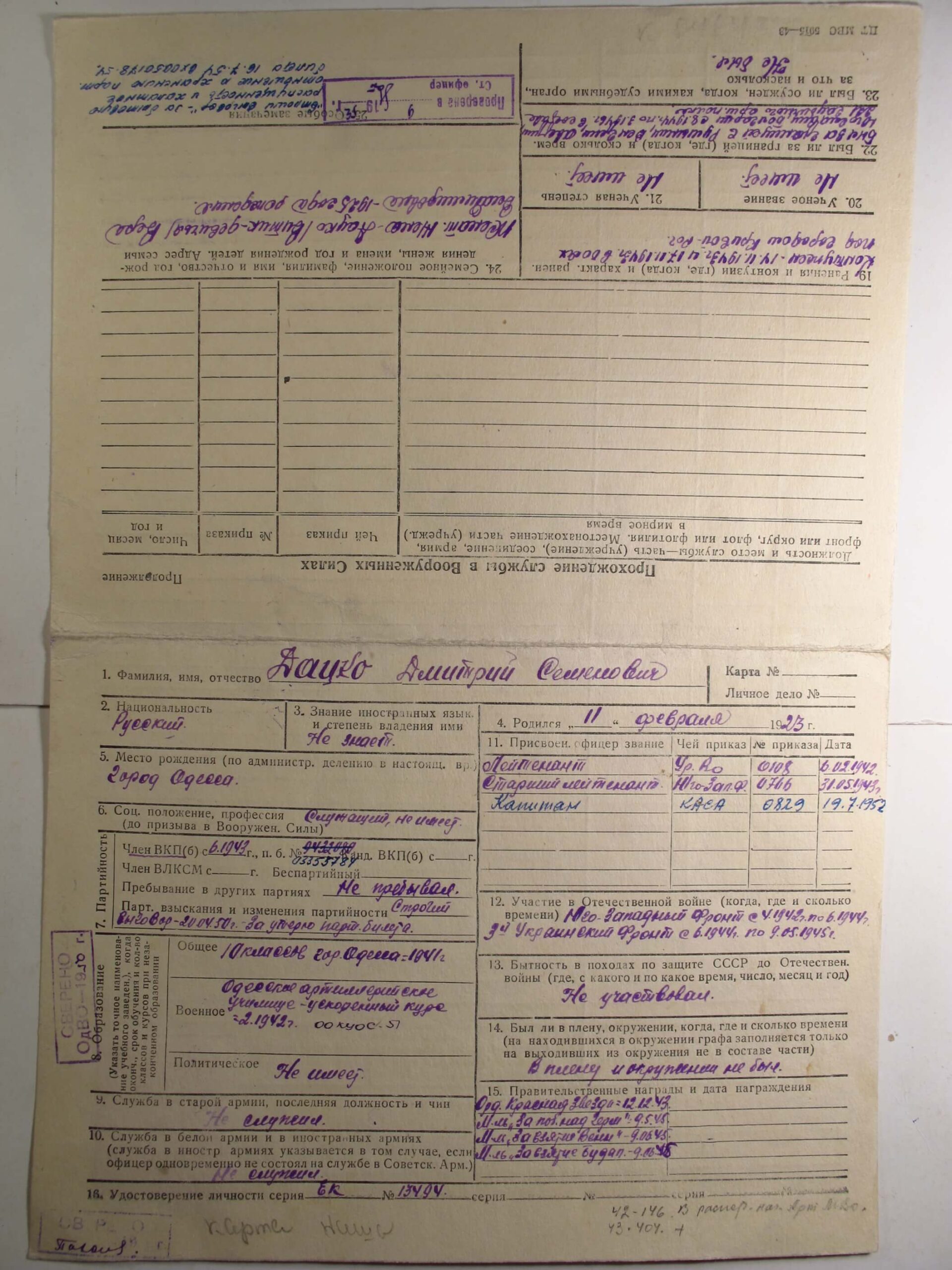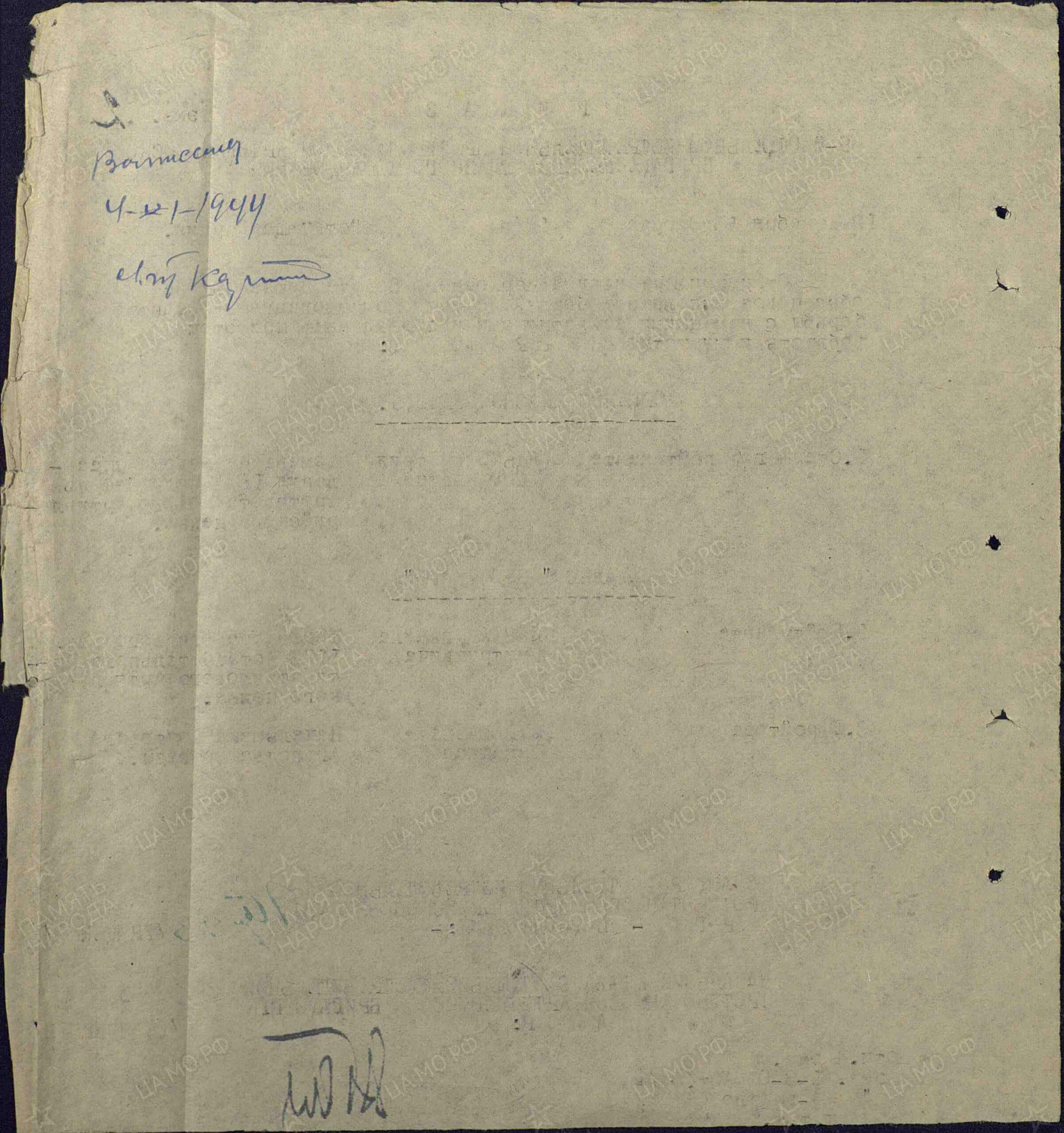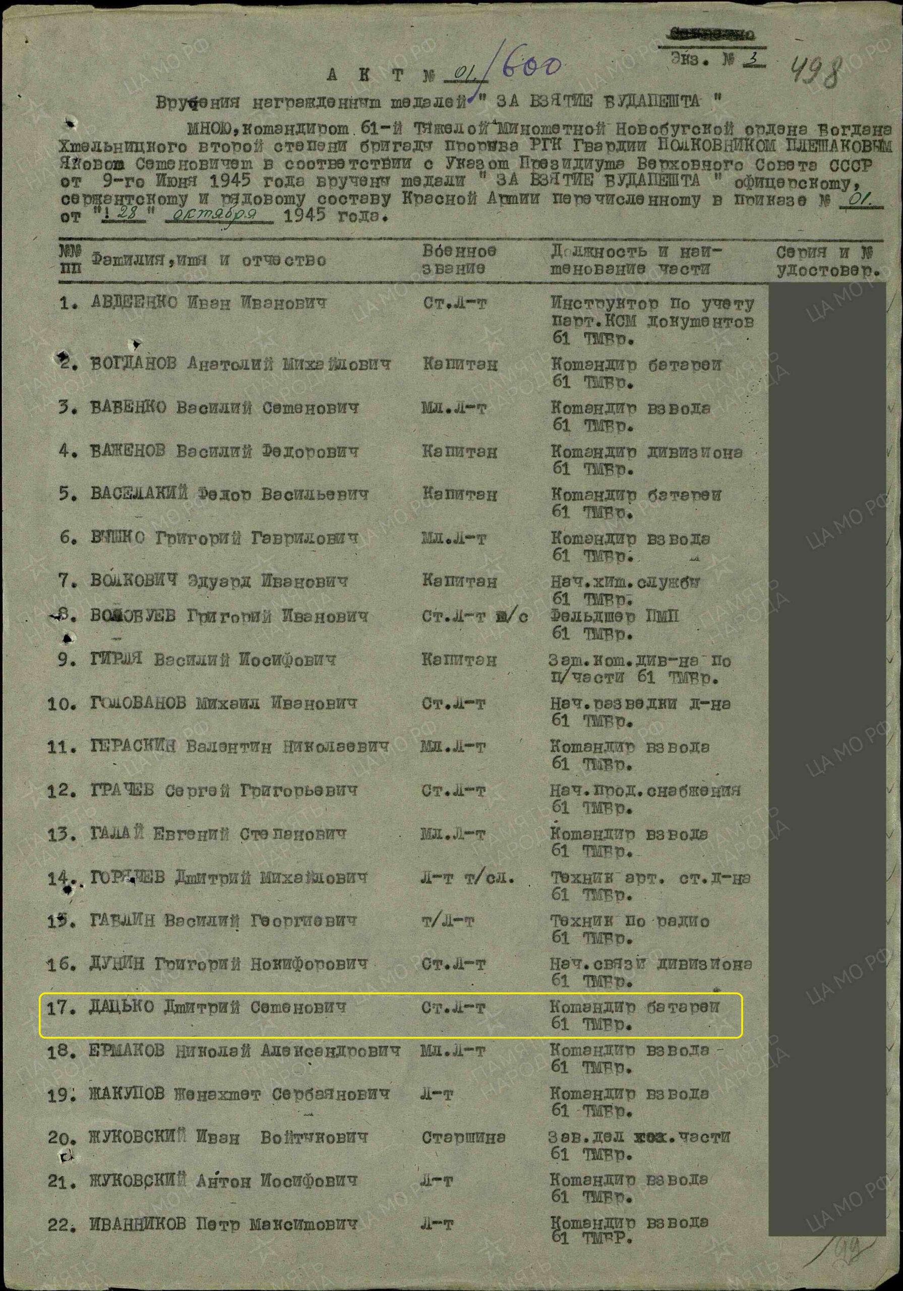 During his assignment and participation in the regiment’s offensive operations, Senior Lieutenant Datsko has proven himself a valorous, bold, and decisive commander from 21.10-23.10.1943 in an attack on the villages of Eristovka and Kalinovka. While in a combined reconnaissance with the infantry he discovered five enemy mortar batteries, four artillery batteries, eight self-propelled cannons, and many other firing positions, reporting them in a timely manner and resulting in their suppression, the subsequent advance of our infantry, and occupation of hill 88.3 and the eastern edge of the village of Kalinovka. On 22.10.1943 while conducting a reconnaissance he discovered the enemy third battery hindering our advance forward, which was also destroyed and as a result permitted the accomplishment of the regiment’s combat mission. During the fighting, he achievement a series of heroic accomplishments, deserves the State award, the “Order of the Red Star”.