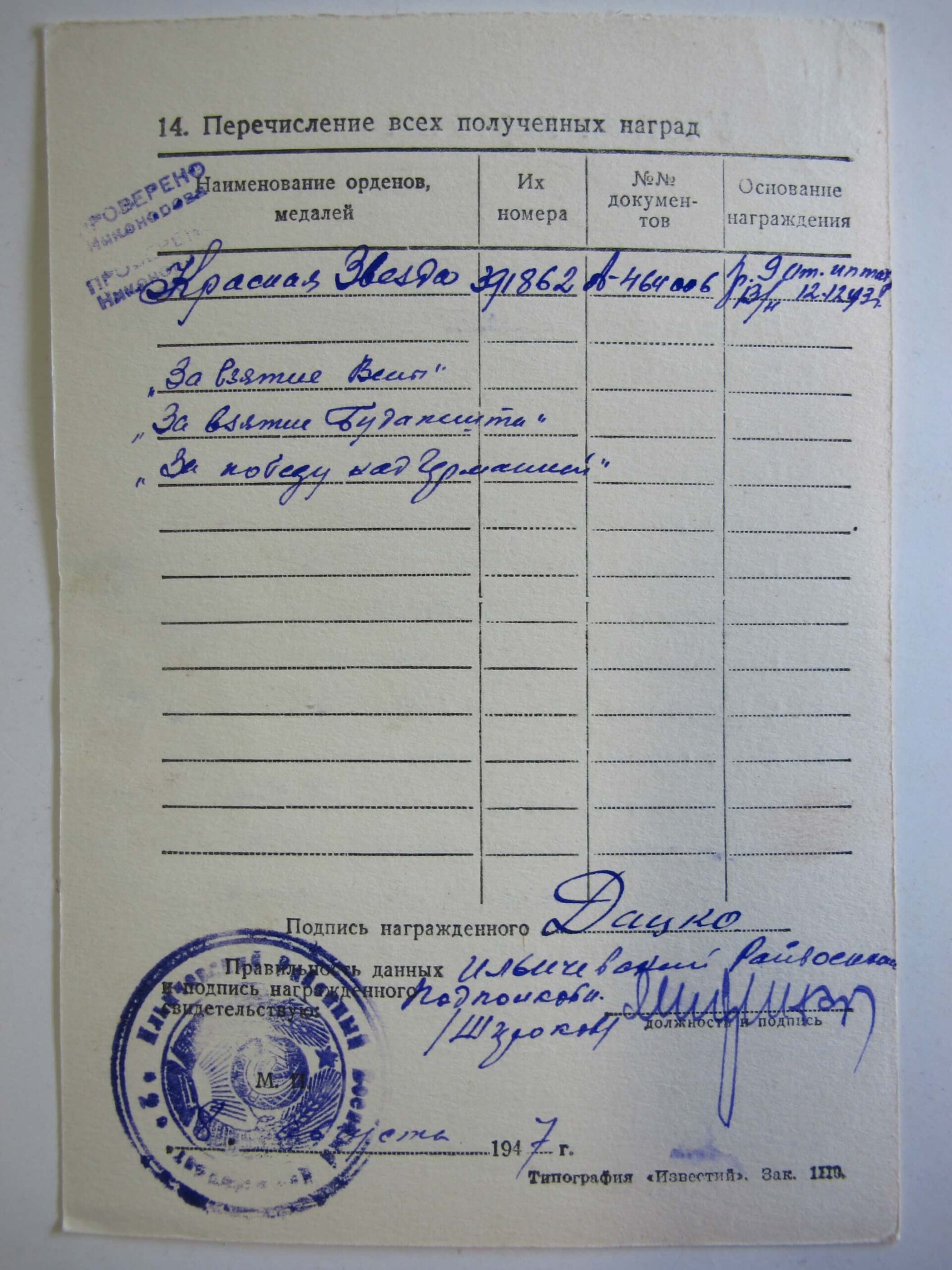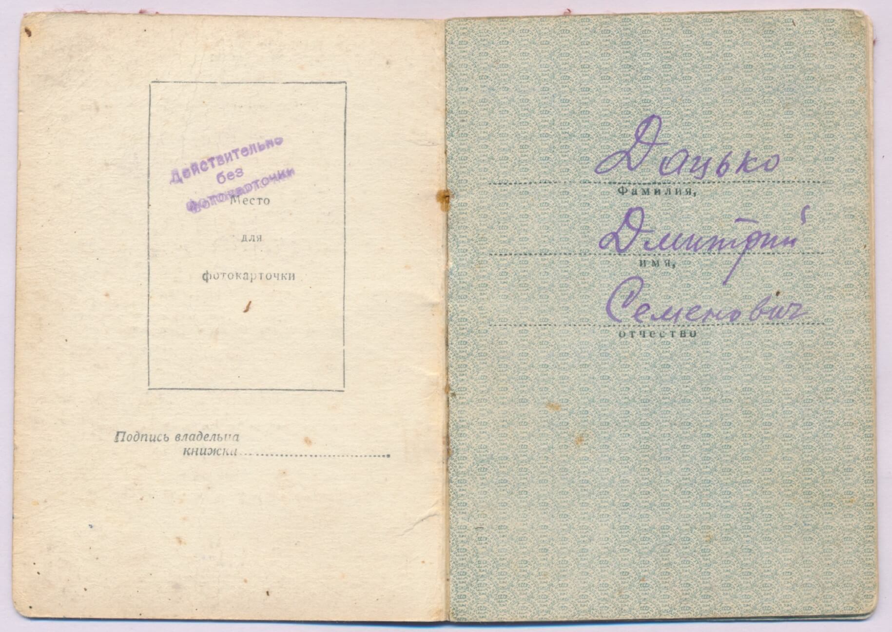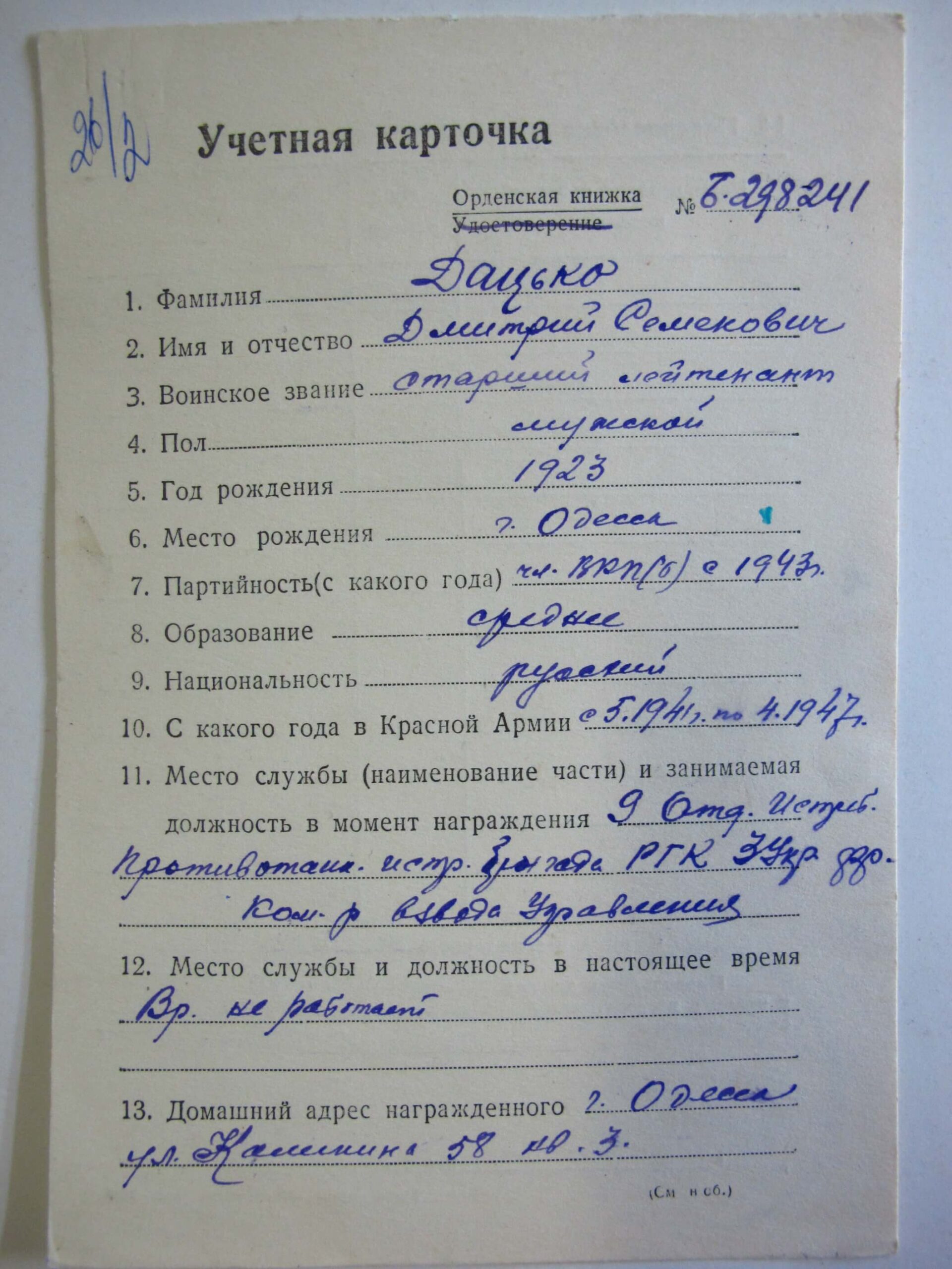 Awarded to Sr. Lieutenant Dmitriy Semyonovich Datsko (Дмитрий Семенович Дацько)