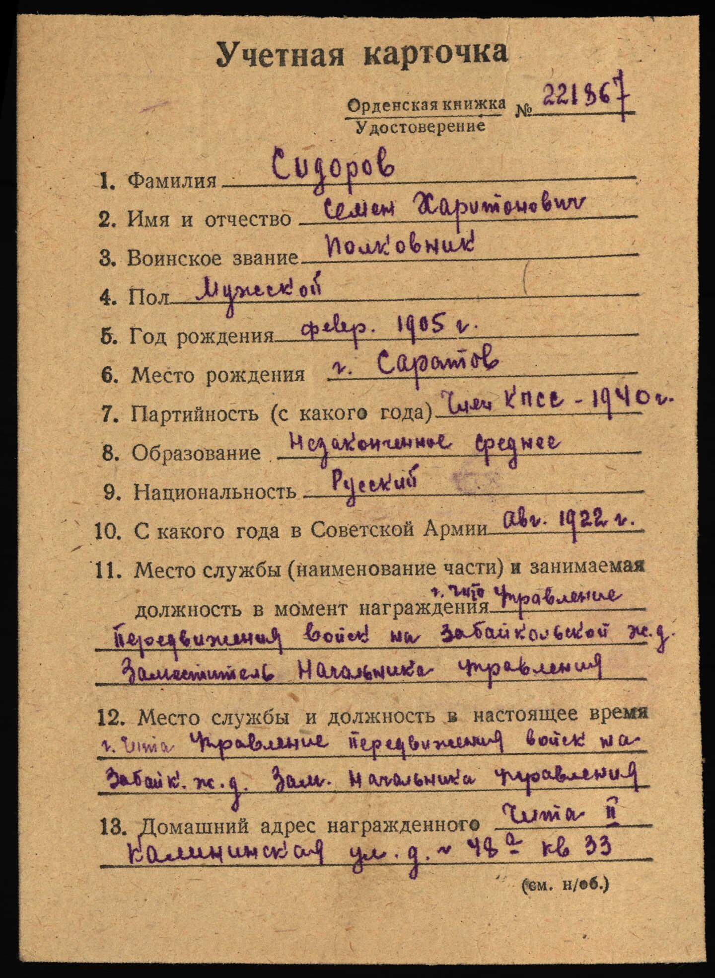 Awarded to Colonel Semyon Kharitonovich Sidorov (Семен Харитонович Сидоров)