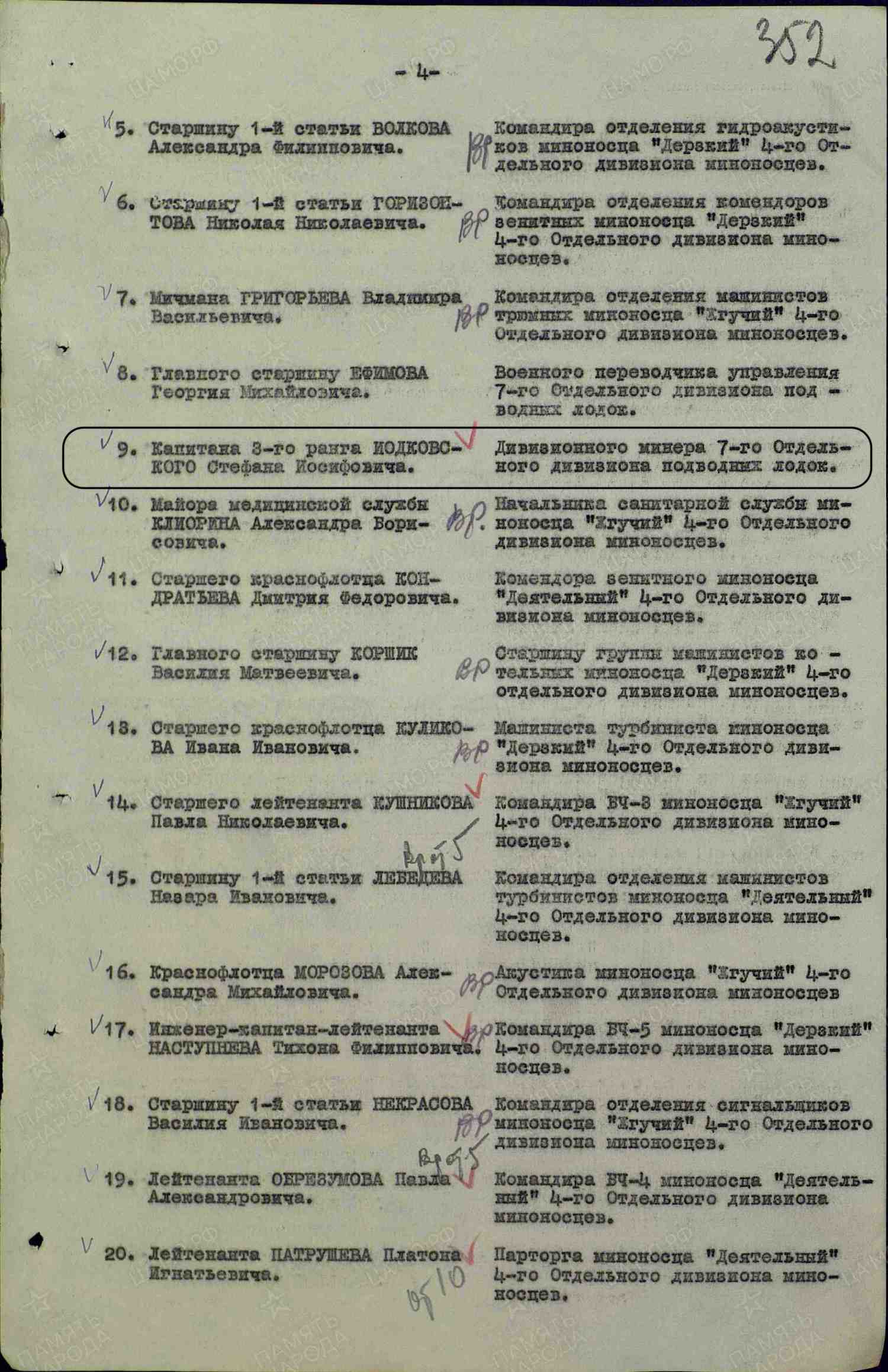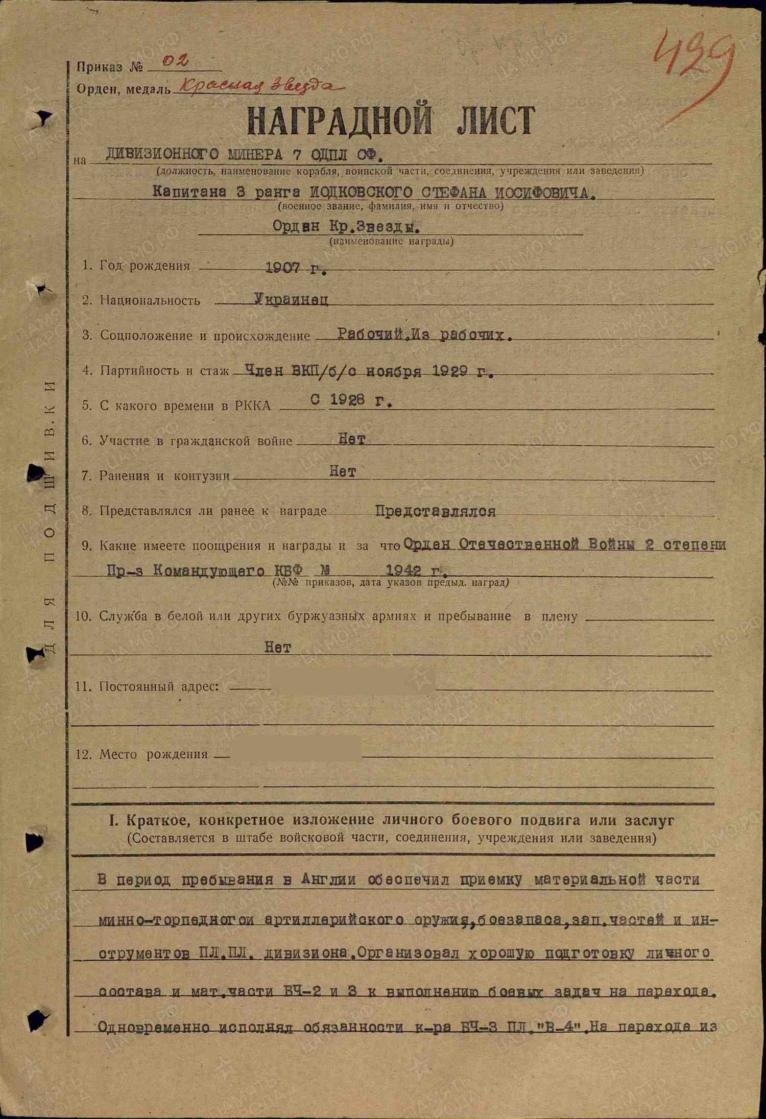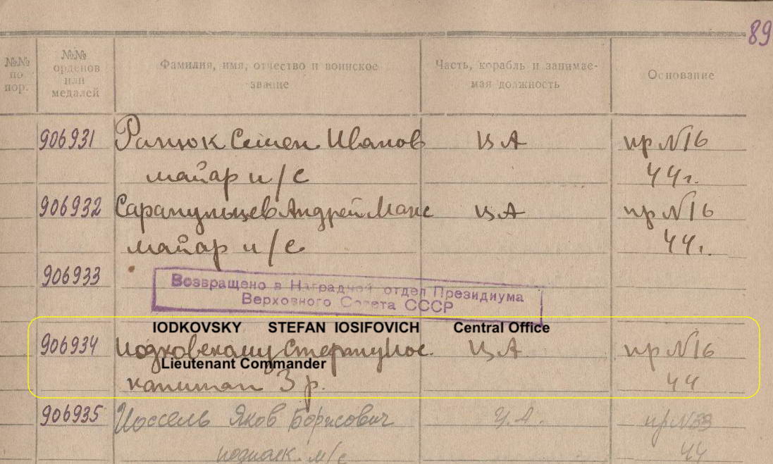 Awarded to Lt. Commander Stefan Iosifovich Iodkovsky (Стефан Иосифович Иодковский)
