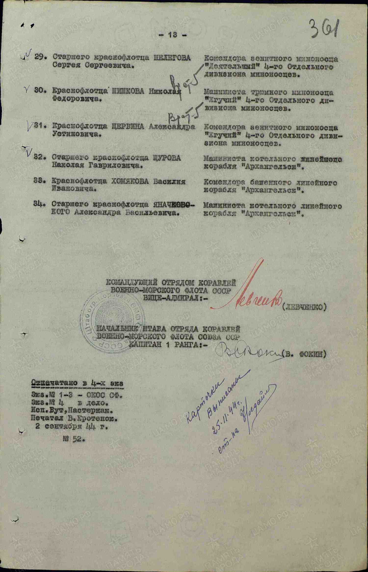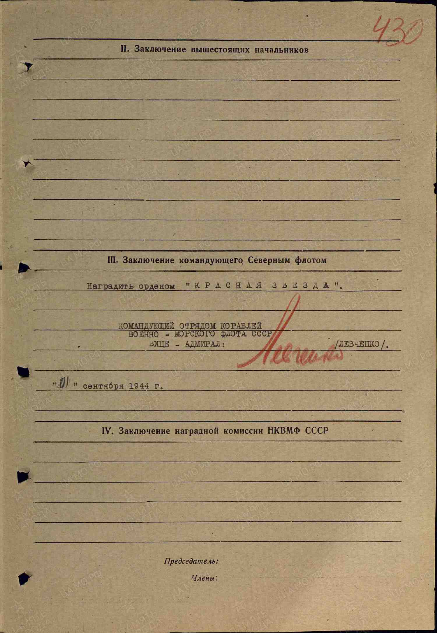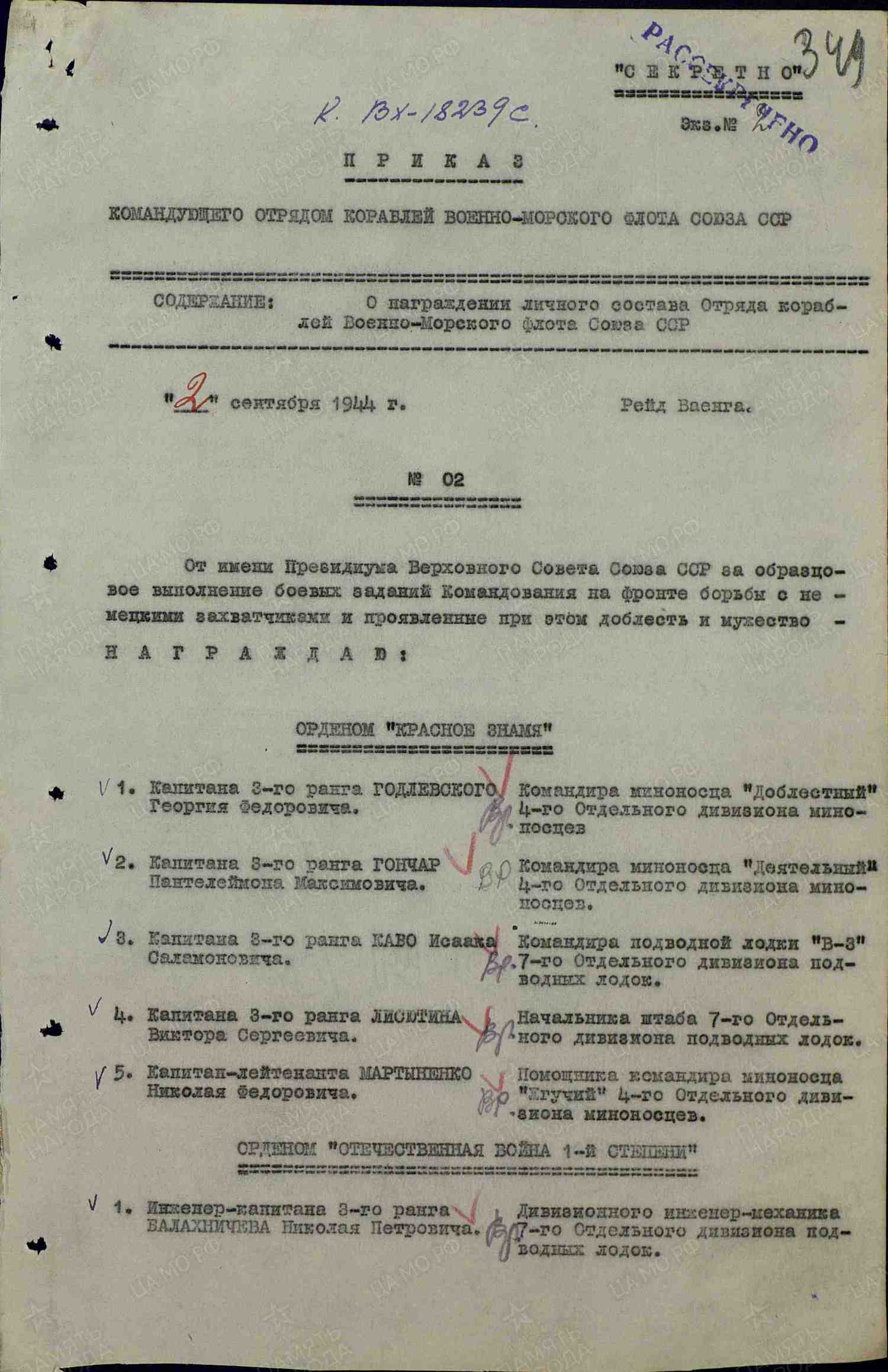 During his assignment in England, he oversaw the acceptance of the military materiel for the submarine squadron: mines, torpedoes, artillery, ammunition, spare parts, and instruments for the submarine operations. He organised efficient personnel training and the equipment prepping of the artillery (BS-2) and mine-torpedo (BS-3) battle stations and prepared them for the home tour. Simultaneously, he was performing the commander duties of the minetorpedo (BS-3) and the signals (BS-4) battle stations. During the home tour from England to the Soviet Union, he was executing he duties of the watch commander on the submarine “В-2”, where he exhibited examples of diligent service and was an examples to the rest of the crew.