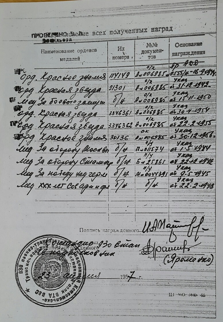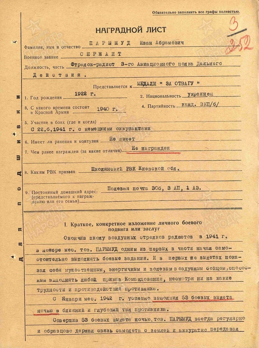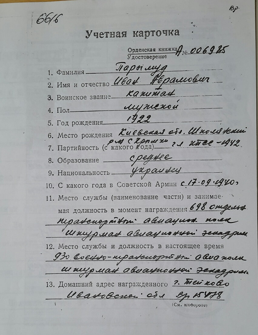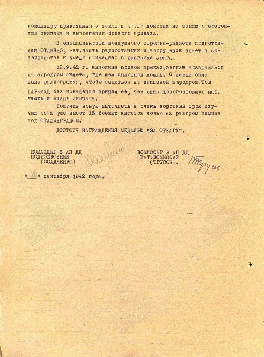 Having made 53 sorties at night, comrade PARYMUD always regularly and exemplarily kept the aircraft in touch with the ground and accurately conveyed orders to the commander from the ground and clearly reported to the ground about the state of the crew and the execution of the combat order.