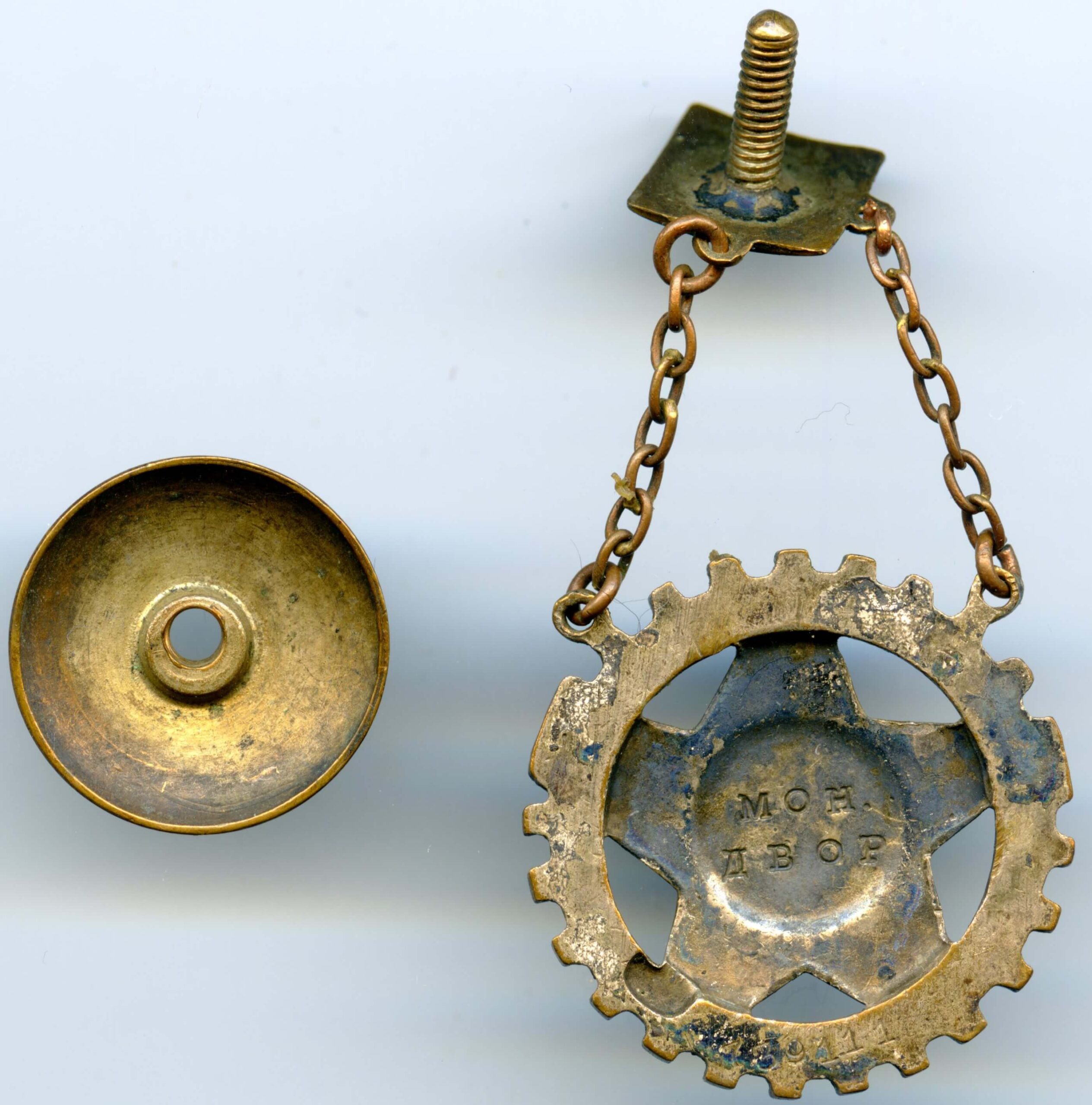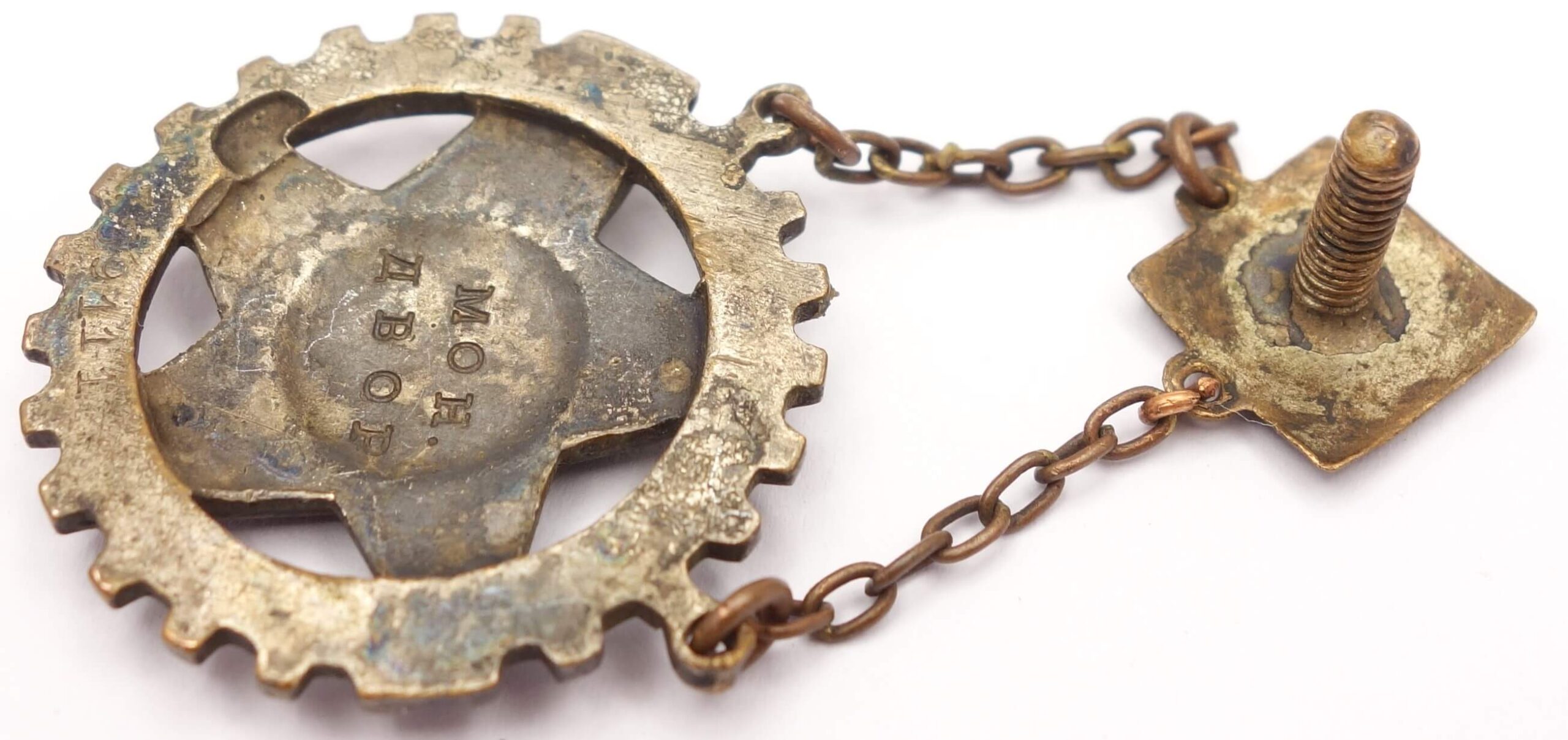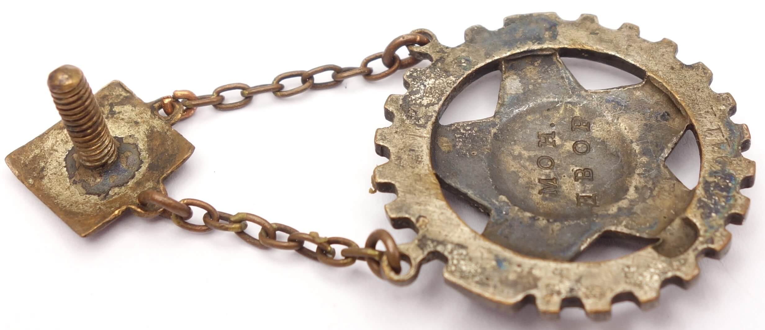 The badge is in good, about average condition. Its enamels are mostly present and without repairs but show some chipping on its suspension. The details are well preserved and the chain and suspension are original to the badge. This variation is produced without a stickpin and its comes a well fitted screwplate.