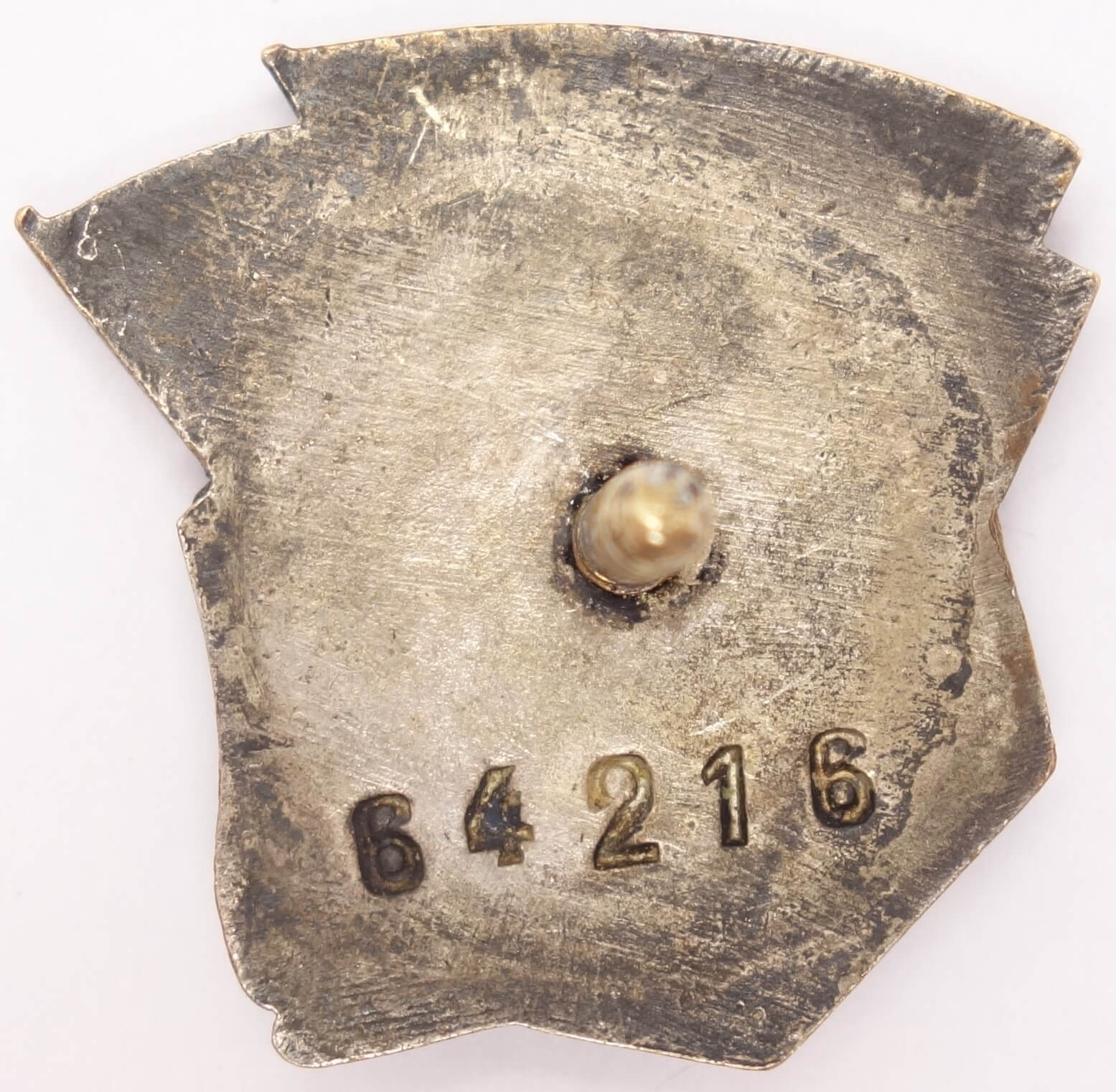 Made of silver plated brass and enamels. Measures 33.1 mm in height, 32.7 mm in width (at the top of the badge) and weighs 13.7 grams without its screwplate.